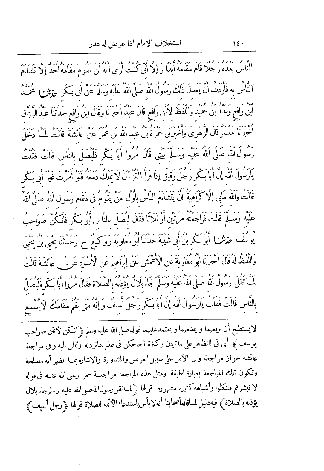 لَا يَسْتَطِيعُ أَنْ يَرْفَعَهُمَا وَيَضَعَهُمَا وَيَعْتَمِدَ عَلَيْهِمَا قَوْلُهُ صَلَّى اللَّهُ عَلَيْهِ وَسَلَّمَ (إِنَّكُنَّ لَأَنْتُنَّ صَوَاحِبُ يُوسُفَ) أَيْ فِي التَّظَاهُرِ عَلَى مَا تُرِدْنَ وَكَثْرَةِ إِلْحَاحِكُنَّ فِي طَلَبِ مَا تُرِدْنَهُ وَتَمِلْنَ إِلَيْهِ وَفِي مُرَاجَعَةِ عَائِشَةَ جَوَازِ مُرَاجَعَةِ وَلِيِّ الْأَمْرِ عَلَى سَبِيلِ الْعَرْضِ وَالْمُشَاوَرَةِ وَالْإِشَارَةِ بِمَا يَظْهَرُ أَنَّهُ مَصْلَحَةٌ وَتَكُونُ تِلْكَ الْمُرَاجَعَةُ بِعِبَارَةٍ لَطِيفَةٍ وَمِثْلُ هَذِهِ الْمُرَاجَعَةِ مُرَاجَعَةُ عُمَرَ رَضِيَ اللَّهُ عَنْهُ فِي قَوْلِهِ لَا تُبَشِّرْهُمْ فَيَتَّكِلُوا وَأَشْبَاهُهُ كَثِيرَةٌ مَشْهُورَةٌ قَوْلُهَا (لَمَّا ثَقُلَ رَسُولُ اللَّهِ صَلَّى اللَّهُ عَلَيْهِ وَسَلَّمَ جَاءَ بِلَالٌ يُؤْذِنُهُ بِالصَّلَاةِ) فِيهِ دَلِيلٌ لِمَا قَالَهُ أَصْحَابُنَا أَنَّهُ لَا بَأْسَ بِاسْتِدْعَاءِ الْأَئِمَّةِ لِلصَّلَاةِ قَوْلُهَا (رَجُلٌ أَسِيفٌ