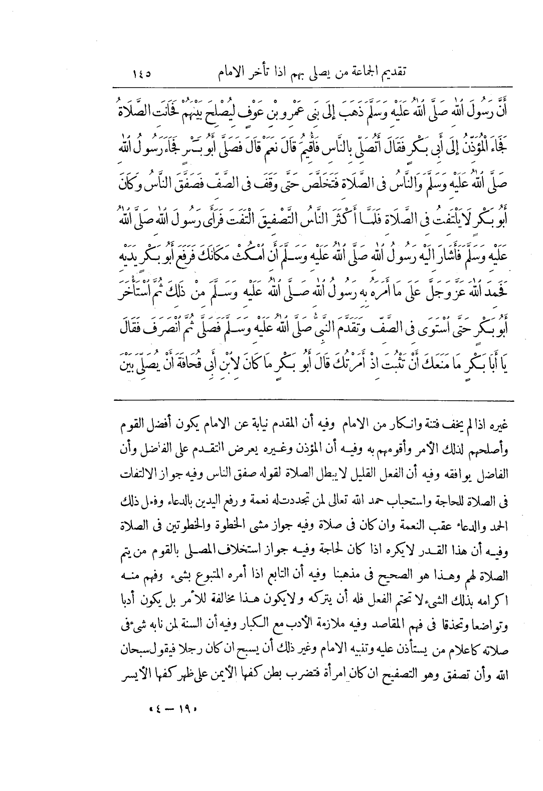 غيره إذا لم يخف فتنة وإنكار مِنَ الْإِمَامِ وَفِيهِ أَنَّ الْمُقَدَّمَ نِيَابَةً عَنِ الْإِمَامِ يَكُونُ أَفْضَلَ الْقَوْمِ وَأَصْلَحَهُمْ لِذَلِكَ الْأَمْرِ وَأَقْوَمَهُمْ بِهِ وَفِيهِ أَنَّ الْمُؤَذِّنَ وَغَيْرَهُ يَعْرِضُ التقدم على الفاضل وأن الفاضل يوافقه وفيه أَنَّ الْفِعْلَ الْقَلِيلَ لَا يُبْطِلُ الصَّلَاةَ لِقَوْلِهِ صَفَّقَ النَّاسُ وَفِيهِ جَوَازُ الِالْتِفَاتِ فِي الصَّلَاةِ لِلْحَاجَةِ وَاسْتِحْبَابُ حَمْدِ اللَّهِ تَعَالَى لِمَنْ تَجَدَّدَتْ لَهُ نِعْمَةٌ وَرَفْعُ الْيَدَيْنِ بِالدُّعَاءِ وَفِعْلُ ذَلِكَ الْحَمْدِ وَالدُّعَاءُ عَقِبَ النِّعْمَةِ وَإِنْ كَانَ فِي صَلَاةٍ وَفِيهِ جَوَازُ مَشْيِ الْخُطْوَةِ وَالْخُطْوَتَيْنِ فِي الصلاة وفيه أن هذا الْقَدْرَ لَا يُكْرَهُ إِذَا كَانَ لِحَاجَةٍ وَفِيهِ جَوَازُ اسْتِخْلَافِ الْمُصَلِّي بِالْقَوْمِ مَنْ يُتِمُّ الصَّلَاةَ لَهُمْ وَهَذَا هُوَ الصَّحِيحُ فِي مَذْهَبِنَا وَفِيهِ أَنَّ التَّابِعَ إِذَا أَمَرَهُ الْمَتْبُوعُ بِشَيْءٍ وَفَهِمَ مِنْهُ إِكْرَامَهُ بِذَلِكَ الشَّيْءِ لَا تَحَتُّمُ الْفِعْلُ فَلَهُ أَنْ يَتْرُكَهُ وَلَا يَكُونُ هَذَا مُخَالَفَةً لِلْأَمْرِ بَلْ يَكُونُ أَدَبًا وَتَوَاضُعًا وَتَحَذُّقًا فِي فَهْمِ الْمَقَاصِدِ وَفِيهِ مُلَازَمَةُ الْأَدَبِ مَعَ الْكِبَارِ وَفِيهِ أَنَّ السُّنَّةَ لِمَنْ نَابَهُ شَيْءٌ فِي صَلَاتِهِ كَإِعْلَامِ مَنْ يَسْتَأْذِنُ عَلَيْهِ وَتَنْبِيهِ الْإِمَامِ وَغَيْرِ ذَلِكَ أَنْ يُسَبِّحَ إِنْ كَانَ رَجُلًا فَيَقُولُ سُبْحَانَ اللَّهِ وَأَنْ تُصَفِّقَ وَهُوَ التَّصْفِيحُ إِنْ كَانَ امْرَأَةً فَتَضْرِبُ بَطْنَ كَفِّهَا الْأَيْمَنِ عَلَى ظَهْرِ كَفِّهَا الْأَيْسَرِ