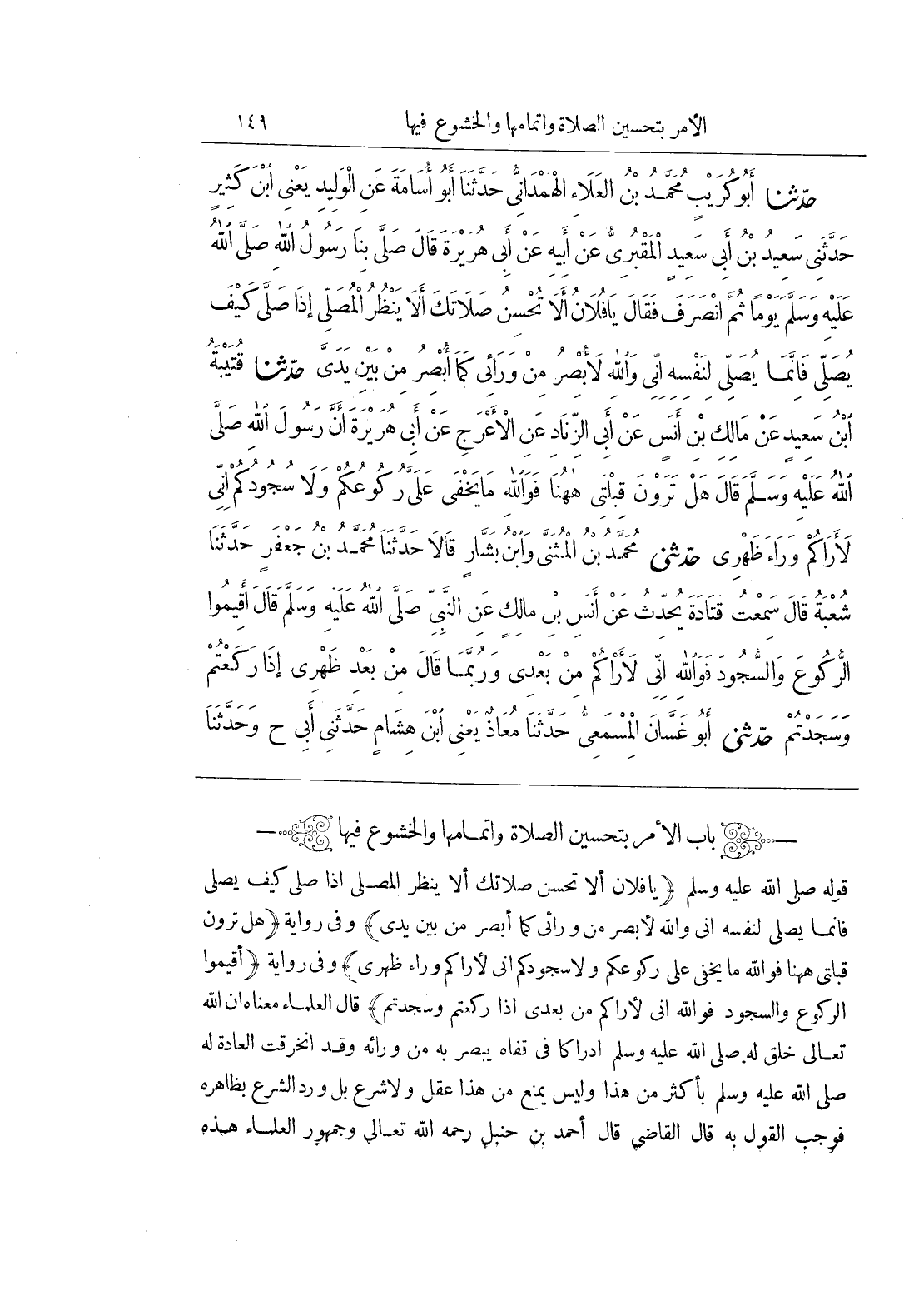 قَوْلُهُ صَلَّى اللَّهُ عَلَيْهِ وَسَلَّمَ (يَا فُلَانُ أَلَا تُحْسِنُ صَلَاتَكَ أَلَا يَنْظُرُ الْمُصَلِّي إِذَا صلى كيف يصلي فإنما يُصَلِّي لِنَفْسِهِ إِنِّي وَاللَّهِ لَأُبْصِرُ مِنْ وَرَائِي كَمَا أُبْصِرُ مِنْ بَيْنِ يَدَيَّ) وفِي رِوَايَةٍ (هل ترون قبلتي ها هنا فَوَاللَّهِ مَا يَخْفَى عَلَيَّ رُكُوعُكُمْ وَلَا سُجُودُكُمِ إِنِّي لَأَرَاكُمْ وَرَاءَ ظَهْرِي) وَفِي رِوَايَةٍ (أَقِيمُوا الرُّكُوعَ وَالسُّجُودَ فَوَاللَّهِ إِنِّي لَأَرَاكُمْ مِنْ بَعْدِي إِذَا رَكَعْتُمْ وَسَجَدْتُمْ) قَالَ الْعُلَمَاءُ مَعْنَاهُ أَنَّ اللَّهَ تَعَالَى خَلَقَ لَهُ صَلَّى اللَّهُ عَلَيْهِ وَسَلَّمَ إِدْرَاكًا فِي قَفَاهُ يُبْصِرُ بِهِ مِنْ وَرَائِهِ وَقَدِ انْخَرَقَتِ الْعَادَةُ لَهُ صَلَّى اللَّهُ عَلَيْهِ وَسَلَّمَ بِأَكْثَرَ مِنْ هَذَا وَلَيْسَ يَمْنَعُ مِنْ هَذَا عَقْلٌ وَلَا شَرْعٌ بَلْ وَرَدَ الشَّرْعُ بِظَاهِرِهِ فَوَجَبَ الْقَوْلُ بِهِ قَالَ الْقَاضِي قَالَ أَحْمَدُ بْنُ حَنْبَلٍ رَحِمَهُ اللَّهُ تَعَالَى وَجُمْهُورُ الْعُلَمَاءِ هَذِهِ