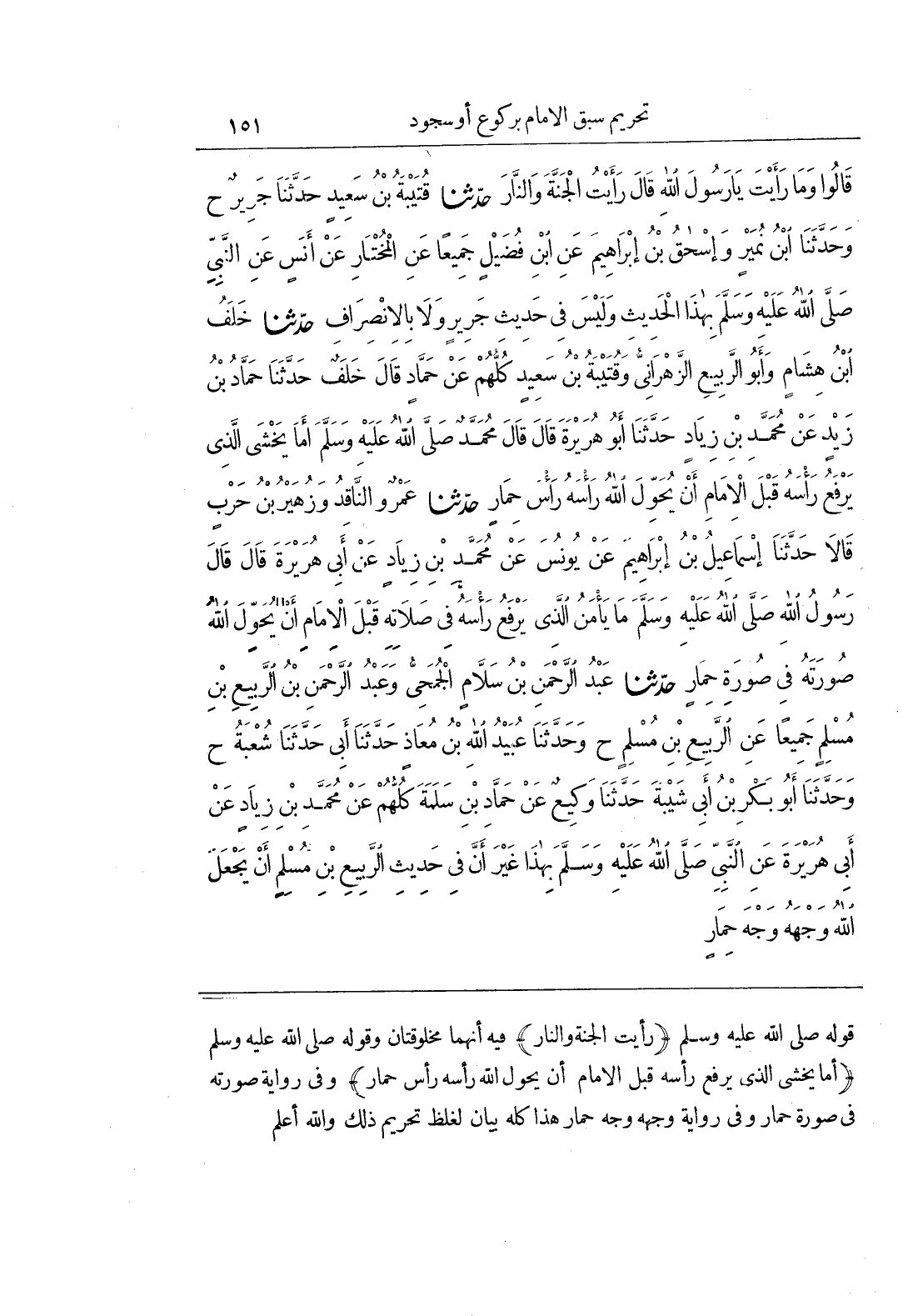 قَوْلُهُ صَلَّى اللَّهُ عَلَيْهِ وَسَلَّمَ (رَأَيْتُ الْجَنَّةَ وَالنَّارَ) فِيهِ أَنَّهُمَا مَخْلُوقَتَانِ وَقَوْلُهُ صَلَّى اللَّهُ عليه وسلم (أما يخشى الذي يرفع رَأْسَهُ قَبْلَ الْإِمَامِ أَنْ يُحَوِّلَ اللَّهُ رَأْسَهُ رَأْسَ حِمَارٍ) وَفِي رِوَايَةٍ صُورَتَهُ فِي صُورَةِ حِمَارٍ وَفِي رِوَايَةٍ وَجْهَهُ وَجْهَ حِمَارٍ هَذَا كُلُّهُ بَيَانٌ لِغِلَظِ تَحْرِيمِ ذَلِكَ وَاللَّهُ أَعْلَمُ