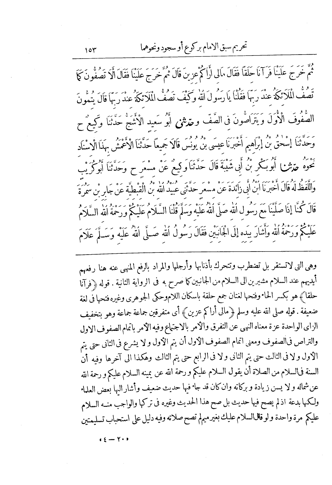 وَهِيَ الَّتِي لَا تَسْتَقِرُّ بَلْ تَضْطَرِبُ وَتَتَحَرَّكُ بِأَذْنَابِهَا وَأَرْجُلِهَا وَالْمُرَادُ بِالرَّفْعِ الْمَنْهِيِّ عَنْهُ هُنَا رَفْعُهُمْ أَيْدِيَهُمْ عِنْدَ السَّلَامِ مُشِيرِينَ إِلَى السَّلَامِ مِنَ الْجَانِبَيْنِ كَمَا صَرَّحَ بِهِ فِي الرِّوَايَةِ الثَّانِيَةِ قَوْلُهُ (فَرَآنَا حِلَقًا) هُوَ بِكَسْرِ الْحَاءِ وَفَتْحِهَا لُغَتَانِ جَمْعُ حَلْقَةٍ بِإِسْكَانِ اللَّامِ وَحَكَى الْجَوْهَرِيُّ وَغَيْرُهُ فَتَحَهَا فِي لُغَةٍ ضَعِيفَةٍ قَوْلُهُ صَلَّى اللَّهُ عَلَيْهِ وَسَلَّمَ (مَا لِي أَرَاكُمْ عِزِينَ) أَيْ مُتَفَرِّقِينَ جَمَاعَةً جَمَاعَةً وَهُوَ بِتَخْفِيفِ الزَّايِ الْوَاحِدَةِ عِزَةٌ مَعْنَاهُ النَّهْيُ عَنِ التَّفَرُّقِ وَالْأَمْرُ بِالِاجْتِمَاعِ وَفِيهِ الْأَمْرُ بِإِتْمَامِ الصُّفُوفِ الْأُوَّلِ والتراص في الصفوف وَمَعْنَى إِتْمَامِ الصُّفُوفِ الْأَوَّلِ أَنْ يَتِمَّ الْأَوَّلَ وَلَا يَشْرَعُ فِي الثَّانِي حَتَّى يَتِمَّ الْأَوَّلُ وَلَا فِي الثَّالِثِ حَتَّى يَتِمَّ الثَّانِي وَلَا فِي الرَّابِعِ حَتَّى يَتِمَّ الثَّالِثُ وَهَكَذَا إِلَى آخِرِهَا وَفِيهِ أَنَّ السُّنَّةَ فِي السَّلَامِ مِنَ الصَّلَاةِ أَنْ يَقُولَ السَّلَامُ عَلَيْكُمْ وَرَحْمَةُ اللَّهِ عن يمينه السلام عَلَيْكُمْ وَرَحْمَةُ اللَّهِ عَنْ شِمَالِهِ وَلَا يُسَنُّ زِيَادَةُ وَبَرَكَاتُهُ وَإِنْ كَانَ قَدْ جَاءَ فِيهَا حَدِيثٌ ضَعِيفٌ وَأَشَارَ إِلَيْهَا بَعْضُ الْعُلَمَاءِ وَلَكِنَّهَا بِدْعَةٌ إِذْ لَمْ يَصِحَّ فِيهَا حَدِيثٌ بَلْ صَحَّ هَذَا الْحَدِيثُ وَغَيْرُهُ فِي تَرْكِهَا وَالْوَاجِبُ مِنْهُ السَّلَامُ عَلَيْكُمْ مَرَّةً وَاحِدَةً وَلَوْ قَالَ السَّلَامُ عَلَيْكَ بِغَيْرِ مِيمٍ لَمْ تَصِحَّ صَلَاتُهُ وَفِيهِ دَلِيلٌ عَلَى اسْتِحْبَابِ تَسْلِيمَتَيْنِ