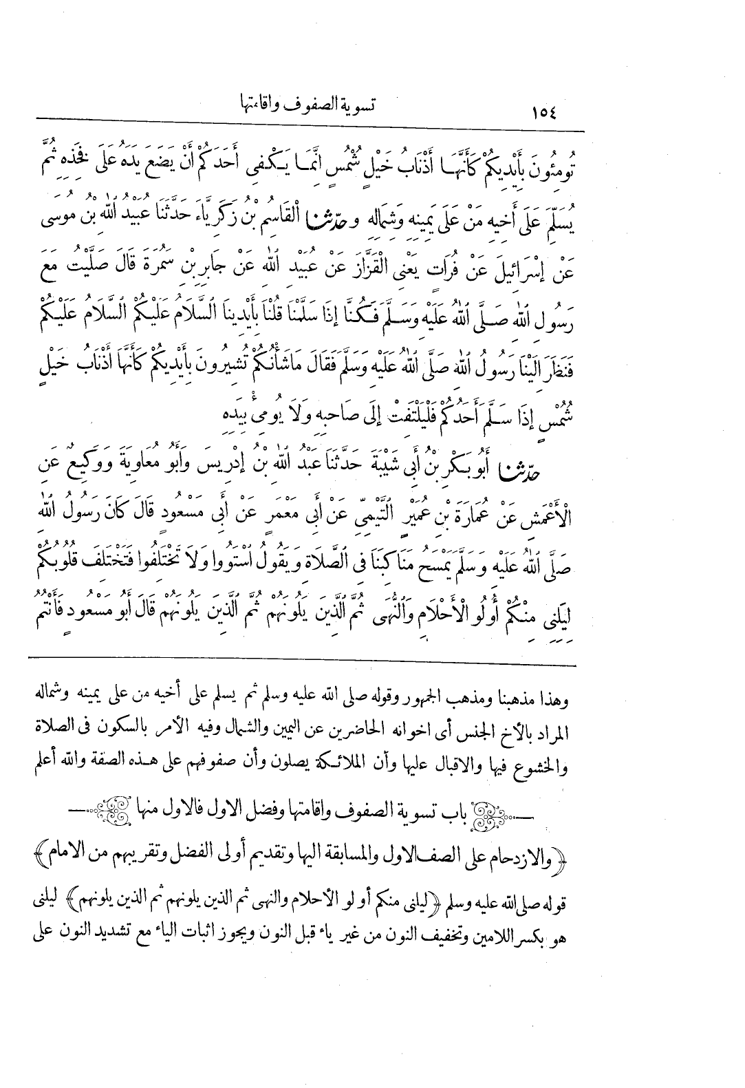وَهَذَا مَذْهَبُنَا وَمَذْهَبُ الْجُمْهُورِ وَقَوْلُهُ صَلَّى اللَّهُ عَلَيْهِ وَسَلَّمَ ثُمَّ يُسَلِّمُ عَلَى أَخِيهِ مِنْ عَلَى يَمِينِهِ وَشِمَالِهِ الْمُرَادُ بِالْأَخِ الْجِنْسُ أَيْ إِخْوَانِهِ الْحَاضِرِينَ عَنِ الْيَمِينِ وَالشِّمَالِ وَفِيهِ الْأَمْرُ بِالسُّكُونِ فِي الصَّلَاةِ وَالْخُشُوعِ فِيهَا وَالْإِقْبَالِ عَلَيْهَا وَأَنَّ الْمَلَائِكَةَ يُصَلُّونَ وَأَنَّ صُفُوفَهُمْ عَلَى هَذِهِ الصفة والله أعلم