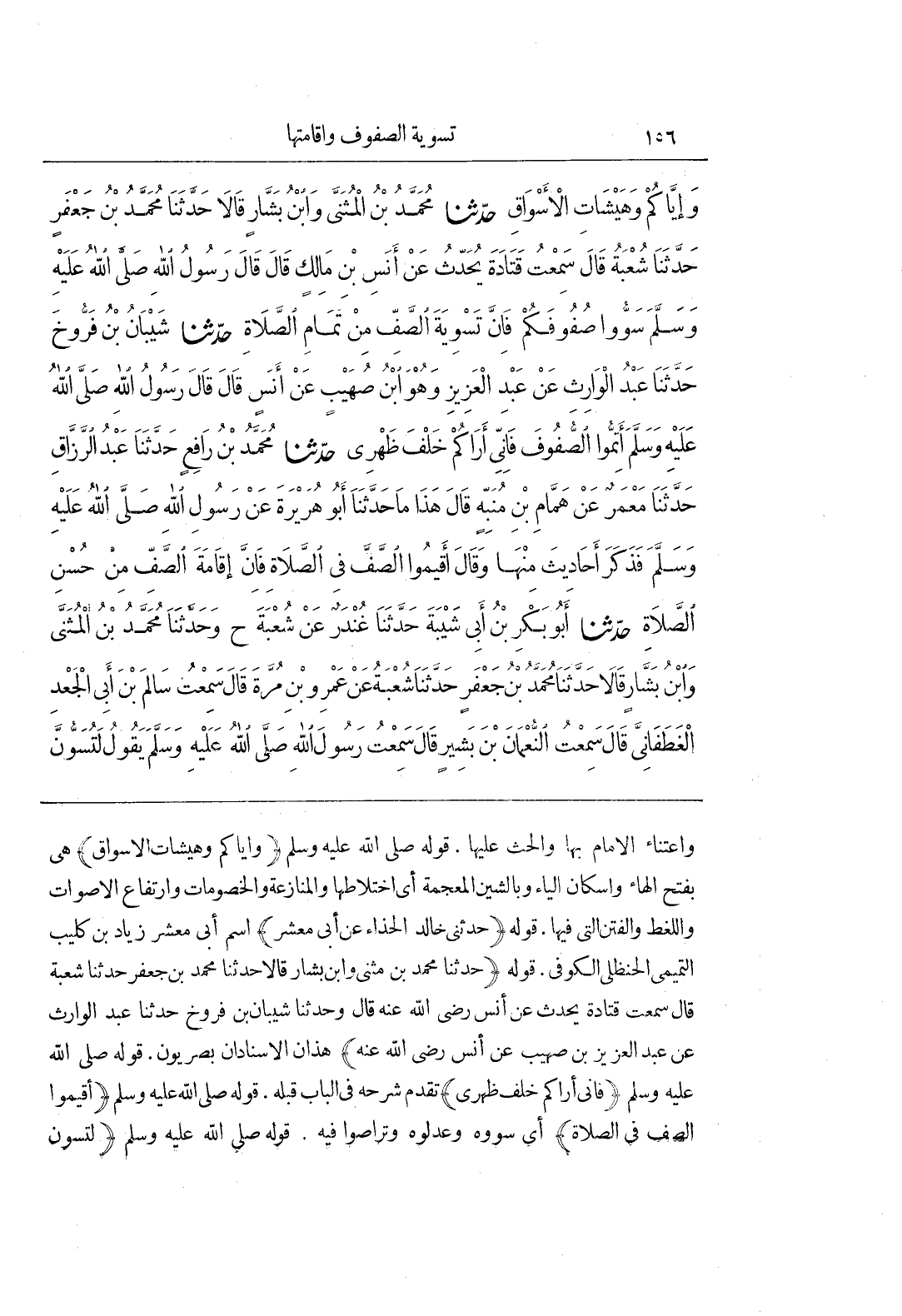 وَاعْتِنَاءُ الْإِمَامِ بِهَا وَالْحَثُّ عَلَيْهَا قَوْلُهُ صَلَّى اللَّهُ عَلَيْهِ وَسَلَّمَ (وَإِيَّاكُمْ وَهَيْشَاتِ الْأَسْوَاقِ) هِيَ بِفَتْحِ الْهَاءِ وَإِسْكَانِ الْيَاءِ وَبِالشِّينِ الْمُعْجَمَةِ أَيِ اخْتِلَاطُهَا وَالْمُنَازَعَةُ وَالْخُصُومَاتُ وَارْتِفَاعُ الْأَصْوَاتِ وَاللَّغَطُ وَالْفِتَنُ الَّتِي فِيهَا قَوْلُهُ (حَدَّثَنِي خَالِدٌ الْحَذَّاءُ عَنْ أَبِي مَعْشَرٍ) اسْمُ أَبِي مَعْشَرٍ زِيَادُ بْنُ كُلَيْبٍ التَّمِيمِيُّ الْحَنْظَلِيُّ الْكُوفِيُّ قَوْلُهُ (حَدَّثَنَا مُحَمَّدُ بن مثنى وبن بَشَّارٍ قَالَا حَدَّثَنَا مُحَمَّدُ بْنُ جَعْفَرٍ حَدَّثَنَا شُعْبَةُ قَالَ سَمِعْتُ قَتَادَةَ يُحَدِّثُ عَنْ أَنَسٍ رَضِيَ اللَّهُ عَنْهُ قَالَ وَحَدَّثَنَا شَيْبَانُ بْنُ فَرُّوخَ حَدَّثَنَا عَبْدُ الْوَارِثِ عَنْ عَبْدِ الْعَزِيزِ بْنِ صُهَيْبٍ عَنْ أنَسٍ رَضِيَ اللَّهُ عَنْهُ) هذان الإسنادان بصريون وقوله صَلَّى اللَّهُ عَلَيْهِ وَسَلَّمَ (فَإِنِّي أَرَاكُمْ خَلْفَ ظَهْرِي) تَقَدَّمَ شَرْحُهُ فِي الْبَابِ قَبْلَهُ قَوْلُهُ صَلَّى اللَّهُ عَلَيْهِ وَسَلَّمَ (أَقِيمُوا الصَّفَّ فِي الصَّلَاةِ) أَيْ سَوُّوهُ وَعَدِّلُوهُ وَتَرَاصُّوا فِيهِ قَوْلُهُ صَلَّى اللَّهُ عَلَيْهِ وَسَلَّمَ (لَتُسَوُّنَّ
