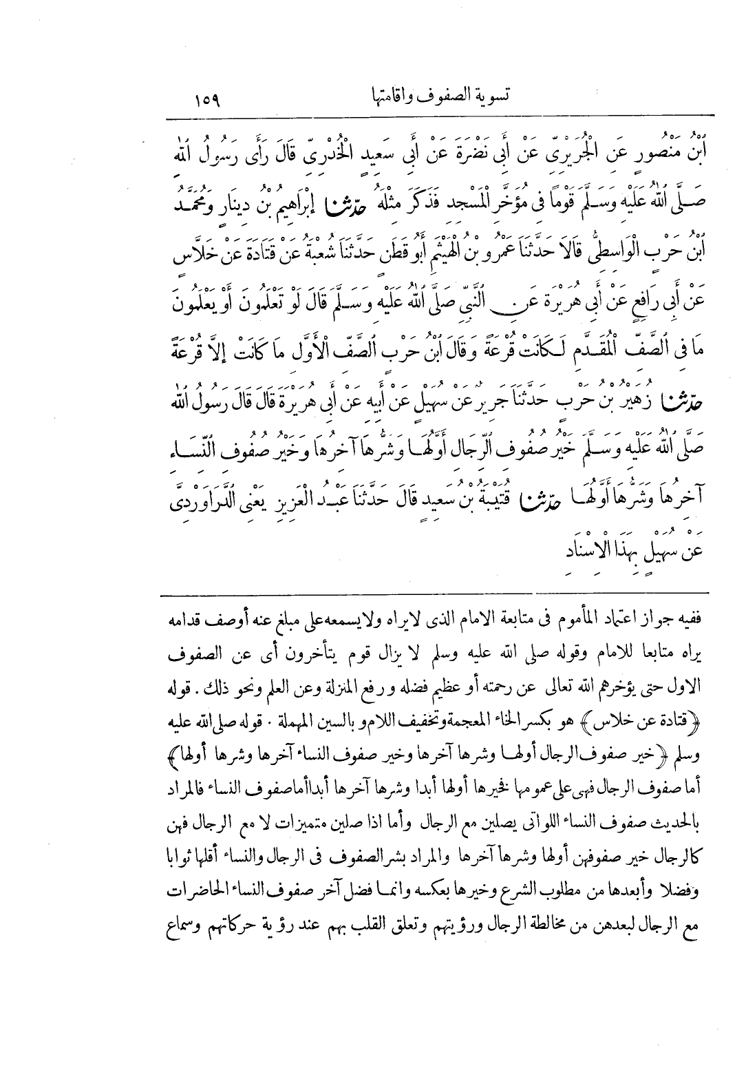 فَفِيهِ جَوَازُ اعْتِمَادِ الْمَأْمُومِ فِي مُتَابَعَةِ الْإِمَامِ الَّذِي لَا يَرَاهُ وَلَا يَسْمَعُهُ عَلَى مُبَلِّغٍ عنه أوصف قُدَّامَهُ يَرَاهُ مُتَابِعًا لِلْإِمَامِ وَقَوْلُهُ صَلَّى اللَّهُ عَلَيْهِ وَسَلَّمَ لَا يَزَالُ قَوْمٌ يَتَأَخَّرُونَ أَيْ عَنِ الصُّفُوفِ الْأُوَلِ حَتَّى يُؤَخِّرَهُمُ اللَّهُ تَعَالَى عَنْ رَحْمَتِهِ أَوْ عَظِيمِ فَضْلِهِ وَرَفْعِ الْمَنْزِلَةِ وَعَنِ الْعِلْمِ وَنَحْوِ ذَلِكَ قَوْلُهُ (قَتَادَةَ عَنْ خِلَاسٍ) هُوَ بِكَسْرِ الْخَاءِ الْمُعْجَمَةِ وَتَخْفِيفِ اللَّامِ وَبِالسِّينِ الْمُهْمَلَةِ قَوْلُهُ صَلَّى اللَّهُ عَلَيْهِ وَسَلَّمَ (خَيْرُ صُفُوفِ الرِّجَالِ أَوَّلُهَا وَشَرُّهَا آخِرُهَا وَخَيْرُ صُفُوفِ النِّسَاءِ آخِرُهَا وَشَرُّهَا أَوَّلُهَا) أَمَّا صُفُوفُ الرِّجَالِ فَهِيَ عَلَى عُمُومِهَا فَخَيْرُهَا أَوَّلُهَا أَبَدًا وَشَرُّهَا آخِرُهَا أَبَدًا أَمَّا صُفُوفُ النِّسَاءِ فَالْمُرَادُ بالحديث أما صُفُوفُ النِّسَاءِ اللَّوَاتِي يُصَلِّينَ مَعَ الرِّجَالِ وَأَمَّا إِذَا صَلَّيْنَ مُتَمَيِّزَاتٍ لَا مَعَ الرِّجَالِ فَهُنَّ كَالرِّجَالِ خَيْرُ صُفُوفِهِنَّ أَوَّلُهَا وَشَرُّهَا آخِرُهَا وَالْمُرَادُ بِشَرِّ الصُّفُوفِ فِي الرِّجَالِ وَالنِّسَاءِ أَقَلُّهَا ثَوَابًا وَفَضْلًا وَأَبْعَدُهَا مِنْ مَطْلُوبِ الشَّرْعِ وَخَيْرُهَا بِعَكْسِهِ وَإِنَّمَا فَضَّلَ آخِرَ صُفُوفِ النِّسَاءِ الْحَاضِرَاتِ مَعَ الرِّجَالِ لِبُعْدِهِنَّ مِنْ مُخَالَطَةِ الرِّجَالِ وَرُؤْيَتِهِمْ وَتَعَلُّقِ الْقَلْبِ بِهِمْ عِنْدَ رُؤْيَةِ حَرَكَاتِهِمْ وَسَمَاعِ