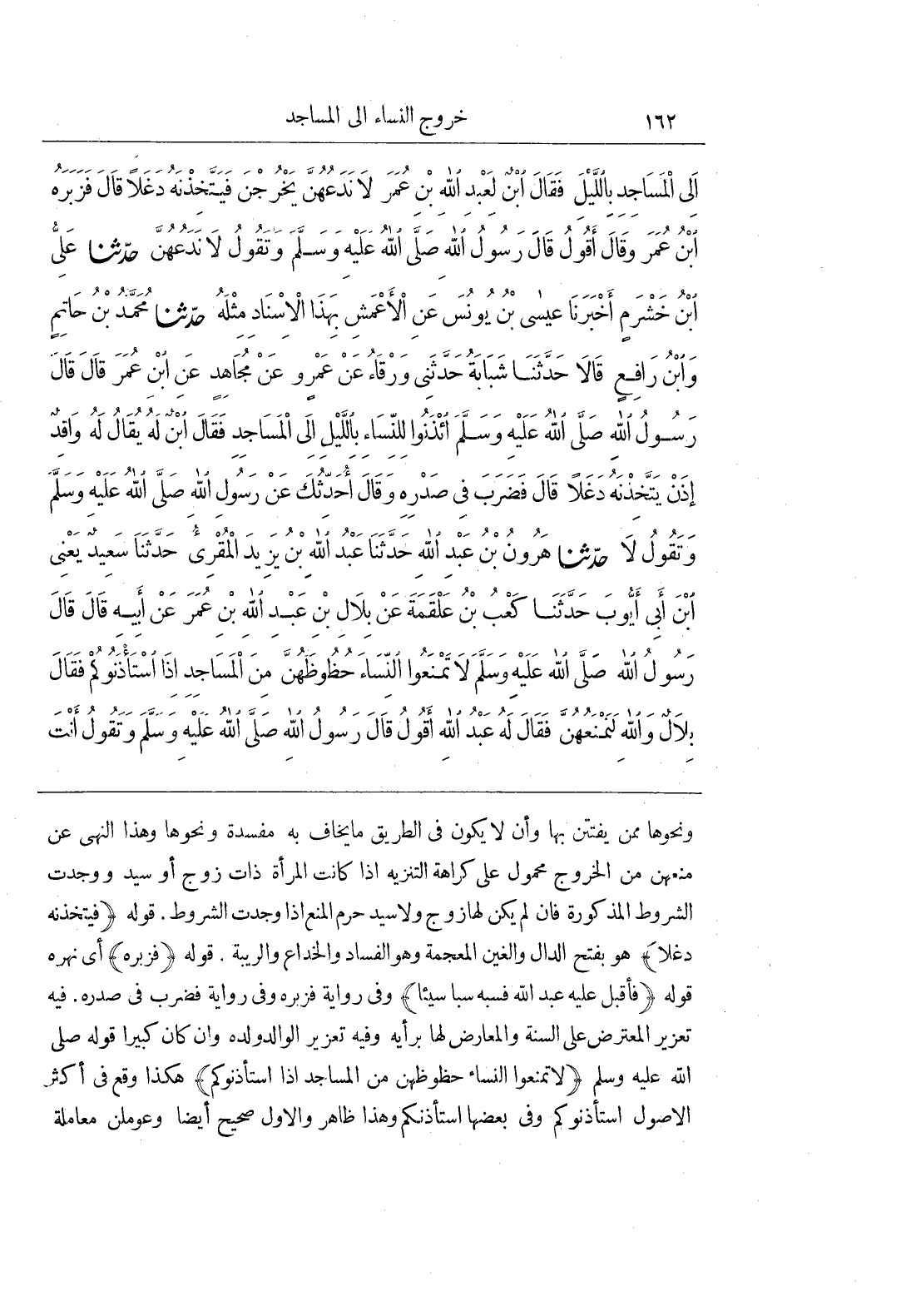 وَنَحْوَهَا مِمَّنْ يُفْتَتَنُ بِهَا وَأَنْ لَا يَكُونَ فِي الطَّرِيقِ مَا يَخَافُ بِهِ مَفْسَدَةً وَنَحْوَهَا وَهَذَا النَّهْيُ عَنْ مَنْعِهِنِّ مِنَ الْخُرُوجِ مَحْمُولٌ عَلَى كَرَاهَةِ التَّنْزِيهِ إِذَا كَانَتِ الْمَرْأَةُ ذَاتَ زَوْجٍ أَوْ سَيِّدٍ وَوُجِدَتِ الشُّرُوطُ الْمَذْكُورَةُ فَإِنْ لَمْ يَكُنْ لَهَا زَوْجٌ وَلَا سَيِّدٌ حَرُمَ الْمَنْعُ إِذَا وُجِدَتِ الشُّرُوطُ قَوْلُهُ (فَيَتَّخِذْنَهُ دَغَلًا) هُوَ بِفَتْحِ الدَّالِ وَالْغَيْنِ الْمُعْجَمَةِ وَهُوَ الْفَسَادُ وَالْخِدَاعُ وَالرِّيبَةُ قَوْلُهُ (فَزَبَرَهُ) أَيْ نَهَرَهُ قَوْلُهُ (فَأَقْبَلَ عَلَيْهِ عَبْدُ اللَّهِ فَسَبَّهُ سَبًّا سَيِّئًا) وَفِي رِوَايَةٍ فَزَبَرَهُ وَفِي رِوَايَةٍ فَضَرَبَ فِي صدره فيه تعزير الْمُعْتَرِضِ عَلَى السُّنَّةِ وَالْمُعَارِضِ لَهَا بِرَأْيِهِ وَفِيهِ تعزير الْوَالِدِ وَلَدَهُ وَإِنْ كَانَ كَبِيرًا قَوْلُهُ صَلَّى اللَّهُ عَلَيْهِ وَسَلَّمَ (لَا تَمْنَعُوا النِّسَاءَ حُظُوظَهُنَّ مِنَ الْمَسَاجِدِ إِذَا اسْتَأْذَنُوكُمْ) هَكَذَا وَقَعَ فِي أَكْثَرِ الْأُصُولِ اسْتَأْذَنُوكُمْ وَفِي بَعْضِهَا اسْتَأْذَنَكُمْ وَهَذَا ظَاهِرٌ وَالْأَوَّلُ صَحِيحٌ أَيْضًا وَعُومِلْنَ مُعَامَلَةَ