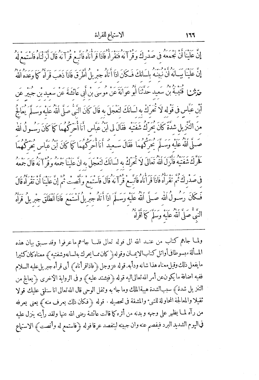 ولما جاءهم كتاب من عند الله إِلَى قَوْلِهِ تَعَالَى فَلَمَّا جَاءَهُمْ مَا عَرَفُوا وَقَدْ سَبَقَ بَيَانُ هَذِهِ الْمَسْأَلَةِ مَبْسُوطًا فِي أَوَائِلِ كِتَابِ الْإِيمَانِ وَقَوْلُهُ كَانَ مِمَّا يُحَرِّكُ به لسانه وشفتيه معناه كان كثيرا ما يفعل ذَلِكَ وَقِيلَ مَعْنَاهُ هَذَا شَأْنُهُ وَدَأْبُهُ قَوْلُهُ عز وجل فإذا قرأناه أَيْ قَرَأَهُ جِبْرِيلُ عَلَيْهِ السَّلَامُ فَفِيهِ إِضَافَةُ مَا يَكُونُ عَنْ أَمْرِ اللَّهِ تَعَالَى إِلَيْهِ قَوْلُهُ فَيَشْتَدُّ عَلَيْهِ وَفِي الرِّوَايَةِ الْأُخْرَى يُعَالِجُ مِنَ التَّنْزِيلِ شِدَّةً سَبَبُ الشِّدَّةِ هَيْبَةُ الْمَلَكِ وَمَا جَاءَ بِهِ وَثِقَلُ الْوَحْيِ قَالَ اللَّهُ تَعَالَى إِنَّا سَنُلْقِي عَلَيْكَ قَوْلًا ثقيلا وَالْمُعَالَجَةُ الْمُحَاوَلَةُ لِلشَّيْءِ وَالْمَشَقَّةُ فِي تَحْصِيلِهِ قَوْلُهُ فَكَانَ ذَلِكَ يُعْرَفُ مِنْهُ يَعْنِي يَعْرِفُهُ مَنْ رَآهُ لِمَا يَظْهَرُ عَلَى وَجْهِهِ وَبَدَنِهِ مِنَ أَثَرِهِ كَمَا قَالَتْ عَائِشَةُ رَضِيَ اللَّهُ عَنْهَا وَلَقَدْ رَأَيْتُهُ يَنْزِلُ عَلَيْهِ فِي الْيَوْمِ الشَّدِيدِ الْبَرْدِ فَيَفْصِمُ عَنْهُ وَإِنَّ جَبِينَهُ لَيَتَفَصَّدُ عَرَقًا قَوْلُهُ فَاسْتَمِعْ لَهُ وَأَنْصِتْ الِاسْتِمَاعُ
