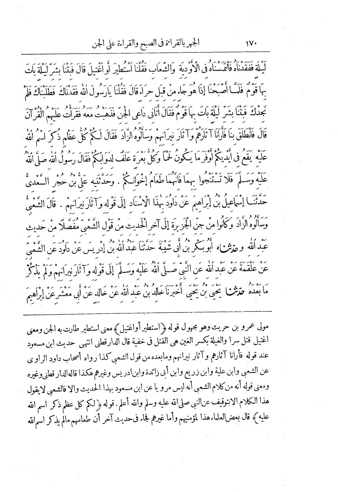 مَوْلَى عَمْرِو بْنِ حُرَيْثٍ وَهُوَ مَجْهُولٌ قَوْلُهُ (اسْتُطِيرَ أَوِ اغْتِيلَ) مَعْنَى اسْتُطِيرَ طَارَتْ بِهِ الْجِنُّ وَمَعْنَى اغْتِيلَ قُتِلَ سِرًّا وَالْغِيلَةُ بِكَسْرِ الْغَيْنِ هِيَ الْقَتْلُ فِي خُفْيَةٍ قَالَ الدَّارَقُطْنِيُّ انتهى حديث بن مَسْعُودٍ عِنْدَ قَوْلِهِ فَأَرَانَا آثَارَهُمْ وَآثَارَ نِيرَانِهِمْ وَمَا بَعْدَهُ مِنْ قَوْلِ الشَّعْبِيِّ كَذَا رَوَاهُ أصحاب داود الراوي عن الشعبي وبن علية وبن زريع وبن أبي زائدة وبن إِدْرِيسَ وَغَيْرِهِمْ هَكَذَا قَالَهُ الدَّارَقُطْنِيُّ وَغَيْرُهُ وَمَعْنَى قَوْلِهِ إِنَّهُ مِنْ كَلَامِ الشَّعْبِيِّ أَنَّهُ لَيْسَ مرويا عن بن مَسْعُودٍ بِهَذَا الْحَدِيثِ وَإِلَّا فَالشَّعْبِيُّ لَا يَقُولُ هَذَا الْكَلَامَ إِلَّا بِتَوْقِيفٍ عَنِ النَّبِيِّ صَلَّى اللَّهُ عَلَيْهِ وَسَلَّمَ وَاللَّهُ أَعْلَمُ قَوْلُهُ (لَكُمْ كُلَّ عَظْمٍ ذُكِرَ اسْمُ اللَّهُ عَلَيْهِ) قَالَ بَعْضُ الْعُلَمَاءِ هَذَا لِمُؤْمِنِيهِمْ وَأَمَّا غَيْرِهِمْ فَجَاءَ في حديث آخر أن طعامهم مالم يُذْكَرِ اسْمُ اللَّهِ