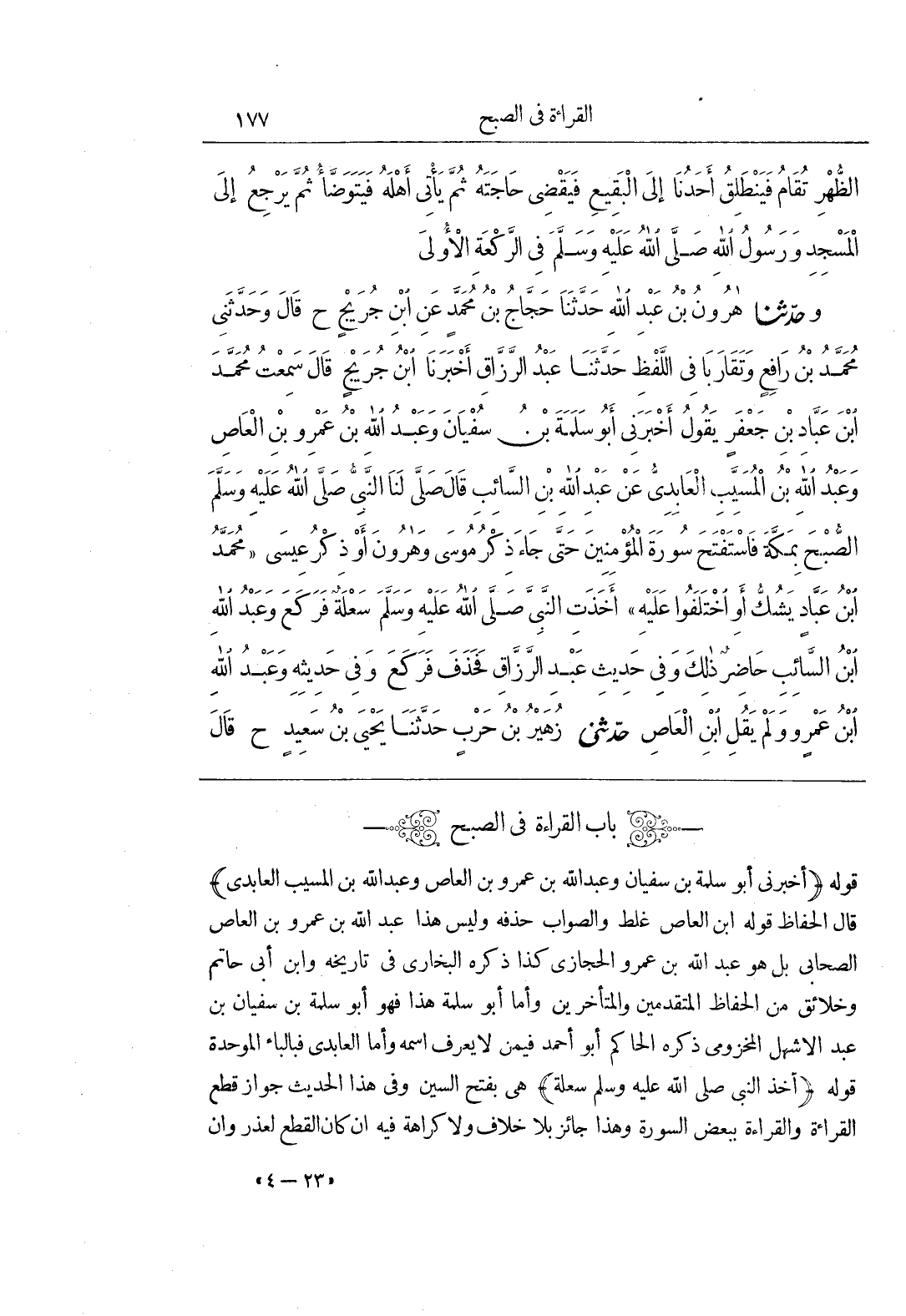 قَوْلُهُ (أَخْبَرَنِي أَبُو سَلَمَةَ بْنُ سُفْيَانَ وَعَبْدُ اللَّهِ بْنُ عَمْرِو بْنِ الْعَاصِ وَعَبْدُ اللَّهِ بْنُ الْمُسَيِّبِ الْعَابِدِيُّ) قال الحفاظ قوله بن الْعَاصِ غَلَطٌ وَالصَّوَابُ حَذْفُهُ وَلَيْسَ هَذَا عَبْدَ اللَّهِ بْنَ عَمْرِو بْنِ الْعَاصِ الصَّحَابِيَّ بَلْ هُوَ عَبْدُ اللَّهِ بْنُ عَمْرٍو الْحِجَازِيُّ كَذَا ذكره البخارى في تاريخه وبن أَبِي حَاتِمٍ وَخَلَائِقُ مِنَ الْحُفَّاظِ الْمُتَقَدِّمِينَ وَالْمُتَأَخِّرِينَ وَأَمَّا أَبُو سَلَمَةَ هَذَا فَهُوَ أَبُو سَلَمَةَ بْنُ سُفْيَانَ بْنِ عَبْدِ الْأَشْهَلِ الْمَخْزُومِيِّ ذَكَرَهُ الْحَاكِمُ أَبُو أَحْمَدَ فِيمَنْ لَا يُعْرَفُ اسْمُهُ وَأَمَّا الْعَابِدِيُّ فَبِالْبَاءِ الْمُوَحَّدَةِ قَوْلُهُ (أَخَذَ النَّبِيَّ صَلَّى اللَّهُ عَلَيْهِ وَسَلَّمَ سَعْلَةٌ) هِيَ بِفَتْحِ السِّينِ وَفِي هَذَا الْحَدِيثِ جَوَازُ قَطْعِ الْقِرَاءَةِ وَالْقِرَاءَةِ بِبَعْضِ السُّورَةِ وَهَذَا جَائِزٌ بِلَا خِلَافٍ وَلَا كَرَاهَةَ فِيهِ إِنْ كَانَ الْقَطْعُ لِعُذْرٍ وان