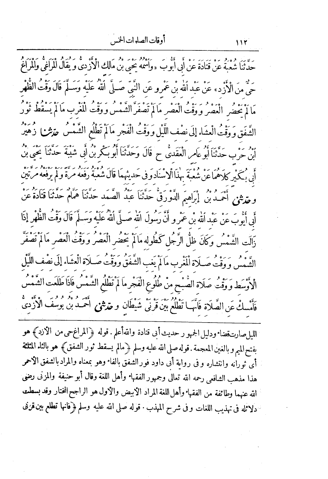 اللَّيْلِ صَارَتْ قَضَاءً وَدَلِيلُ الْجُمْهُورِ حَدِيثُ أَبِي قَتَادَةَ وَاللَّهُ أَعْلَمُ قَوْلُهُ الْمَرَاغُ حَيٌّ مِنَ الْأَزْدِ هُوَ بِفَتْحِ الْمِيمِ وَبِالْغَيْنِ الْمُعْجَمَةِ قَوْلُهُ ص ما لم يسقط ثور الشفق هو بالثاء الْمُثَلَّثَةُ أَيْ ثَوَرَانُهُ وَانْتِشَارُهُ وَفِي رِوَايَةِ أَبِي دَاوُدَ فَوْرُ الشَّفَقِ بِالْفَاءِ وَهُوَ بِمَعْنَاهُ وَالْمُرَادُ بِالشَّفَقِ الْأَحْمَرِ هَذَا مَذْهَبُ الشَّافِعِيِّ رَحِمَهُ اللَّهُ تَعَالَى وَجُمْهُورِ الْفُقَهَاءِ وَأَهْلِ اللُّغَةِ وَقَالَ أَبُو حَنِيفَةَ وَالْمُزَنِيُّ رَضِيَ اللَّهُ عَنْهُمَا وَطَائِفَةٌ مِنَ الْفُقَهَاءِ وَأَهْلِ اللُّغَةِ الْمُرَادُ الْأَبْيَضُ وَالْأَوَّلُ هُوَ الرَّاجِحُ الْمُخْتَارُ وَقَدْ بَسَطْتُ دَلَائِلَهُ فِي تَهْذِيبِ اللُّغَاتِ وَفِي شَرْحِ الْمُهَذَّبِ قَوْلُهُ صَلَّى اللَّهُ عَلَيْهِ وَسَلَّمَ فَإِنَّهَا تَطْلُعُ بَيْنَ قَرْنَيِ