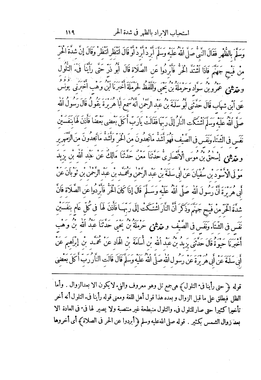 [616] قَوْلُهُ حَتَّى رَأَيْنَا فَيْءَ التُّلُولِ هِيَ جَمْعُ تَلٍّ وَهُوَ مَعْرُوفٌ وَالْفَيْءُ لَا يَكُونُ إِلَّا بَعْدَ الزَّوَالِ وَأَمَّا الظِّلُّ فَيُطْلَقُ عَلَى مَا قَبْلَ الزَّوَالِ وَبَعْدَهُ هَذَا قَوْلُ أَهْلِ اللُّغَةِ ومعنى قوله رأينا فيء التلول أنه أخر تَأْخِيرًا كَثِيرًا حَتَّى صَارَ لِلتُّلُولِ فَيْءٌ وَالتُّلُولُ مُنْبَطِحَةٌ غَيْرُ مُنْتَصِبَةٍ وَلَا يَصِيرُ لَهَا فَيْءٌ فِي الْعَادَةِ إِلَّا بَعْدَ زَوَالِ الشَّمْسِ بِكَثِيرٍ قوله ص أَبْرِدُوا عَنِ الْحَرِّ فِي الصَّلَاةِ أَيْ أَخِّرُوهَا
