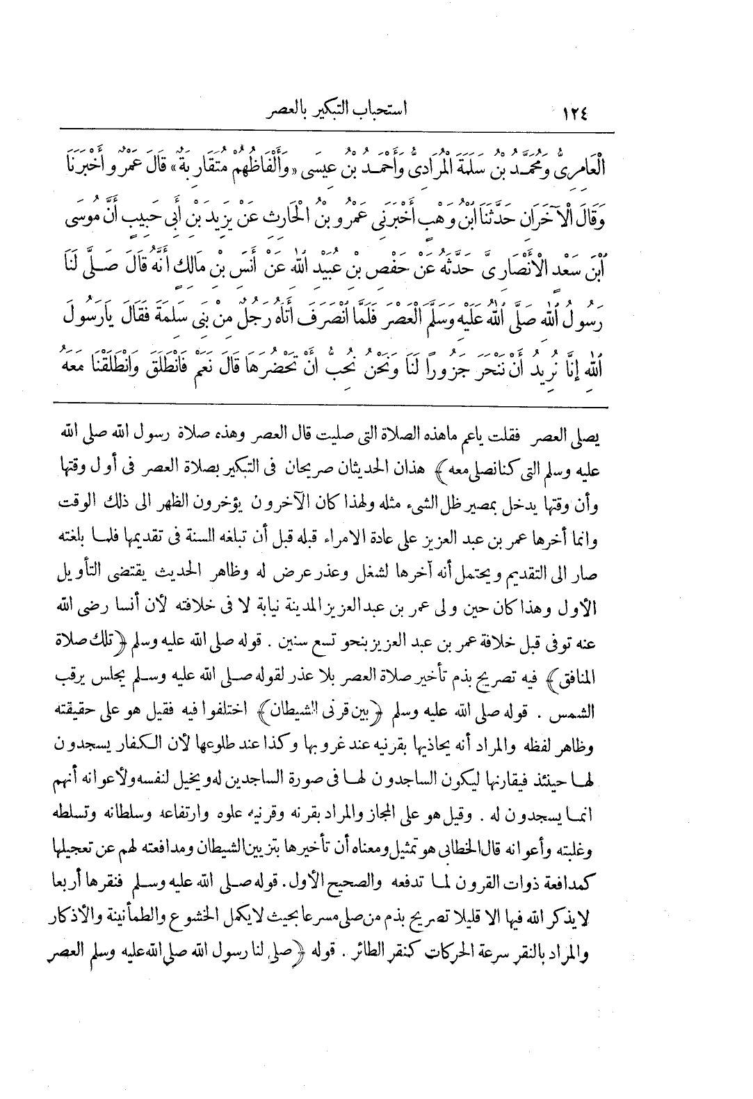 يُصَلِّي الْعَصْرَ فَقُلْتُ يَا عَمُّ مَا هَذِهِ الصَّلَاةُ الَّتِي صَلَّيْتَ قَالَ الْعَصْرُ وَهَذِهِ صَلَاةُ رَسُولِ اللَّهِ صَلَّى اللَّهُ عَلَيْهِ وَسَلَّمَ الَّتِي كُنَّا نُصَلِّي مَعَهُ هَذَانِ الْحَدِيثَانِ صَرِيحَانِ فِي التَّبْكِيرِ بِصَلَاةِ الْعَصْرِ فِي أَوَّلِ وَقْتِهَا وَأَنَّ وَقْتَهَا يَدْخُلُ بِمَصِيرِ ظِلِّ الشَّيْءِ مِثْلَهُ وَلِهَذَا كَانَ الْآخَرُونَ يُؤَخِّرُونَ الظُّهْرَ إِلَى ذَلِكَ الْوَقْتِ وَإِنَّمَا أَخَّرَهَا عُمَرُ بْنُ عَبْدِ الْعَزِيزِ عَلَى عَادَةِ الْأُمَرَاءِ قَبْلَهُ قَبْلَ أَنْ تَبْلُغَهُ السُّنَّةُ فِي تَقْدِيمِهَا فَلَمَّا بَلَغَتْهُ صَارَ إِلَى التَّقْدِيمِ وَيَحْتَمِلُ أَنَّهُ أَخَّرَهَا لِشُغْلٍ وَعُذْرٍ عَرَضَ لَهُ وَظَاهِرُ الْحَدِيثِ يَقْتَضِي التَّأْوِيلَ الْأَوَّلَ وَهَذَا كَانَ حِينَ وَلِيَ عُمَرُ بْنُ عَبْدِ الْعَزِيزِ الْمَدِينَةَ نِيَابَةً لَا فِي خِلَافَتِهِ لِأَنَّ أَنَسًا رَضِيَ اللَّهُ عَنْهُ تُوُفِّيَ قَبْلَ خِلَافَةِ عُمَرَ بْنِ عَبْدِ الْعَزِيزِ بِنَحْوِ تِسْعِ سِنِينَ