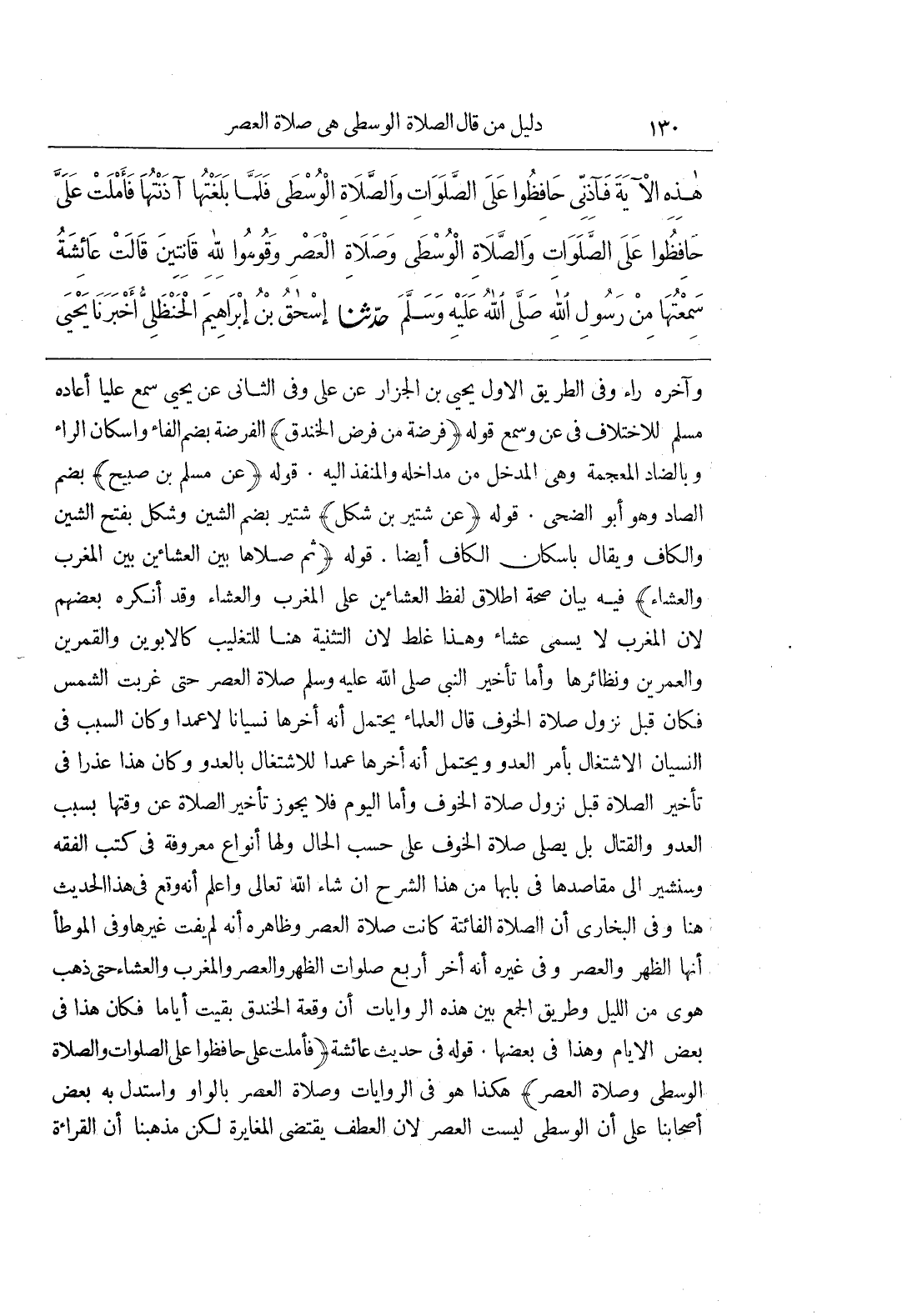 وَآخِرُهُ رَاءٌ وَفِي الطَّرِيقِ الْأَوَّلِ يَحْيَى بْنُ الْجَزَّارِ عَنْ عَلِيٍّ وَفِي الثَّانِي عَنْ يَحْيَى سَمِعَ عَلِيًّا أَعَادَهُ مُسْلِمٌ لِلِاخْتِلَافِ فِي عَنْ وسمع قَوْلُهُ فُرْضَةٌ مِنْ فُرَضِ الْخَنْدَقِ الْفُرْضَةُ بِضَمِّ الْفَاءِ وَإِسْكَانِ الرَّاءِ وَبِالضَّادِ الْمُعْجَمَةِ وَهِيَ الْمَدْخَلُ مِنْ مَدَاخِلِهِ وَالْمَنْفَذُ إِلَيْهِ قَوْلُهُ عَنْ مُسْلِمِ بْنِ صُبَيْحٍ بِضَمِّ الصَّادِ وَهُوَ أَبُو الضُّحَى قَوْلُهُ عَنْ شُتَيْرِ بْنِ شَكَلٍ شُتَيْرٌ بِضَمِّ الشِّينِ وَشَكَلٌ بِفَتْحِ الشِّينِ وَالْكَافِ وَيُقَالُ بِإِسْكَانِ الْكَافِ أَيْضًا قَوْلُهُ ثُمَّ صَلَّاهَا بَيْنَ الْعِشَاءَيْنِ بَيْنَ الْمَغْرِبِ وَالْعِشَاءِ فِيهِ بَيَانُ صِحَّةِ إِطْلَاقِ لَفْظِ الْعِشَاءَيْنِ عَلَى الْمَغْرِبِ وَالْعِشَاءِ وَقَدْ أَنْكَرَهُ بَعْضُهُمْ لِأَنَّ الْمَغْرِبَ لَا يُسَمَّى عِشَاءً وَهَذَا غَلَطٌ لِأَنَّ التَّثْنِيَةَ هُنَا لِلتَّغْلِيبِ كَالْأَبَوَيْنِ وَالْقَمَرَيْنِ والعمرين ونظائرها وَأَمَّا تَأْخِيرُ النَّبِيِّ صَلَّى اللَّهُ عَلَيْهِ وَسَلَّمَ صَلَاةَ الْعَصْرِ حَتَّى غَرَبَتِ الشَّمْسُ فَكَانَ قَبْلَ نُزُولِ صَلَاةِ الْخَوْفِ قَالَ الْعُلَمَاءُ يَحْتَمِلُ أَنَّهُ أَخَّرَهَا نِسْيَانًا لَا عَمْدًا وَكَانَ السَّبَبُ فِي النِّسْيَانِ الِاشْتِغَالُ بِأَمْرِ الْعَدُوِّ وَيَحْتَمِلُ أَنَّهُ أَخَّرَهَا عَمْدًا لِلِاشْتِغَالِ بِالْعَدُوِّ وَكَانَ هَذَا عُذْرًا فِي تَأْخِيرِ الصَّلَاةِ قَبْلَ نُزُولِ صَلَاةِ الْخَوْفِ وَأَمَّا الْيَوْمَ فَلَا يَجُوزُ تَأْخِيرُ الصَّلَاةِ عَنْ وَقْتِهَا بِسَبَبِ الْعَدُوِّ وَالْقِتَالِ بَلْ يُصَلِّي صَلَاةَ الْخَوْفِ عَلَى حَسَبِ الْحَالِ وَلَهَا أَنْوَاعٌ مَعْرُوفَةٌ فِي كُتُبِ الْفِقْهِ وَسَنُشِيرُ إِلَى مَقَاصِدِهَا فِي بَابِهَا مِنْ هَذَا الشَّرْحِ إِنْ شَاءَ اللَّهُ تَعَالَى وَاعْلَمْ أَنَّهُ وَقَعَ فِي هَذَا الْحَدِيثِ هُنَا وَفِي الْبُخَارِيِّ أَنَّ الصَّلَاةَ الْفَائِتَةَ كَانَتْ صَلَاةَ الْعَصْرِ وَظَاهِرُهُ أَنَّهُ لَمْ يَفُتْ غَيْرُهَا وَفِي الْمُوَطَّأِ أَنَّهَا الظُّهْرُ وَالْعَصْرُ وَفِي غَيْرِهِ أَنَّهُ أَخَّرَ أَرْبَعَ صَلَوَاتٍ الظُّهْرَ وَالْعَصْرَ وَالْمَغْرِبَ وَالْعِشَاءَ حَتَّى ذَهَبَ هَوِيٌ مِنَ اللَّيْلِ وَطَرِيقُ الْجَمْعِ بَيْنَ هَذِهِ الرِّوَايَاتِ أَنَّ وَقْعَةَ الْخَنْدَقِ بَقِيَتْ أَيَّامًا فَكَانَ هَذَا فِي بَعْضِ الْأَيَّامِ وَهَذَا فِي بَعْضِهَا