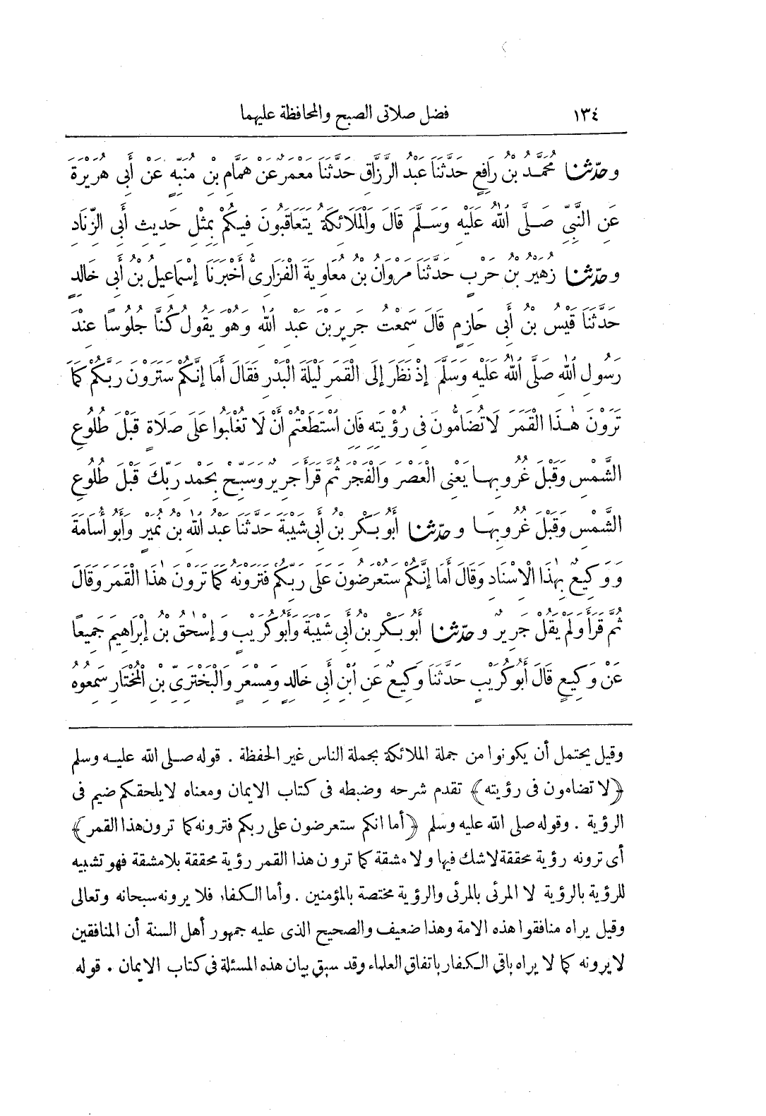 [633] وَقَوْلُهُ صَلَّى اللَّهُ عَلَيْهِ وَسَلَّمَ أَمَا إِنَّكُمْ سَتُعْرَضُونَ عَلَى رَبِّكُمْ فَتَرَوْنَهُ كَمَا تَرَوْنَ هَذَا الْقَمَرَ أَيْ تَرَوْنَهُ رُؤْيَةً مُحَقَّقَةً لَا شَكَّ فِيهَا وَلَا مَشَقَّةَ كَمَا تَرَوْنَ هَذَا الْقَمَرَ رُؤْيَةً مُحَقَّقَةً بِلَا مَشَقَّةٍ فَهُوَ تَشْبِيهٌ لِلرُّؤْيَةِ بِالرُّؤْيَةِ لَا الْمَرْئِيِّ بِالْمَرْئِيِّ وَالرُّؤْيَةُ مُخْتَصَّةٌ بِالْمُؤْمِنِينَ وَأَمَّا الْكُفَّارُ فَلَا يرونه سبحانه وتعالى وقيل يراه منافقوا هَذِهِ الْأُمَّةِ وَهَذَا ضَعِيفٌ وَالصَّحِيحُ الَّذِي عَلَيْهِ جُمْهُورُ أَهْلِ السُّنَّةِ أَنَّ الْمُنَافِقِينَ لَا يَرَوْنَهُ كَمَا لَا يَرَاهُ بَاقِي الْكُفَّارِ بِاتِّفَاقِ الْعُلَمَاءِ وَقَدْ سَبَقَ بَيَانُ هَذِهِ الْمَسْأَلَةِ فِي كِتَابِ الايمان قوله