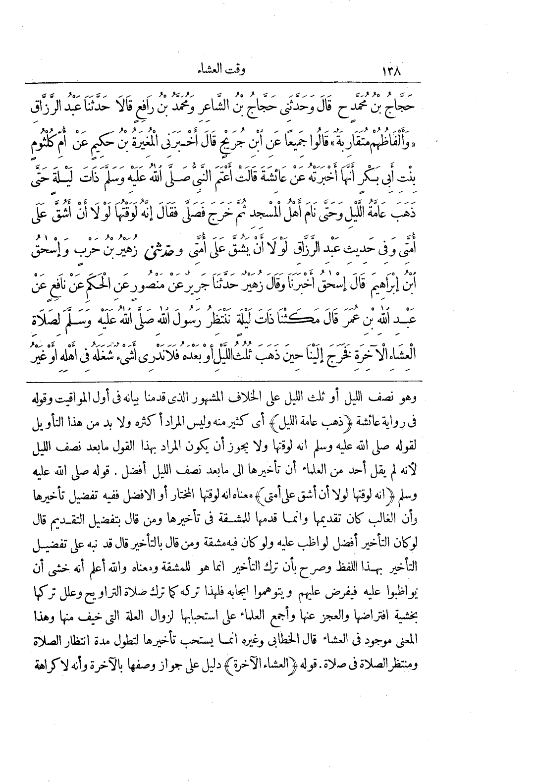 وَهُوَ نِصْفُ اللَّيْلِ أَوْ ثُلُثُ اللَّيْلِ عَلَى الْخِلَافِ الْمَشْهُورِ الَّذِي قَدَّمْنَا بَيَانَهُ فِي أَوَّلِ الْمَوَاقِيتِ وَقَوْلُهُ فِي رِوَايَةِ عَائِشَةَ ذَهَبَ عَامَّةُ اللَّيْلِ أَيْ كَثِيرٌ مِنْهُ وَلَيْسَ الْمُرَادُ أَكْثَرُهُ وَلَا بُدَّ مِنْ هَذَا التَّأْوِيلِ لِقَوْلِهِ صَلَّى اللَّهُ عَلَيْهِ وَسَلَّمَ إِنَّهُ لَوَقْتِهَا وَلَا يَجُوزُ أَنْ يَكُونَ الْمُرَادُ بِهَذَا الْقَوْلِ مَا بَعْدَ نِصْفِ اللَّيْلِ لِأَنَّهُ لَمْ يَقُلْ أَحَدٌ مِنَ الْعُلَمَاءِ أَنَّ تَأْخِيرَهَا إِلَى مَا بَعْدَ نِصْفِ اللَّيْلِ أَفْضَلُ قَوْلُهُ صَلَّى اللَّهُ عَلَيْهِ وَسَلَّمَ إِنَّهُ لَوَقْتُهَا لَوْلَا أَنْ أَشُقَّ عَلَى أُمَّتِي مَعْنَاهُ إِنَّهُ لَوَقْتُهَا الْمُخْتَارُ أَوِ الْأَفْضَلُ فَفِيهِ تَفْضِيلُ تَأْخِيرِهَا وَأَنَّ الْغَالِبَ كَانَ تَقْدِيمُهَا وَإِنَّمَا قَدَّمَهَا لِلْمَشَقَّةِ فِي تَأْخِيرِهَا وَمَنْ قَالَ بِتَفْضِيلِ التَّقْدِيمِ قَالَ لَوْ كَانَ التَّأْخِيرُ أَفْضَلَ لَوَاظَبَ عَلَيْهِ وَلَوْ كَانَ فِيهِ مَشَقَّةٌ وَمَنْ قَالَ بِالتَّأْخِيرِ قَالَ قَدْ نَبَّهَ عَلَى تَفْضِيلِ التَّأْخِيرِ بِهَذَا اللَّفْظِ وَصَرَّحَ بِأَنَّ تَرْكَ التَّأْخِيرِ إِنَّمَا هُوَ لِلْمَشَقَّةِ وَمَعْنَاهُ وَاللَّهُ أَعْلَمُ أَنَّهُ خَشِيَ أَنْ يُوَاظِبُوا عَلَيْهِ فَيُفْرَضُ عَلَيْهِمْ وَيَتَوَهَّمُوا إِيجَابَهُ فَلِهَذَا تَرَكَهُ كَمَا تَرَكَ صَلَاةَ التَّرَاوِيحِ وَعَلَّلَ تَرْكَهَا بِخَشْيَةِ افْتِرَاضِهَا وَالْعَجْزِ عَنْهَا وَأَجْمَعَ الْعُلَمَاءُ عَلَى اسْتِحْبَابِهَا لِزَوَالِ الْعِلَّةِ الَّتِي خِيفَ مِنْهَا وَهَذَا الْمَعْنَى مَوْجُودٌ فِي الْعِشَاءِ قَالَ الْخَطَّابِيُّ وَغَيْرُهُ إِنَّمَا يُسْتَحَبُّ تَأْخِيرُهَا لِتَطُولَ مُدَّةُ انْتِظَارِ الصَّلَاةِ وَمُنْتَظِرُ الصَّلَاةِ فِي صَلَاةٍ