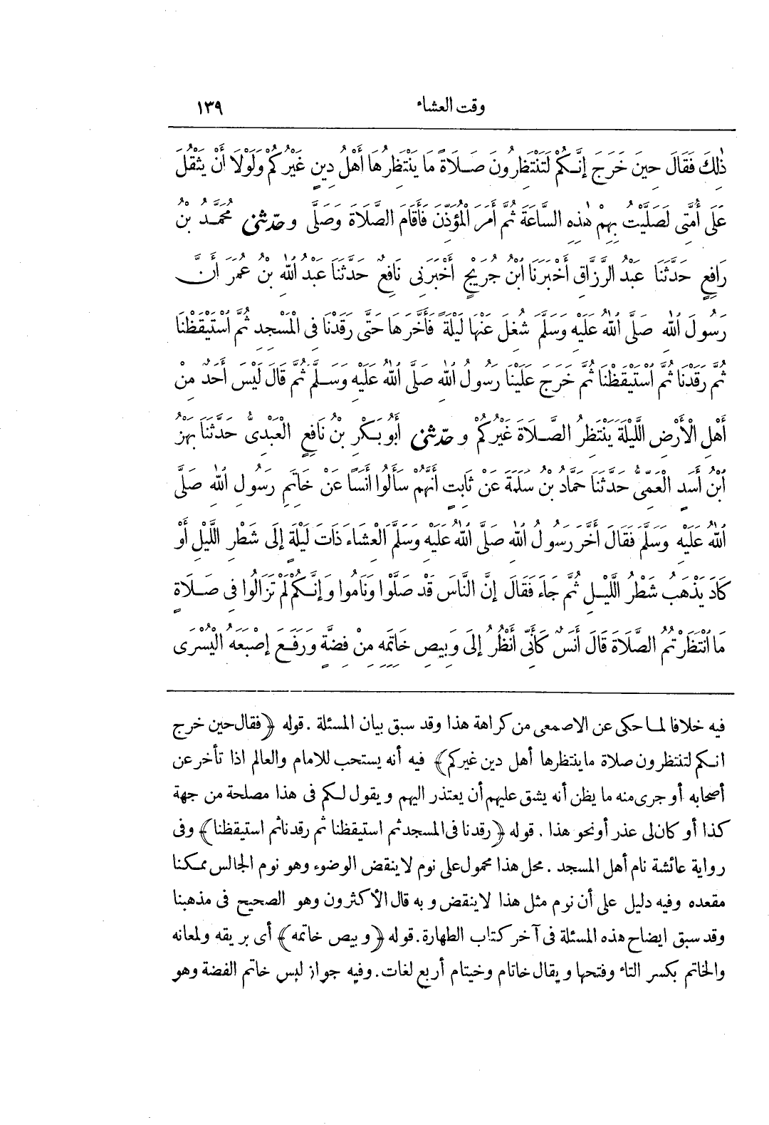 فِيهِ خِلَافًا لِمَا حُكِيَ عَنِ الْأَصْمَعِيِّ مِنْ كَرَاهَةِ هَذَا وَقَدْ سَبَقَ بَيَانُ الْمَسْأَلَةِ قَوْلُهُ فَقَالَ حِينَ خَرَجَ إِنَّكُمْ لَتَنْتَظِرُونَ صَلَاةً مَا يَنْتَظِرُهَا أَهْلُ دِينٍ غَيْرُكُمْ فِيهِ أَنَّهُ يُسْتَحَبُّ لِلْإِمَامِ وَالْعَالِمِ إِذَا تَأَخَّرَ عَنِ أَصْحَابِهِ أَوْ جَرَى مِنْهُ مَا يَظُنُّ أَنَّهُ يَشُقُّ عَلَيْهِمْ أَنْ يَعْتَذِرَ إِلَيْهِمْ وَيَقُولُ لَكُمْ فِي هَذَا مَصْلَحَةٌ مِنْ جِهَةِ كَذَا أَوْ كَانَ لِي عُذْرٌ أَوْ نَحْوُ هَذَا قَوْلُهُ رَقَدْنَا فِي الْمَسْجِدِ ثُمَّ اسْتَيْقَظْنَا ثُمَّ رَقَدْنَا ثُمَّ اسْتَيْقَظْنَا وفي رواية عائشة نام أهل المسجد محل هَذَا مَحْمُولٌ عَلَى نَوْمٍ لَا يَنْقُضُ الْوُضُوءَ وَهُوَ نَوْمُ الْجَالِسِ مُمَكِّنًا مَقْعَدَهُ وَفِيهِ دَلِيلٌ عَلَى أَنَّ نَوْمَ مِثْلِ هَذَا لَا يَنْقُضُ وَبِهِ قَالَ الْأَكْثَرُونَ وَهُوَ الصَّحِيحُ فِي مَذْهَبِنَا وَقَدْ سَبَقَ إِيضَاحُ هَذِهِ الْمَسْأَلَةِ فِي آخِرِ كِتَابِ الطَّهَارَةِ