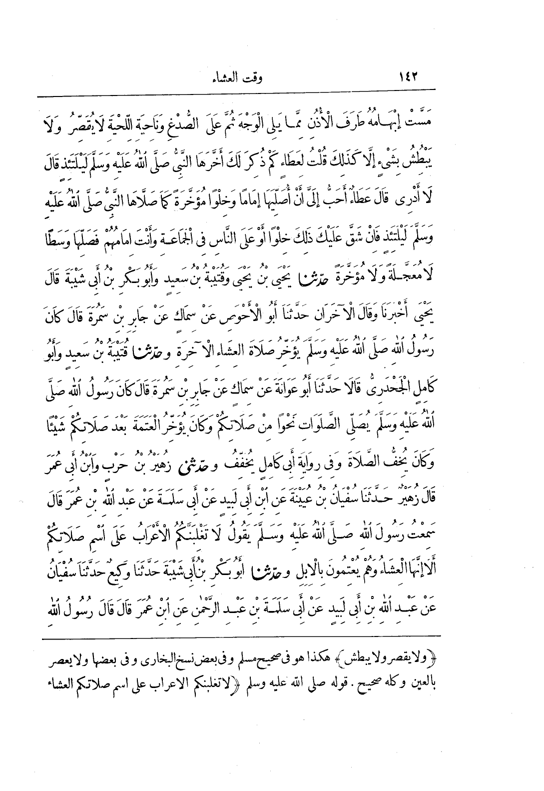 وَلَا يُقَصِّرُ وَلَا يَبْطِشُ هَكَذَا هُوَ فِي صَحِيحِ مُسْلِمٍ وَفِي بَعْضِ نُسَخِ الْبُخَارِيِّ وَفِي بعضها ولا يعصر العين وَكُلُّهُ صَحِيحٌ قَوْلُهُ صَلَّى اللَّهُ عَلَيْهِ وَسَلَّمَ لَا تَغْلِبَنَّكُمُ الْأَعْرَابُ عَلَى اسْمِ صَلَاتِكُمُ الْعِشَاءِ