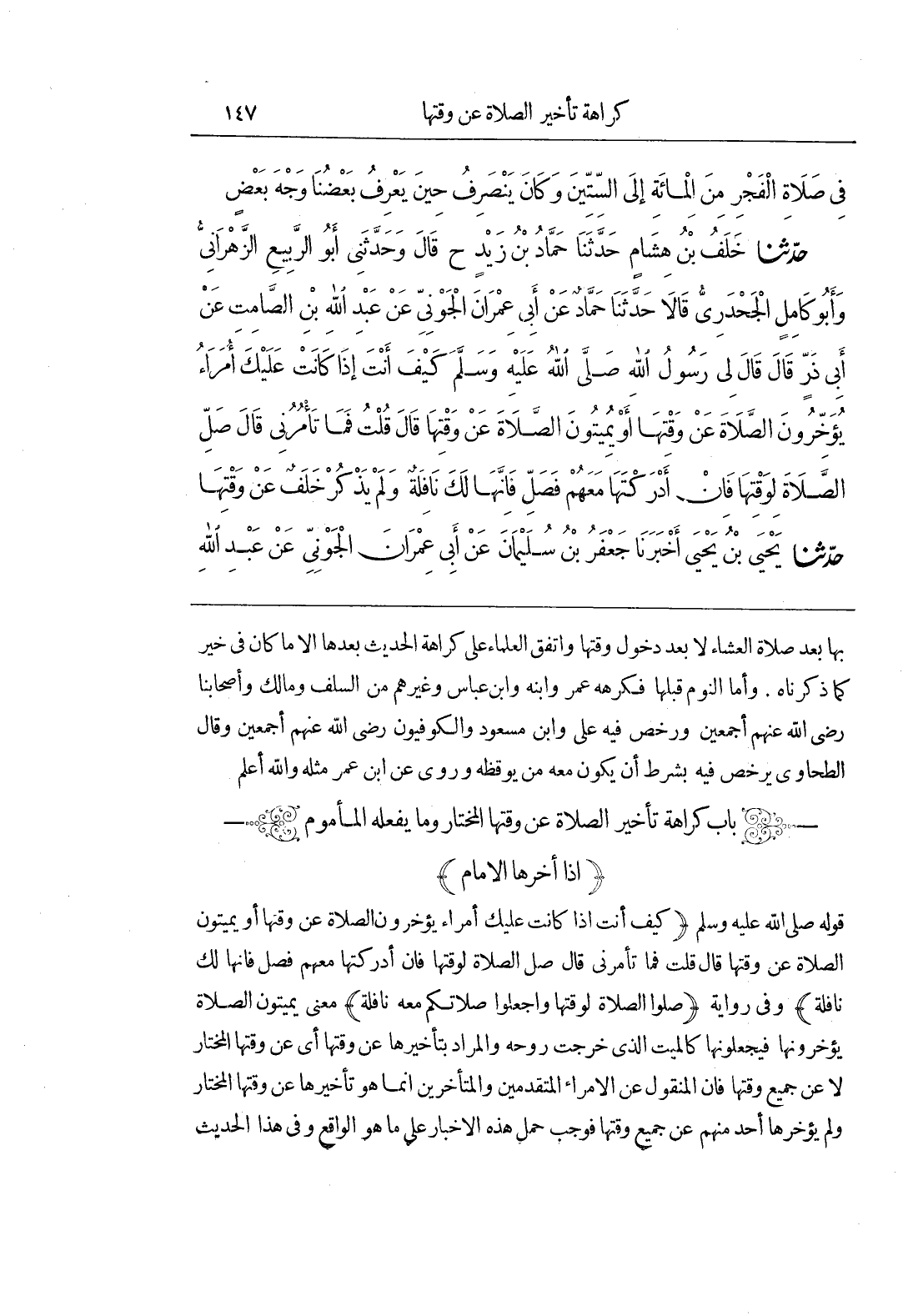 [648] قَوْلُهُ صَلَّى اللَّهُ عَلَيْهِ وَسَلَّمَ كَيْفَ أَنْتَ إِذَا كَانَتْ عَلَيْكَ أُمَرَاءُ يُؤَخِّرُونَ الصَّلَاةَ عَنْ وَقْتِهَا أَوْ يُمِيتُونَ الصَّلَاةَ عَنْ وَقْتِهَا قَالَ قُلْتُ فَمَا تَأْمُرُنِي قَالَ صَلِّ الصَّلَاةَ لِوَقْتِهَا فَإِنْ أَدْرَكْتَهَا مَعَهُمْ فَصَلِّ فَإِنَّهَا لَكَ نَافِلَةٌ وَفِي رِوَايَةٍ صَلُّوا الصَّلَاةَ لِوَقْتِهَا وَاجْعَلُوا صَلَاتَكُمْ مَعَهُ نَافِلَةً مَعْنَى يُمِيتُونَ الصَّلَاةَ يُؤَخِّرُونَهَا فَيَجْعَلُونَهَا كَالْمَيِّتِ الَّذِي خَرَجَتْ رُوحُهُ وَالْمُرَادُ بِتَأْخِيرِهَا عَنْ وَقْتِهَا أَيْ عَنْ وَقْتِهَا الْمُخْتَارِ لَا عَنْ جَمِيعِ وَقْتِهَا فَإِنَّ الْمَنْقُولَ عَنِ الْأُمَرَاءِ الْمُتَقَدِّمِينَ وَالْمُتَأَخِّرِينَ إِنَّمَا هُوَ تَأْخِيرُهَا عَنْ وَقْتِهَا الْمُخْتَارِ وَلَمْ يُؤَخِّرْهَا أَحَدٌ مِنْهُمْ عَنْ جَمِيعِ وَقْتِهَا فَوَجَبَ حَمْلُ هَذِهِ الْأَخْبَارِ عَلَى مَا هُوَ الْوَاقِعُ وَفِي هَذَا الحديث