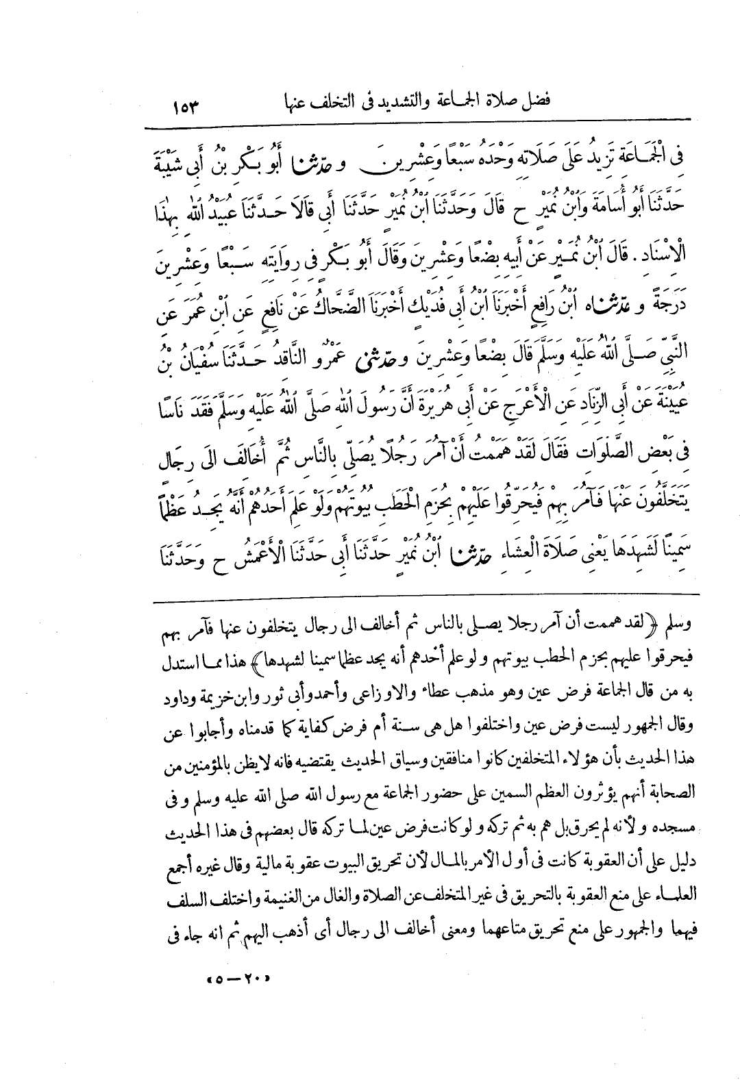 [651] لَقَدْ هَمَمْتُ أَنْ آمُرَ رَجُلًا يُصَلِّي بِالنَّاسِ ثُمَّ أُخَالِفَ إِلَى رِجَالٍ يَتَخَلَّفُونَ عَنْهَا فَآمُرَ بِهِمْ فَيُحَرِّقُوا عَلَيْهِمْ بِحُزَمِ الْحَطَبِ بُيُوتَهُمْ وَلَوْ عَلِمَ أَحَدُهُمْ أَنَّهُ يَجِدُ عَظْمًا سَمِينًا لَشَهِدَهَا هَذَا مِمَّا اسْتَدَلَّ بِهِ مَنْ قَالَ الْجَمَاعَةُ فَرْضُ عَيْنٍ وَهُوَ مَذْهَبُ عَطَاءٍ وَالْأَوْزَاعِيِّ وَأَحْمَدَ وأبي ثور وبن خُزَيْمَةَ وَدَاوُدَ وَقَالَ الْجُمْهُورُ لَيْسَتْ فَرْضَ عَيْنٍ وَاخْتَلَفُوا هَلْ هِيَ سُنَّةٌ أَمْ فَرْضُ كِفَايَةٍ كَمَا قَدَّمْنَاهُ وَأَجَابُوا عَنْ هَذَا الْحَدِيثِ بِأَنَّ هَؤُلَاءِ الْمُتَخَلِّفِينَ كَانُوا مُنَافِقِينَ وَسِيَاقُ الْحَدِيثِ يَقْتَضِيهِ فَإِنَّهُ لَا يُظَنُّ بِالْمُؤْمِنِينَ مِنَ الصَّحَابَةِ أَنَّهُمْ يُؤْثِرُونَ الْعَظْمَ السَّمِينَ عَلَى حُضُورِ الْجَمَاعَةِ مَعَ رَسُولِ اللَّهِ صَلَّى اللَّهُ عَلَيْهِ وَسَلَّمَ وفي مَسْجِدِهِ وَلِأَنَّهُ لَمْ يُحَرِّقْ بَلْ هَمَّ بِهِ ثُمَّ تَرَكَهُ وَلَوْ كَانَتْ فَرْضَ عَيْنٍ لَمَا تَرَكَهُ قَالَ بَعْضُهُمْ فِي هَذَا الْحَدِيثِ دَلِيلٌ عَلَى أَنَّ الْعُقُوبَةَ كَانَتْ فِي أَوَّلِ الْأَمْرِ بِالْمَالِ لِأَنَّ تَحْرِيقَ الْبُيُوتِ عُقُوبَةٌ مَالِيَّةٌ وَقَالَ غَيْرُهُ أَجْمَعَ الْعُلَمَاءُ عَلَى مَنْعِ الْعُقُوبَةِ بِالتَّحْرِيقِ فِي غَيْرِ الْمُتَخَلِّفِ عَنِ الصَّلَاةِ وَالْغَالِّ مِنَ الْغَنِيمَةِ وَاخْتَلَفَ السَّلَفُ فِيهِمَا وَالْجُمْهُورُ عَلَى مَنْعِ تَحْرِيقِ مَتَاعِهِمَا وَمَعْنَى أُخَالِفُ إِلَى رِجَالٍ أَيْ أَذْهَبُ إِلَيْهِمْ ثُمَّ إِنَّهُ جَاءَ فِي