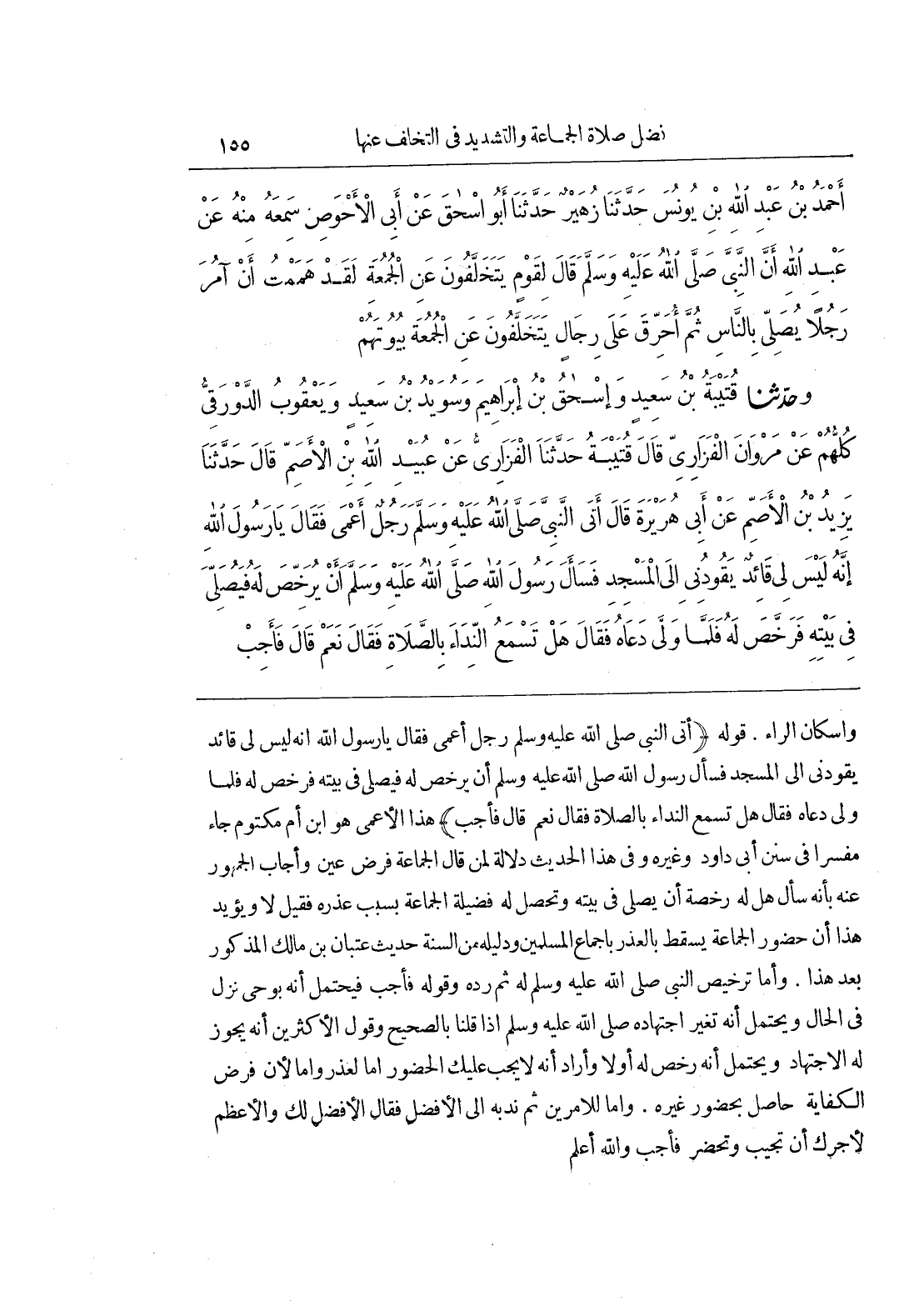 [653] قَوْلُهُ أَتَى النَّبِيَّ صَلَّى اللَّهُ عَلَيْهِ وَسَلَّمَ رَجُلٌ أَعْمَى فَقَالَ يَا رَسُولَ اللَّهِ إِنَّهُ لَيْسَ لِي قَائِدٌ يَقُودُنِي إِلَى الْمَسْجِدِ فَسَأَلَ رَسُولُ اللَّهِ صَلَّى اللَّهُ عَلَيْهِ وَسَلَّمَ أَنْ يُرَخِّصَ لَهُ فَيُصَلِّيَ فِي بَيْتِهِ فَرَخَّصَ لَهُ فَلَمَّا وَلَّى دَعَاهُ فَقَالَ هَلْ تَسْمَعُ النِّدَاءَ بِالصَّلَاةِ فَقَالَ نَعَمْ قَالَ فَأَجِبْ هذا الأعمى هو بن أُمِّ مَكْتُومٍ جَاءَ مُفَسَّرًا فِي سُنَنِ أَبِي دَاوُدَ وَغَيْرِهِ وَفِي هَذَا الْحَدِيثِ دَلَالَةٌ لِمَنْ قَالَ الْجَمَاعَةُ فَرْضُ عَيْنٍ وَأَجَابَ الْجُمْهُورُ عَنْهُ بِأَنَّهُ سَأَلَ هَلْ لَهُ رُخْصَةٌ أَنْ يُصَلِّيَ فِي بَيْتِهِ وَتَحْصُلُ لَهُ فَضِيلَةُ الْجَمَاعَةِ بِسَبَبِ عُذْرِهِ فَقِيلَ لَا وَيُؤَيِّدُ هَذَا أَنَّ حُضُورَ الْجَمَاعَةِ يَسْقُطُ بِالْعُذْرِ بِإِجْمَاعِ الْمُسْلِمِينَ وَدَلِيلُهُ مِنَ السُّنَّةِ حَدِيثُ عِتْبَانَ بْنِ مَالِكٍ الْمَذْكُورِ بَعْدَ هَذَا وَأَمَّا تَرْخِيصُ النَّبِيِّ صَلَّى اللَّهُ عَلَيْهِ وسلم له ثُمَّ رَدُّهُ وَقَوْلُهُ فَأَجِبْ فَيَحْتَمِلُ أَنَّهُ بِوَحْيٍ نَزَلَ فِي الْحَالِ وَيَحْتَمِلُ أَنَّهُ تَغَيَّرَ اجْتِهَادُهُ صَلَّى اللَّهُ عَلَيْهِ وَسَلَّمَ إِذَا قُلْنَا بِالصَّحِيحِ وَقَوْلُ الْأَكْثَرِينَ إِنَّهُ يَجُوزُ لَهُ الِاجْتِهَادُ وَيَحْتَمِلُ أَنَّهُ رَخَّصَ لَهُ أَوَّلًا وَأَرَادَ أَنَّهُ لَا يَجِبُ عَلَيْكَ الْحُضُورُ إِمَّا لِعُذْرٍ وَإِمَّا لِأَنَّ فرض الكفاية حاصل بحضور غيره واما للأمرين ثُمَّ نَدَبَهُ إِلَى الْأَفْضَلِ فَقَالَ الْأَفْضَلُ لَكَ وَالْأَعْظَمُ لِأَجْرِكَ أَنْ تُجِيبَ وَتَحْضُرَ فَأَجِبْ وَاللَّهُ أعلم