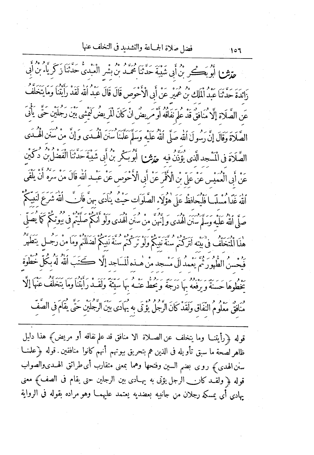 [654] قَوْلُهُ رَأَيْتُنَا وَمَا يَتَخَلَّفُ عَنِ الصَّلَاةِ إِلَّا مُنَافِقٌ قَدْ عُلِمَ نِفَاقُهُ أَوْ مَرِيضٌ هَذَا دَلِيلٌ ظَاهِرٌ لِصِحَّةِ مَا سَبَقَ تَأْوِيلُهُ فِي الَّذِينَ هَمَّ بِتَحْرِيقِ بُيُوتِهِمِ أَنَّهُمْ كَانُوا مُنَافِقِينَ قَوْلُهُ عَلَّمَنَا سُنَنَ الْهُدَى رُوِيَ بِضَمِّ السِّينِ وَفَتْحِهَا وَهُمَا بِمَعْنًى مُتَقَارِبٍ أَيْ طَرَائِقِ الْهُدَى وَالصَّوَابِ قَوْلُهُ وَلَقَدْ كَانَ الرَّجُلُ يُؤْتَى بِهِ يُهَادَى بَيْنَ الرَّجُلَيْنِ حَتَّى يُقَامَ فِي الصَّفِّ مَعْنَى يُهَادَى أَيْ يُمْسِكُهُ رَجُلَانِ مِنْ جَانِبَيْهِ بِعَضُدَيْهِ يَعْتَمِدُ عَلَيْهِمَا وَهُوَ مُرَادُهُ بِقَوْلِهِ فِي الرواية