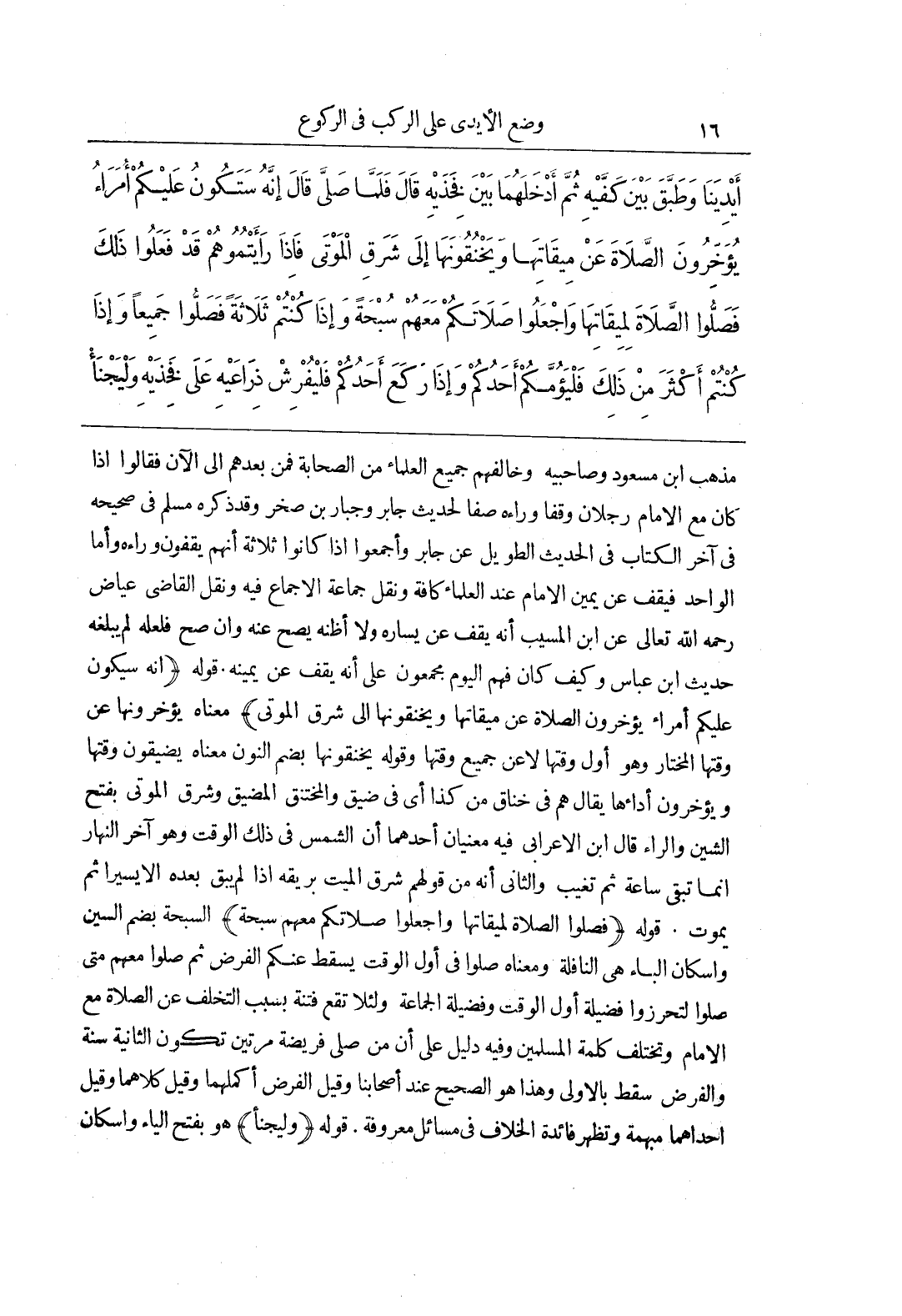 مذهب بن مَسْعُودٍ وَصَاحِبَيْهِ وَخَالَفَهُمْ جَمِيعُ الْعُلَمَاءِ مِنَ الصَّحَابَةِ فَمَنْ بَعْدَهُمْ إِلَى الْآنَ فَقَالُوا إِذَا كَانَ مَعَ الْإِمَامِ رَجُلَانِ وَقَفَا وَرَاءَهُ صَفًّا لِحَدِيثِ جابر وجبار بْنِ صَخْرٍ وَقَدْ ذَكَرَهُ مُسْلِمٌ فِي صَحِيحِهِ فِي آخِرِ الْكِتَابِ فِي الْحَدِيثِ الطَّوِيلِ عَنْ جَابِرٍ وَأَجْمَعُوا إِذَا كَانُوا ثَلَاثَةً أَنَّهُمْ يَقِفُونَ وَرَاءَهُ وَأَمَّا الْوَاحِدُ فَيَقِفُ عَنْ يَمِينِ الْإِمَامِ عِنْدَ الْعُلَمَاءِ كَافَّةً وَنَقَلَ جَمَاعَةٌ الْإِجْمَاعَ فِيهِ وَنَقَلَ الْقَاضِي عِيَاضٌ رَحِمَهُ اللَّهُ تَعَالَى عَنِ بن الْمُسَيِّبِ أَنَّهُ يَقِفُ عَنْ يَسَارِهِ وَلَا أَظُنُّهُ يَصِحُّ عَنْهُ وَإِنْ صَحَّ فَلَعَلَّهُ لَمْ يَبْلُغْهُ حديث بن عَبَّاسٍ وَكَيْفِ كَانَ فَهُمُ الْيَوْمَ مُجْمِعُونَ عَلَى أَنَّهُ يَقِفُ عَنْ يَمِينِهِ قَوْلُهُ إِنَّهُ سَيَكُونُ عَلَيْكُمْ أُمَرَاءُ يُؤَخِّرُونَ الصَّلَاةَ عَنْ مِيقَاتِهَا وَيَخْنُقُونَهَا إِلَى شَرَقِ الْمَوْتَى مَعْنَاهُ يُؤَخِّرُونَهَا عَنْ وَقْتِهَا الْمُخْتَارِ وَهُوَ أَوَّلُ وَقْتِهَا لَا عَنْ جَمِيعِ وَقْتِهَا وَقَوْلُهُ يَخْنُقُونَهَا بِضَمِّ النُّونِ مَعْنَاهُ يُضَيِّقُونَ وَقْتَهَا وَيُؤَخِّرُونَ أَدَاءَهَا يُقَالُ هُمْ فِي خِنَاقٍ مِنْ كَذَا أَيْ فِي ضِيقٍ وَالْمُخْتَنِقُ الْمَضِيقُ وشرق الموتى بفتح الشين والراء قال بن الْأَعْرَابِيِّ فِيهِ مَعْنَيَانِ أَحَدُهُمَا أَنَّ الشَّمْسَ فِي ذَلِكَ الْوَقْتِ وَهُوَ آخِرُ النَّهَارِ إِنَّمَا تَبْقَى سَاعَةً ثُمَّ تَغِيبُ وَالثَّانِي أَنَّهُ مِنْ قَوْلِهِمْ شَرَقُ الْمَيِّتِ بِرِيقِهِ إِذَا لَمْ يَبْقَ بَعْدَهُ إِلَّا يَسِيرًا ثُمَّ يَمُوتُ قَوْلُهُ فَصَلُّوا الصَّلَاةَ لِمِيقَاتِهَا وَاجْعَلُوا صَلَاتَكُمْ مَعَهُمْ سُبْحَةً السُّبْحَةُ بِضَمِّ السِّينِ وَإِسْكَانِ الْبَاءِ هِيَ النَّافِلَةُ وَمَعْنَاهُ صَلُّوا فِي أَوَّلِ الْوَقْتِ يَسْقُطُ عَنْكُمُ الْفَرْضُ ثُمَّ صَلُّوا مَعَهُمْ مَتَى صَلَّوْا لِتُحْرِزُوا فَضِيلَةَ أَوَّلِ الْوَقْتِ وَفَضِيلَةَ الْجَمَاعَةِ وَلِئَلَّا تَقَعَ فِتْنَةٌ بِسَبَبِ التَّخَلُّفِ عَنِ الصَّلَاةِ مَعَ الْإِمَامِ وَتَخْتَلِفُ كَلِمَةُ الْمُسْلِمِينَ وَفِيهِ دَلِيلٌ عَلَى أَنَّ مَنْ صَلَّى فريضة مرتين تكون الثانية سنة وَالْفَرْضُ سَقْطٌ بِالْأَوْلَى وَهَذَا هُوَ الصَّحِيحُ عِنْدَ أَصْحَابِنَا وَقِيلَ الْفَرْضُ أَكْمَلُهُمَا وَقِيلَ كِلَاهُمَا وَقِيلَ إِحْدَاهُمَا مُبْهَمَةٌ وَتَظْهَرُ فَائِدَةُ الْخِلَافِ فِي مَسَائِلَ مَعْرُوفَةٍ قَوْلُهُ وَلْيَجْنَأْ هُوَ بِفَتْحِ الْيَاءِ وَإِسْكَانِ