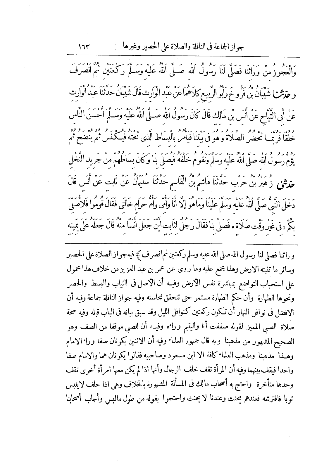 وَرَائِنَا فَصَلَّى لَنَا رَسُولُ اللَّهِ صَلَّى اللَّهُ عَلَيْهِ وَسَلَّمَ رَكْعَتَيْنِ ثُمَّ انْصَرَفَ فِيهِ جَوَازُ الصَّلَاةِ عَلَى الْحَصِيرِ وَسَائِرِ مَا تُنْبِتُهُ الْأَرْضُ وَهَذَا مُجْمَعٌ عَلَيْهِ وَمَا رُوِيَ عَنْ عُمَرَ بْنِ عَبْدِ الْعَزِيزِ مِنْ خِلَافِ هَذَا مَحْمُولٌ عَلَى اسْتِحْبَابِ التَّوَاضُعِ بِمُبَاشَرَةِ نَفْسِ الْأَرْضِ وَفِيهِ أَنَّ الْأَصْلَ فِي الثِّيَابِ وَالْبُسُطِ وَالْحُصْرِ وَنَحْوِهَا الطَّهَارَةُ وَأَنَّ حُكْمَ الطَّهَارَةِ مُسْتَمِرٌّ حَتَّى تَتَحَقَّقَ نَجَاسَتُهُ وَفِيهِ جَوَازُ النَّافِلَةِ جَمَاعَةً وَفِيهِ أَنَّ الْأَفْضَلَ فِي نَوَافِلِ النَّهَارِ أَنْ تَكُونَ رَكْعَتَيْنِ كَنَوَافِلِ اللَّيْلِ وَقَدْ سَبَقَ بَيَانُهُ فِي الْبَابِ قَبْلَهُ وَفِيهِ صِحَّةُ صَلَاةِ الصَّبِيِّ الْمُمَيِّزِ لِقَوْلِهِ صَفَفْتُ أَنَا وَالْيَتِيمُ وَرَاءَهُ وَفِيهِ أَنَّ لِلصَّبِيِّ مَوْقِفًا مِنَ الصَّفِّ وَهُوَ الصَّحِيحُ الْمَشْهُورُ مِنْ مَذْهَبِنَا وَبِهِ قَالَ جُمْهُورُ الْعُلَمَاءِ وَفِيهِ أَنَّ الِاثْنَيْنِ يُكَوِّنَانِ صَفًّا وَرَاءَ الْإِمَامِ وَهَذَا مَذْهَبُنَا ومذهب العلماء كافة الا بن مَسْعُودٍ وَصَاحِبَيْهِ فَقَالُوا يُكَوِّنَانِ هُمَا وَالْإِمَامُ صَفًّا وَاحِدًا فَيَقِفُ بَيْنَهُمَا وَفِيهِ أَنَّ الْمَرْأَةَ تَقِفُ خَلْفَ الرِّجَالِ وَأَنَّهَا إِذَا لَمْ يَكُنْ مَعَهَا امْرَأَةٌ أُخْرَى تَقِفُ وَحْدَهَا مُتَأَخِّرَةً وَاحْتَجَّ بِهِ أَصْحَابُ مَالِكٍ فِي الْمَسْأَلَةِ الْمَشْهُورَةِ بِالْخِلَافِ وَهِيَ إِذَا حَلَفَ لَا يَلْبَسُ ثَوْبًا فَافْتَرَشَهُ فَعِنْدَهُمْ يَحْنَثُ وَعِنْدَنَا لَا يَحْنَثُ وَاحْتَجُّوا بِقَوْلِهِ مِنْ طُولِ مَا لُبِسَ وَأَجَابَ أَصْحَابُنَا