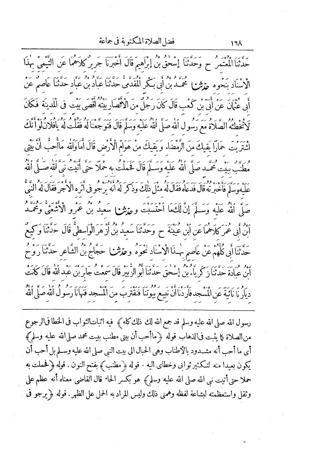 رَسُولُ اللَّهِ صَلَّى اللَّهُ عَلَيْهِ وَسَلَّمَ قَدْ جَمَعَ اللَّهُ لَكَ ذَلِكَ كُلَّهُ فِيهِ إِثْبَاتُ الثَّوَابِ فِي الْخُطَا فِي الرُّجُوعِ مِنَ الصَّلَاةِ كَمَا يَثْبُتُ فِي الذَّهَابِ قَوْلُهُ مَا أُحِبُّ أَنَّ بَيْتِي مُطَنَّبٌ بِبَيْتِ مُحَمَّدٍ صَلَّى اللَّهُ عَلَيْهِ وَسَلَّمَ أَيْ مَا أُحِبُّ أَنَّهُ مَشْدُودٌ بِالْأَطْنَابِ وَهِيَ الْحِبَالُ إِلَى بَيْتِ النَّبِيِّ صَلَّى اللَّهُ عَلَيْهِ وَسَلَّمَ بَلْ أُحِبُّ أَنْ يَكُونَ بَعِيدًا مِنْهُ لِتَكْثِيرِ ثَوَابِي وَخُطَايَ إِلَيْهِ قَوْلُهُ مُطَنَّبٌ بِفَتْحِ النُّونِ قَوْلُهُ فَحَمَلْتُ بِهِ حِمْلًا حَتَّى أَتَيْتُ نَبِيَّ اللَّهِ صَلَّى اللَّهُ عَلَيْهِ وَسَلَّمَ هُوَ بِكَسْرِ الْحَاءِ قَالَ الْقَاضِي مَعْنَاهُ أَنَّهُ عَظُمَ عَلَيَّ وَثَقُلَ وَاسْتَعْظَمْتُهُ لِبَشَاعَةِ لَفْظِهِ وَهَمَّنِي ذَلِكَ وَلَيْسَ الْمُرَادُ بِهِ الْحَمْلُ عَلَى الظَّهْرِ قَوْلُهُ يَرْجُو فِي