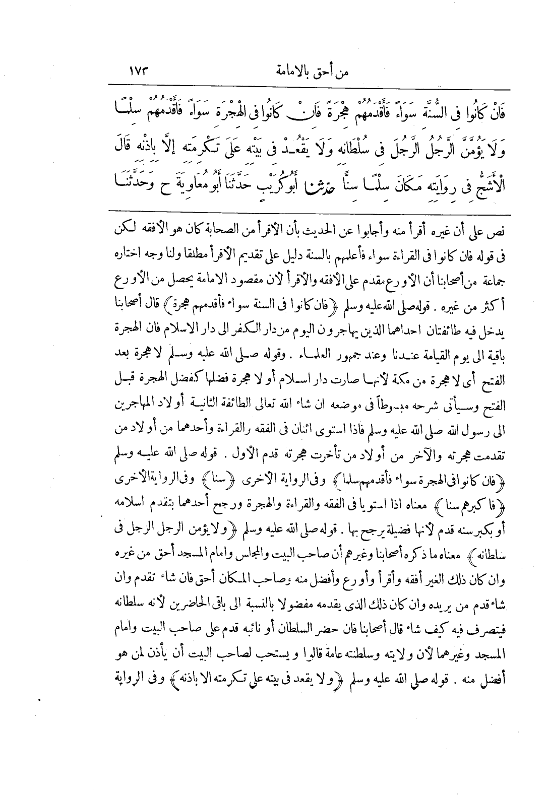نَصَّ عَلَى أَنَّ غَيْرَهُ أَقْرَأُ مِنْهُ وَأَجَابُوا عَنِ الْحَدِيثِ بِأَنَّ الْأَقْرَأَ مِنَ الصَّحَابَةِ كَانَ هُوَ الْأَفْقَهُ لَكِنَّ فِي قَوْلِهِ فَإِنْ كَانُوا فِي الْقِرَاءَةِ سَوَاءً فَأَعْلَمُهُمْ بِالسُّنَّةِ دَلِيلٌ عَلَى تَقْدِيمِ الْأَقْرَأِ مُطْلَقًا وَلَنَا وَجْهٌ اخْتَارَهُ جَمَاعَةٌ مِنْ أَصْحَابِنَا أَنَّ الْأَوْرَعَ مُقَدَّمٌ عَلَى الْأَفْقَهِ وَالْأَقْرَأِ لِأَنَّ مَقْصُودَ الْإِمَامَةِ يَحْصُلُ مِنَ الْأَوْرَعِ أَكْثَرَ مِنْ غَيْرِهِ قَوْلُهُ صَلَّى اللَّهُ عَلَيْهِ وَسَلَّمَ فَإِنْ كَانُوا فِي السُّنَّةِ سَوَاءً فَأَقْدَمُهُمْ هِجْرَةً قَالَ أَصْحَابُنَا يَدْخُلُ فِيهِ طَائِفَتَانِ إِحْدَاهُمَا الَّذِينَ يُهَاجِرُونَ الْيَوْمَ مِنْ دَارِ الْكُفْرِ إِلَى دَارِ الْإِسْلَامِ فَإِنَّ الْهِجْرَةَ بَاقِيَةٌ إِلَى يَوْمِ الْقِيَامَةِ عِنْدَنَا وَعِنْدَ جُمْهُورِ الْعُلَمَاءِ وَقَوْلُهُ صَلَّى اللَّهُ عَلَيْهِ وَسَلَّمَ لَا هِجْرَةَ بَعْدَ الْفَتْحِ أَيْ لَا هِجْرَةَ مِنْ مَكَّةَ لِأَنَّهَا صَارَتْ دار اسلام أَوْ لَا هِجْرَةَ فَضْلُهَا كَفَضْلِ الْهِجْرَةِ قَبْلَ الفتح وسيأتي شرحه مَبْسُوطًا فِي مَوْضِعِهِ إِنْ شَاءَ اللَّهُ تَعَالَى الطَّائِفَةُ الثَّانِيَةُ أَوْلَادُ الْمُهَاجِرِينَ إِلَى رَسُولِ اللَّهِ صَلَّى اللَّهُ عَلَيْهِ وَسَلَّمَ فَإِذَا اسْتَوَى اثْنَانِ فِي الْفِقْهِ وَالْقِرَاءَةِ وَأَحَدُهُمَا مِنْ أَوْلَادِ مَنْ تَقَدَّمَتْ هِجْرَتُهُ وَالْآخَرُ مِنْ أَوْلَادِ مَنْ تَأَخَّرَتْ هِجْرَتُهُ قُدِّمَ الْأَوَّلُ قَوْلُهُ صَلَّى اللَّهُ عَلَيْهِ وَسَلَّمَ فَإِنْ كَانُوا فِي الْهِجْرَةِ سَوَاءً فَأَقْدَمُهُمْ سِلْمًا وَفِي الرِّوَايَةِ الْأُخْرَى سِنًّا وَفِي الرِّوَايَةِ الْأُخْرَى فَأَكْبَرُهُمْ سِنًّا مَعْنَاهُ إِذَا اسْتَوَيَا فِي الْفِقْهِ وَالْقِرَاءَةِ وَالْهِجْرَةِ وَرَجَحَ أَحَدُهُمَا بِتَقَدُّمِ إِسْلَامِهِ أَوْ بِكِبَرِ سِنِّهِ قُدِّمَ لِأَنَّهَا فَضِيلَةٌ يُرَجَّحُ بِهَا قَوْلُهُ صَلَّى اللَّهُ عَلَيْهِ وَسَلَّمَ وَلَا يَؤُمَّنَّ الرَّجُلُ الرَّجُلَ فِي سُلْطَانِهِ مَعْنَاهُ مَا ذَكَرَهُ أَصْحَابُنَا وَغَيْرُهُمْ أَنَّ صَاحِبَ الْبَيْتِ وَالْمَجْلِسِ وَإِمَامَ الْمَسْجِدِ أَحَقُّ مِنْ غَيْرِهِ وَإِنْ كَانَ ذَلِكَ الْغَيْرُ أَفْقَهَ وَأَقْرَأَ وَأَوْرَعَ وَأَفْضَلَ مِنْهُ وَصَاحِبُ الْمَكَانِ أَحَقُّ فَإِنْ شَاءَ تَقَدَّمَ وَإِنْ شَاءَ قَدَّمَ مَنْ يُرِيدُهُ وَإِنْ كَانَ ذَلِكَ الَّذِي يُقَدِّمُهُ مَفْضُولًا بِالنِّسْبَةِ إِلَى بَاقِي الْحَاضِرِينَ لأنه سلطانه فيتصرف فيه كيف شاء قال أَصْحَابُنَا فَإِنْ حَضَرَ السُّلْطَانُ أَوْ نَائِبُهُ قُدِّمَ عَلَى صَاحِبِ الْبَيْتِ وَإِمَامِ الْمَسْجِدِ وَغَيْرِهِمَا لِأَنَّ وِلَايَتَهُ وَسَلْطَنَتَهُ عَامَّةٌ قَالُوا وَيُسْتَحَبُّ لِصَاحِبِ الْبَيْتِ أَنْ يَأْذَنَ لِمَنْ هُوَ أَفْضَلُ مِنْهُ قَوْلُهُ صَلَّى اللَّهُ عَلَيْهِ وَسَلَّمَ وَلَا يَقْعُدْ فِي بَيْتِهِ عَلَى تَكْرِمَتِهِ إِلَّا بِإِذْنِهِ وَفِي الرِّوَايَةِ