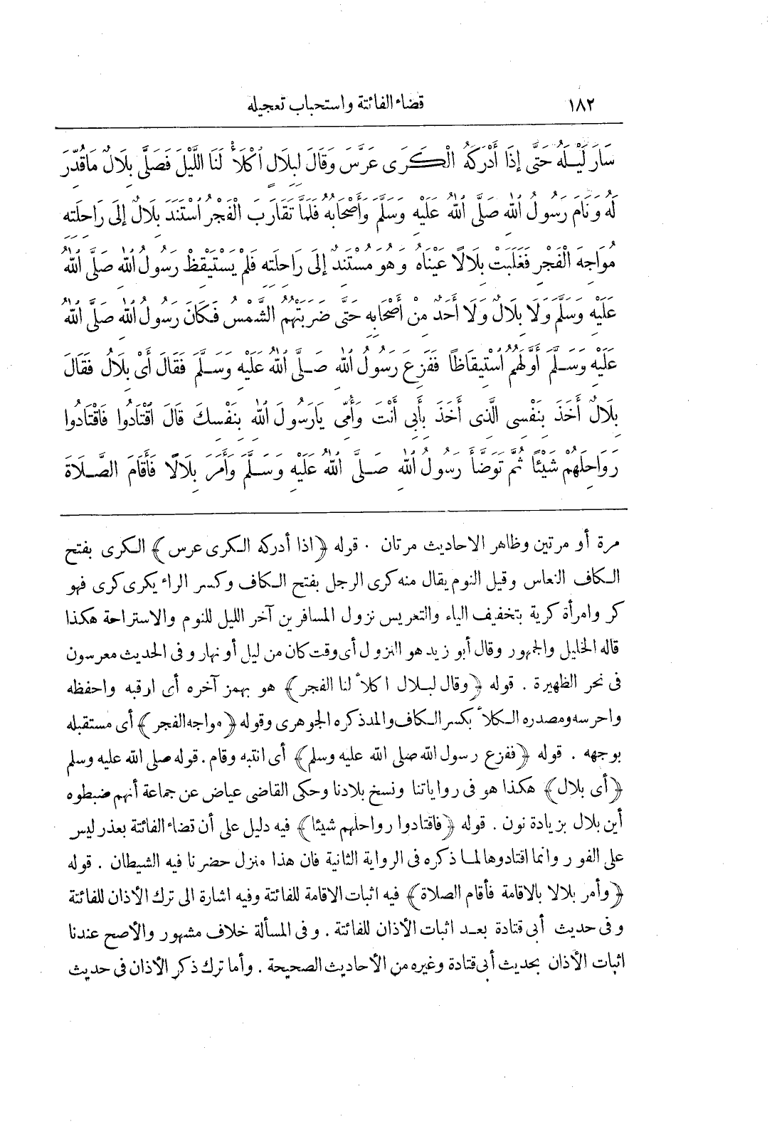 مَرَّةً أَوْ مَرَّتَيْنِ وَظَاهِرُ الْأَحَادِيثِ مَرَّتَانِ قَوْلُهُ إِذَا أَدْرَكَهُ الْكَرَى عَرَّسَ الْكَرَى بِفَتْحِ الْكَافِ النُّعَاسُ وَقِيلَ النَّوْمُ يُقَالُ مِنْهُ كَرِيَ الرَّجُلُ بِفَتْحِ الْكَافِ وَكَسْرِ الرَّاءِ يَكْرِي كَرًى فَهُوَ كَرٍ وَامْرَأَةٌ كَرِيَةٌ بِتَخْفِيفِ الْيَاءِ وَالتَّعْرِيسُ نُزُولُ الْمُسَافِرِينَ آخِرَ اللَّيْلِ لِلنَّوْمِ وَالِاسْتِرَاحَةِ هَكَذَا قَالَهُ الْخَلِيلُ وَالْجُمْهُورُ وَقَالَ أَبُو زَيْدٍ هُوَ النُّزُولُ أَيَّ وَقْتٍ كَانَ مِنْ لَيْلٍ أَوْ نَهَارٍ وَفِي الْحَدِيثِ مُعَرِّسُونَ فِي نَحْرِ الظَّهِيرَةِ قَوْلُهُ وَقَالَ لِبِلَالٍ اكْلَأْ لَنَا الْفَجْرَ هُوَ بِهَمْزِ آخره أي ارقبه واحفظه واحرسه ومصدره الكلأ بِكَسْرِ الْكَافِ وَالْمَدِّ ذَكَرَهُ الْجَوْهَرِيُّ وَقَوْلُهُ مُوَاجِهُ الْفَجْرِ أَيْ مُسْتَقْبِلُهُ بِوَجْهِهِ قَوْلُهُ فَفَزِعَ رَسُولُ اللَّهِ صَلَّى اللَّهُ عَلَيْهِ وَسَلَّمَ أَيِ انْتَبَهَ وَقَامَ قَوْلُهُ صَلَّى اللَّهُ عَلَيْهِ وَسَلَّمَ أَيْ بِلَالُ هَكَذَا هُوَ فِي رِوَايَاتِنَا وَنُسَخِ بِلَادِنَا وَحَكَى الْقَاضِي عِيَاضٌ عَنْ جَمَاعَةٍ أَنَّهُمْ ضَبَطُوهُ أَيْنَ بِلَالٌ بِزِيَادَةِ نُونٍ قَوْلُهُ فَاقْتَادُوا رَوَاحِلَهُمْ شَيْئًا فِيهِ دَلِيلٌ عَلَى أَنَّ قَضَاءَ الْفَائِتَةِ بِعُذْرٍ لَيْسَ عَلَى الْفَوْرِ وَإِنَّمَا اقْتَادُوهَا لِمَا ذَكَرَهُ فِي الرِّوَايَةِ الثَّانِيَةِ فَإِنَّ هَذَا مَنْزِلٌ حَضَرَنَا فِيهِ الشَّيْطَانُ قَوْلُهُ وَأَمَرَ بِلَالًا بِالْإِقَامَةِ فَأَقَامَ الصَّلَاةَ فِيهِ إِثْبَاتُ الْإِقَامَةِ لِلْفَائِتَةِ وَفِيهِ إِشَارَةٌ إِلَى تَرْكِ الْأَذَانِ لِلْفَائِتَةِ وَفِي حَدِيثِ أَبِي قَتَادَةَ بَعْدَ إِثْبَاتِ الْأَذَانِ لِلْفَائِتَةِ وَفِي الْمَسْأَلَةِ خِلَافٌ مَشْهُورٌ وَالْأَصَحُّ عِنْدَنَا إِثْبَاتُ الْأَذَانِ بِحَدِيثِ أَبِي قَتَادَةَ وَغَيْرِهِ مِنَ الْأَحَادِيثِ الصَّحِيحَةِ وَأَمَّا تَرْكُ ذِكْرِ الْأَذَانِ فِي حَدِيثِ
