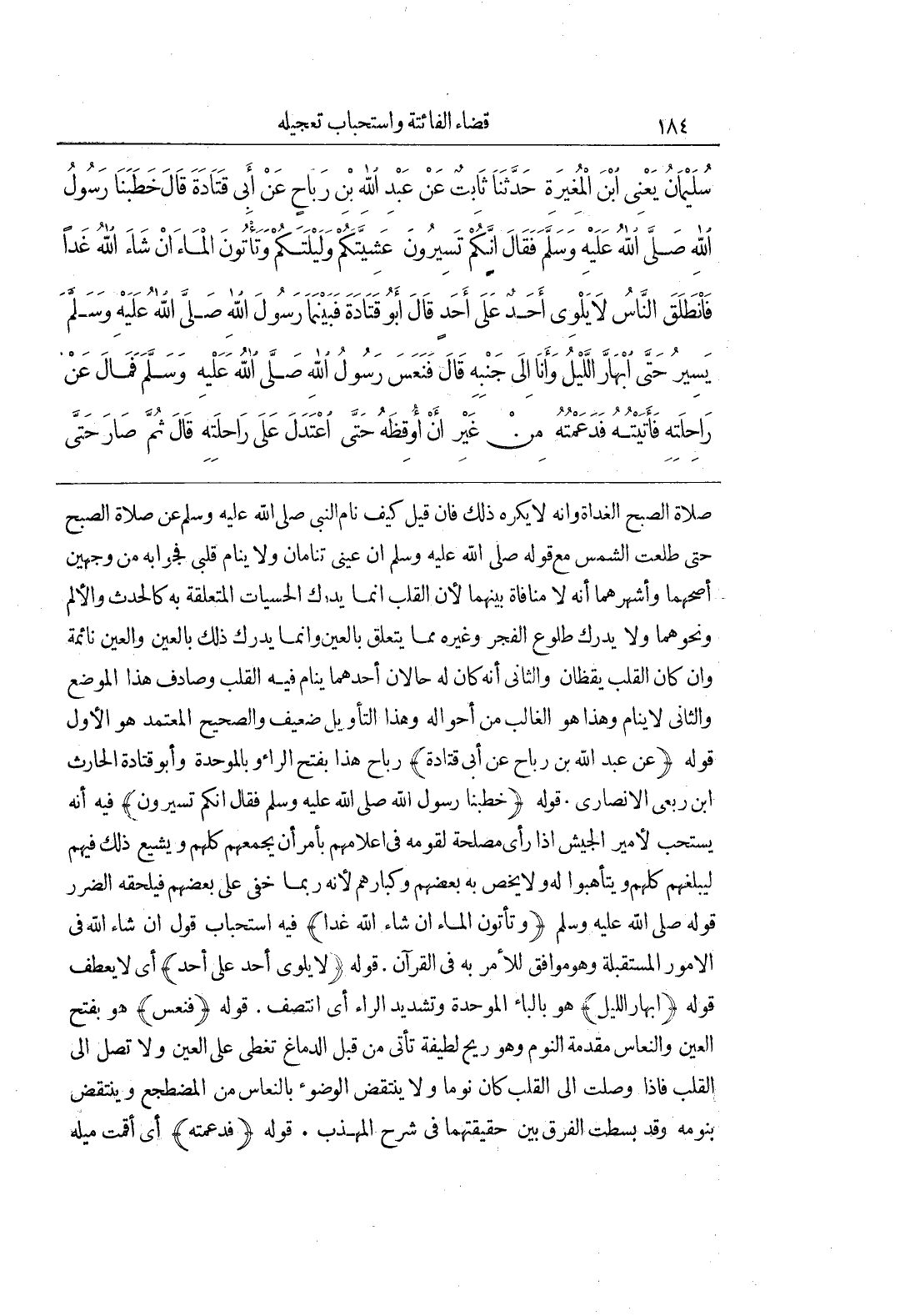 [681] قَوْلُهُ عَنْ عَبْدِ اللَّهِ بْنِ رَبَاحَ عَنْ أَبِي قَتَادَةَ رَبَاحٌ هَذَا بِفَتْحِ الرَّاءِ وَبِالْمُوَحَّدَةِ وَأَبُو قَتَادَةَ الْحَارِثُ بْنُ رِبْعِيٍّ الْأَنْصَارِيُّ قَوْلُهُ خَطَبَنَا رَسُولُ اللَّهِ صَلَّى اللَّهُ عَلَيْهِ وَسَلَّمَ فَقَالَ إِنَّكُمْ تَسِيرُونَ فِيهِ أَنَّهُ يُسْتَحَبُّ لِأَمِيرِ الْجَيْشِ إِذَا رَأَى مَصْلَحَةً لِقَوْمِهِ فِي إِعْلَامِهِمْ بِأَمْرٍ أَنْ يَجْمَعَهُمْ كُلَّهُمْ وَيُشِيعَ ذَلِكَ فِيهِمْ لِيُبَلِّغَهُمْ كُلَّهُمْ وَيَتَأَهَّبُوا لَهُ وَلَا يَخُصُّ بِهِ بَعْضَهُمْ وَكِبَارَهُمْ لِأَنَّهُ رُبَّمَا خَفِيَ عَلَى بَعْضِهِمْ فَيَلْحَقُهُ الضَّرَرُ قَوْلُهُ صَلَّى اللَّهُ عَلَيْهِ وَسَلَّمَ وَتَأْتُونَ الْمَاءَ إِنْ شَاءَ اللَّهُ غَدًا فِيهِ اسْتِحْبَابُ قَوْلِ إِنْ شَاءَ اللَّهُ فِي الْأُمُورِ الْمُسْتَقْبَلَةِ وَهُوَ مُوَافِقٌ لِلْأَمْرِ بِهِ فِي الْقُرْآنِ قَوْلُهُ لَا يَلْوِي أَحَدٌ عَلَى أَحَدٍ أَيْ لَا يَعْطِفُ قَوْلُهُ ابْهَارَّ اللَّيْلُ هُوَ بِالْبَاءِ الْمُوَحَّدَةِ وَتَشْدِيدِ الرَّاءِ أَيِ انْتَصَفَ قَوْلُهُ فَنَعَسَ هُوَ بِفَتْحِ الْعَيْنِ وَالنُّعَاسُ مُقَدِّمَةُ النَّوْمِ وَهُوَ رِيحٌ لَطِيفَةٌ تَأْتِي مِنْ قِبَلِ الدِّمَاغِ تُغَطِّي عَلَى الْعَيْنِ وَلَا تَصِلُ إِلَى الْقَلْبِ فَإِذَا وَصَلَتْ إِلَى الْقَلْبِ كَانَ نَوْمًا وَلَا يُنْتَقَضُ الْوُضُوءُ بِالنُّعَاسِ مِنَ الْمُضْطَجِعِ وَيُنْتَقَضُ بِنَوْمِهِ وَقَدْ بَسَطْتُ الْفَرْقَ بَيْنَ حَقِيقَتِهِمَا فِي شَرْحِ الْمُهَذَّبِ قَوْلُهُ فَدَعَمْتُهُ أَيْ أَقَمْتُ مَيْلَهُ