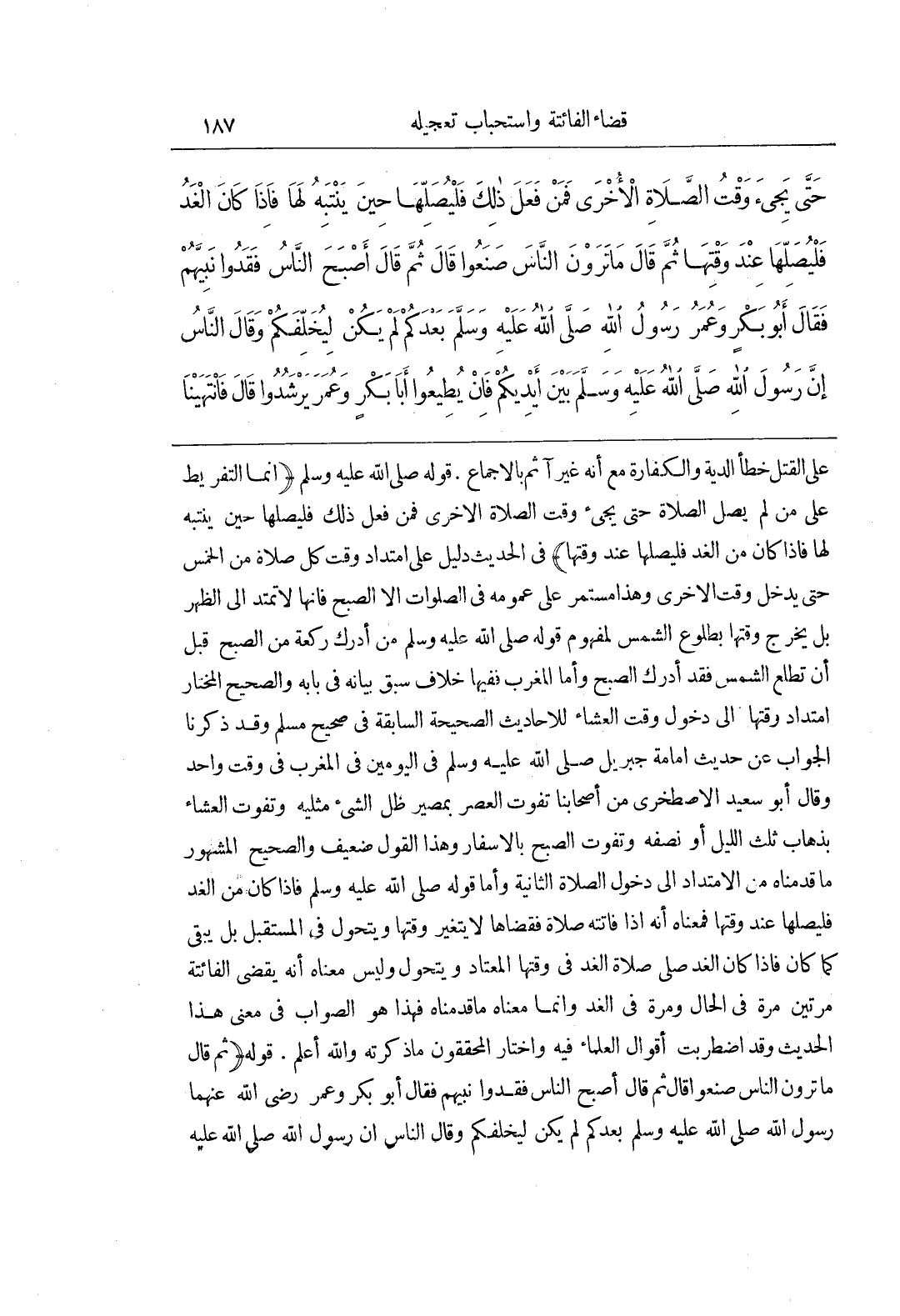 عَلَى الْقَتْلِ خَطَأً الدِّيَةَ وَالْكَفَّارَةَ مَعَ أَنَّهُ غَيْرُ آثِمٍ بِالْإِجْمَاعِ قَوْلُهُ صَلَّى اللَّهُ عَلَيْهِ وَسَلَّمَ إِنَّمَا التَّفْرِيطُ عَلَى مَنْ لَمْ يُصَلِّ الصَّلَاةَ حَتَّى يَجِيءَ وَقْتُ الصَّلَاةِ الْأُخْرَى فَمَنْ فَعَلَ ذَلِكَ فَلْيُصَلِّهَا حِينَ يَنْتَبِهُ لَهَا فَإِذَا كَانَ مِنَ الْغَدِ فَلْيُصَلِّهَا عِنْدَ وَقْتِهَا فِي الْحَدِيثِ دَلِيلٌ عَلَى امْتِدَادِ وَقْتِ كُلِّ صَلَاةٍ مِنَ الْخَمْسِ حَتَّى يَدْخُلَ وَقْتُ الْأُخْرَى وَهَذَا مُسْتَمِرٌّ عَلَى عُمُومِهِ فِي الصَّلَوَاتِ إِلَّا الصُّبْحَ فَإِنَّهَا لَا تَمْتَدُّ إِلَى الظُّهْرِ بَلْ يَخْرُجُ وَقْتُهَا بِطُلُوعِ الشَّمْسِ لِمَفْهُومِ قَوْلِهِ صَلَّى اللَّهُ عَلَيْهِ وَسَلَّمَ مَنْ أَدْرَكَ رَكْعَةً مِنَ الصُّبْحِ قَبْلَ أَنْ تَطْلُعَ الشَّمْسُ فَقَدْ أَدْرَكَ الصُّبْحَ وَأَمَّا الْمَغْرِبُ فَفِيهَا خِلَافٌ سَبَقَ بَيَانُهُ فِي بَابِهِ وَالصَّحِيحُ الْمُخْتَارُ امْتِدَادُ وَقْتِهَا إِلَى دُخُولِ وَقْتِ الْعِشَاءِ لِلْأَحَادِيثِ الصَّحِيحَةِ السَّابِقَةِ فِي صَحِيحِ مُسْلِمٍ وَقَدْ ذَكَرْنَا الْجَوَابَ عَنْ حَدِيثِ إِمَامَةِ جِبْرِيلَ صَلَّى اللَّهُ عَلَيْهِ وَسَلَّمَ فِي الْيَوْمَيْنِ فِي الْمَغْرِبِ فِي وَقْتٍ وَاحِدٍ وَقَالَ أَبُو سَعِيدٍ الْإِصْطَخْرِيُّ مِنْ أَصْحَابِنَا تَفُوتُ الْعَصْرُ بِمَصِيرِ ظِلِّ الشَّيْءِ مِثْلَيْهِ وَتَفُوتُ الْعِشَاءُ بِذَهَابِ ثُلُثِ اللَّيْلِ أَوْ نِصْفِهِ وَتَفُوتُ الصُّبْحُ بِالْإِسْفَارِ وَهَذَا الْقَوْلُ ضَعِيفٌ وَالصَّحِيحُ الْمَشْهُورُ مَا قَدَّمْنَاهُ مِنَ الِامْتِدَادِ إِلَى دُخُولِ الصَّلَاةِ الثَّانِيَةِ وَأَمَّا قَوْلُهُ صَلَّى اللَّهُ عَلَيْهِ وَسَلَّمَ فَإِذَا كَانَ مِنَ الْغَدِ فَلْيُصَلِّهَا عِنْدَ وَقْتِهَا فَمَعْنَاهُ أَنَّهُ إِذَا فَاتَتْهُ صَلَاةٌ فَقَضَاهَا لَا يَتَغَيَّرُ وَقْتُهَا وَيَتَحَوَّلُ فِي الْمُسْتَقْبَلِ بَلْ يَبْقَى كَمَا كَانَ فَإِذَا كَانَ الْغَدُ صَلَّى صَلَاةَ الْغَدِ فِي وَقْتِهَا الْمُعْتَادِ وَيَتَحَوَّلُ وَلَيْسَ مَعْنَاهُ أَنَّهُ يَقْضِي الْفَائِتَةَ مَرَّتَيْنِ مَرَّةً فِي الْحَالِ وَمَرَّةً فِي الْغَدِ وَإِنَّمَا مَعْنَاهُ مَا قَدَّمْنَاهُ فَهَذَا هُوَ الصَّوَابُ فِي مَعْنَى هَذَا الْحَدِيثِ وَقَدِ اضْطَرَبَتْ أَقْوَالُ الْعُلَمَاءِ فِيهِ وَاخْتَارَ الْمُحَقِّقُونَ مَا ذَكَرْتُهُ وَاللَّهُ أَعْلَمُ قَوْلُهُ ثُمَّ قَالَ مَا تَرَوْنَ النَّاسَ صَنَعُوا قَالَ ثُمَّ قَالَ أَصْبَحَ النَّاسُ فَقَدُوا نَبِيَّهُمْ فَقَالَ أَبُو بَكْرٍ وَعُمَرُ رَضِيَ اللَّهُ عَنْهُمَا رَسُولُ اللَّهِ صَلَّى اللَّهُ عَلَيْهِ وَسَلَّمَ بَعْدَكُمْ لَمْ يَكُنْ لِيُخَلِّفَكُمْ وَقَالَ النَّاسُ إِنَّ رسول الله صلى الله عليه وسلم