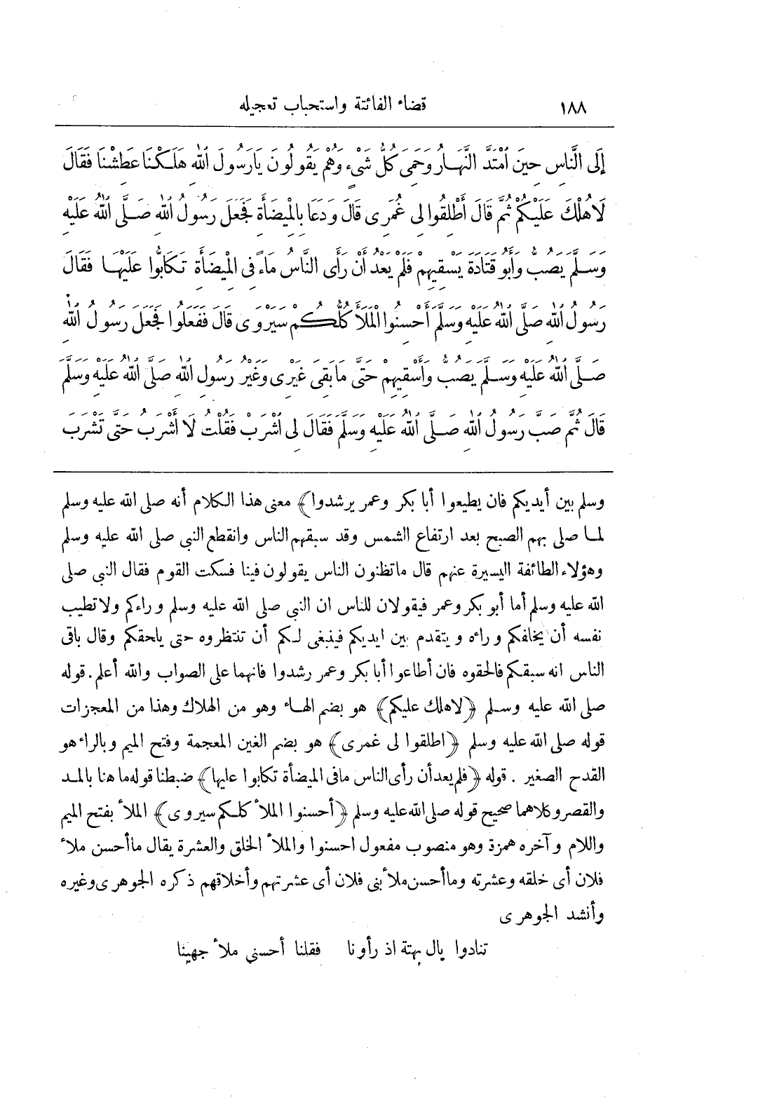 بَيْنَ أَيْدِيكُمْ فَإِنْ يُطِيعُوا أَبَا بَكْرٍ وَعُمَرَ يَرْشُدُوا مَعْنَى هَذَا الْكَلَامِ أَنَّهُ صَلَّى اللَّهُ عَلَيْهِ وَسَلَّمَ لَمَّا صَلَّى بِهِمْ الصُّبْحَ بَعْدَ ارْتِفَاعِ الشَّمْسِ وَقَدْ سَبَقَهُمُ النَّاسُ وَانْقَطَعَ النَّبِيُّ صَلَّى اللَّهُ عَلَيْهِ وَسَلَّمَ وَهَؤُلَاءِ الطَّائِفَةُ الْيَسِيرَةُ عَنْهُمْ قَالَ مَا تَظُنُّونَ النَّاسَ يَقُولُونَ فِينَا فَسَكَتَ الْقَوْمُ فَقَالَ النَّبِيُّ صَلَّى اللَّهُ عَلَيْهِ وَسَلَّمَ أَمَّا أَبُو بَكْرٍ وَعُمَرُ فَيَقُولَانِ لِلنَّاسِ أَنَّ النَّبِيَّ صَلَّى اللَّهُ عَلَيْهِ وَسَلَّمَ وَرَاءَكُمْ وَلَا تَطِيبُ نَفْسُهُ أَنْ يُخَلِّفَكُمْ وَرَاءَهُ وَيَتَقَدَّمَ بَيْنَ أَيْدِيكُمْ فَيَنْبَغِي لَكُمْ أَنْ تَنْتَظِرُوهُ حَتَّى يَلْحَقَكُمْ وَقَالَ بَاقِي النَّاسِ إِنَّهُ سَبَقَكُمْ فَالْحَقُوهُ فَإِنْ أَطَاعُوا أَبَا بَكْرٍ وَعُمَرَ رَشَدُوا فَإِنَّهُمَا عَلَى الصَّوَابِ وَاللَّهُ أَعْلَمُ قَوْلُهُ صَلَّى اللَّهُ عَلَيْهِ وَسَلَّمَ لَا هُلْكَ عَلَيْكُمْ هُوَ بِضَمِّ الْهَاءِ وَهُوَ مِنَ الْهَلَاكِ وَهَذَا مِنَ الْمُعْجِزَاتِ قَوْلُهُ صَلَّى اللَّهُ عَلَيْهِ وَسَلَّمَ أَطْلِقُوا لِي غُمَرِي هُوَ بِضَمِّ الْغَيْنِ الْمُعْجَمَةِ وَفَتْحِ الْمِيمِ وبالراء هو القدح الصغير قوه فَلَمْ يَعُدْ أَنْ رَأَى النَّاسُ مَا فِي الْمِيضَأَةِ تَكَابُّوا عَلَيْهَا ضَبَطْنَا قَوْلَهُ مَا هُنَا بِالْمَدِّ وَالْقَصْرِ وَكِلَاهُمَا صَحِيحٌ قَوْلُهُ صَلَّى اللَّهُ عَلَيْهِ وَسَلَّمَ أَحْسِنُوا الْمَلَأَ كُلُّكُمْ سَيَرْوَى الْمَلَأُ بِفَتْحِ الْمِيمِ وَاللَّامِ وَآخِرُهُ هَمْزَةٌ وَهُوَ مَنْصُوبٌ مَفْعُولُ أَحْسِنُوا وَالْمَلَأُ الْخُلُقُ وَالْعِشْرَةُ يُقَالُ مَا أَحْسَنَ مَلَأَ فُلَانٍ أَيْ خُلُقَهُ وَعِشْرَتَهُ وَمَا أَحْسَنَ مَلَأَ بَنِي فُلَانٍ أَيْ عِشْرَتَهُمْ وَأَخْلَاقَهُمْ ذكره الجوهري وغيره وأنشد الجوهري ... تنادوا بال بهتة إِذْ رَأَوْنَا ... فَقُلْنَا أَحْسَنِي مَلَأً جُهَيْنَا