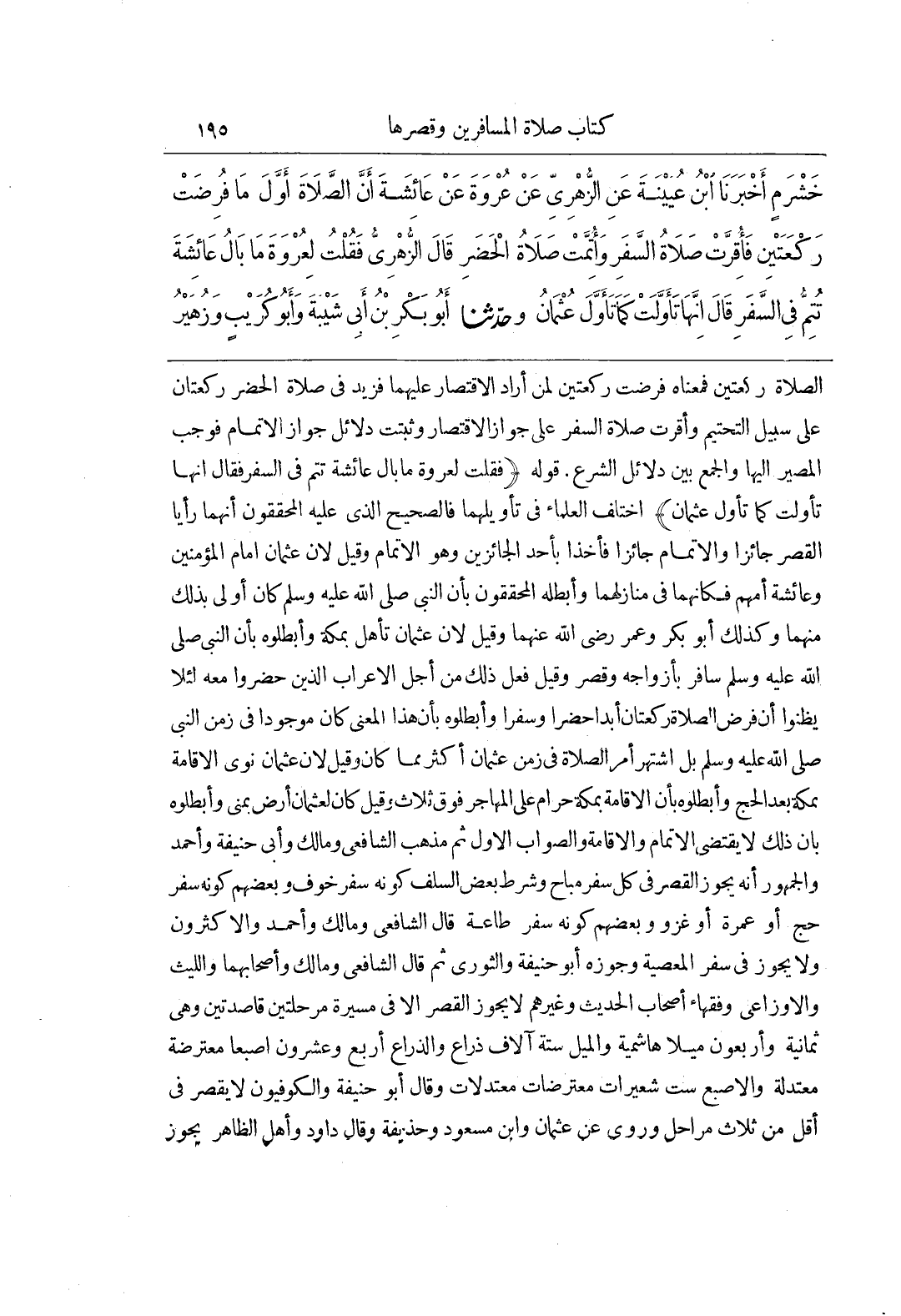 الصَّلَاةُ رَكْعَتَيْنِ فَمَعْنَاهُ فُرِضَتْ رَكْعَتَيْنِ لِمَنْ أَرَادَ الِاقْتِصَارَ عَلَيْهِمَا فَزِيدَ فِي صَلَاةِ الْحَضَرِ رَكْعَتَانِ عَلَى سَبِيلِ التَّحْتِيمِ وَأُقِرَّتْ صَلَاةُ السَّفَرِ عَلَى جَوَازِ الِاقْتِصَارِ وَثَبَتَتْ دَلَائِلُ جَوَازِ الْإِتْمَامِ فَوَجَبَ الْمَصِيرُ إِلَيْهَا وَالْجَمْعُ بَيْنَ دَلَائِلِ الشَّرْعِ قَوْلُهُ فَقُلْتُ لِعُرْوَةَ مَا بَالُ عَائِشَةَ تُتِمُّ فِي السَّفَرِ فَقَالَ إِنَّهَا تَأَوَّلَتْ كَمَا تَأَوَّلَ عُثْمَانُ اخْتَلَفَ الْعُلَمَاءُ فِي تَأْوِيلِهِمَا فَالصَّحِيحُ الَّذِي عَلَيْهِ الْمُحَقِّقُونَ أَنَّهُمَا رَأَيَا الْقَصْرَ جَائِزًا وَالْإِتْمَامَ جَائِزًا فَأَخَذَا بِأَحَدِ الْجَائِزَيْنِ وَهُوَ الْإِتْمَامُ وَقِيلَ لِأَنَّ عُثْمَانَ إِمَامُ الْمُؤْمِنِينَ وَعَائِشَةُ أُمُّهُمْ فَكَأَنَّهُمَا فِي مَنَازِلِهِمَا وَأَبْطَلَهُ الْمُحَقِّقُونَ بِأَنَّ النَّبِيَّ صَلَّى اللَّهُ عَلَيْهِ وَسَلَّمَ كَانَ أَوْلَى بِذَلِكَ مِنْهُمَا وَكَذَلِكَ أَبُو بَكْرٍ وَعُمَرُ رَضِيَ اللَّهُ عَنْهُمَا وَقِيلَ لِأَنَّ عُثْمَانَ تَأَهَّلَ بِمَكَّةَ وَأَبْطَلُوهُ بِأَنَّ النَّبِيَّ صَلَّى اللَّهُ عَلَيْهِ وَسَلَّمَ سَافَرَ بِأَزْوَاجِهِ وَقَصَرَ وَقِيلَ فَعَلَ ذَلِكَ مِنْ أَجْلِ الْأَعْرَابِ الَّذِينَ حَضَرُوا مَعَهُ لِئَلَّا يَظُنُّوا أَنَّ فَرْضَ الصَّلَاةِ رَكْعَتَانِ أَبَدًا حَضَرًا وَسَفَرًا وَأَبْطَلُوهُ بِأَنَّ هَذَا الْمَعْنَى كَانَ مَوْجُودًا فِي زَمَنِ النَّبِيِّ صَلَّى اللَّهُ عَلَيْهِ وَسَلَّمَ بَلِ اشْتَهَرَ أَمْرُ الصَّلَاةِ فِي زَمَنِ عُثْمَانَ أَكْثَرَ مِمَّا كَانَ وَقِيلَ لِأَنَّ عُثْمَانَ نَوَى الْإِقَامَةَ بِمَكَّةَ بَعْدَ الْحَجِّ وَأَبْطَلُوهُ بِأَنَّ الْإِقَامَةَ بِمَكَّةَ حَرَامٌ عَلَى الْمُهَاجِرِ فَوْقَ ثَلَاثٍ وَقِيلَ كَانَ لِعُثْمَانَ أَرْضٌ بِمِنًى وَأَبْطَلُوهُ بِأَنَّ ذَلِكَ لَا يَقْتَضِي الْإِتْمَامَ وَالْإِقَامَةَ وَالصَّوَابُ الْأَوَّلُ ثُمَّ مَذْهَبُ الشَّافِعِيِّ وَمَالِكٍ وَأَبِي حنيفة وأحمد والجمهور أنه يَجُوزُ الْقَصْرُ فِي كُلِّ سَفَرٍ مُبَاحٍ وَشَرَطَ بَعْضُ السَّلَفِ كَوْنَهُ سَفَرَ خَوْفٍ وَبَعْضُهُمْ كَوْنَهُ سَفَرَ حَجٍّ أَوْ عُمْرَةٍ أَوْ غَزْوٍ وَبَعْضُهُمْ كَوْنَهُ سَفَرَ طَاعَةٍ قَالَ الشَّافِعِيُّ وَمَالِكٌ وَأَحْمَدُ وَالْأَكْثَرُونَ وَلَا يَجُوزُ فِي سَفَرِ الْمَعْصِيَةِ وَجَوَّزَهُ أَبُو حَنِيفَةَ وَالثَّوْرِيُّ ثُمَّ قَالَ الشَّافِعِيُّ وَمَالِكٌ وَأَصْحَابُهُمَا وَاللَّيْثُ وَالْأَوْزَاعِيُّ وَفُقَهَاءُ أَصْحَابِ الْحَدِيثِ وَغَيْرُهُمْ لا يَجُوزُ الْقَصْرُ إِلَّا فِي مَسِيرَةِ مَرْحَلَتَيْنِ قَاصِدَتَيْنِ وهي ثمانية وأربعون ميلا هاشمية وَالْمِيلُ سِتَّةُ آلَافِ ذِرَاعٍ وَالذِّرَاعُ أَرْبَعٌ وَعِشْرُونَ إِصْبَعًا مُعْتَرِضَةٌ مُعْتَدِلَةٌ وَالْإِصْبَعُ سِتُّ شُعَيْرَاتٍ مُعْتَرِضَاتٍ مُعْتَدِلَاتٍ وَقَالَ أَبُو حَنِيفَةَ وَالْكُوفِيُّونَ لَا يُقْصِرُ فِي أَقَلَّ من ثلاث مراحل وروى عن عثمان وبن مَسْعُودٍ وَحُذَيْفَةَ وَقَالَ دَاوُدُ وَأَهْلُ الظَّاهِرِ يَجُوزُ