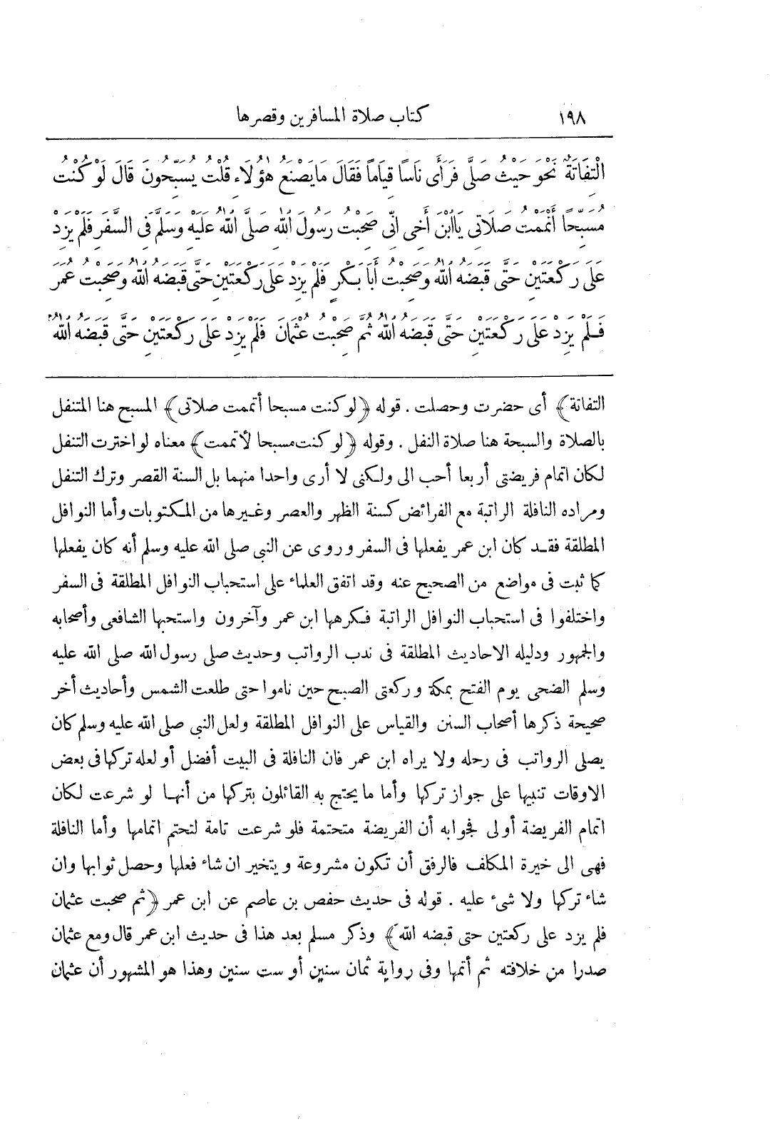 الْتِفَاتَةٌ أَيْ حَضَرَتْ وَحَصَلَتْ قَوْلُهُ لَوْ كُنْتُ مُسَبِّحًا أَتْمَمْتُ صَلَاتِي الْمُسَبِّحُ هُنَا الْمُتَنَفِّلُ بِالصَّلَاةِ والسبحة هنا صلاة النفل وقوله لو كُنْتُ مُسَبِّحًا لَأَتْمَمْتُ مَعْنَاهُ لَوِ اخْتَرْتُ التَّنَفُّلَ لَكَانَ إِتْمَامُ فَرِيضَتِي أَرْبَعًا أَحَبُّ إِلَيَّ وَلَكِنِّي لَا أَرَى وَاحِدًا مِنْهُمَا بَلِ السُّنَّةُ الْقَصْرُ وَتَرْكُ التَّنَفُّلِ وَمُرَادُهُ النَّافِلَةُ الرَّاتِبَةُ مَعَ الْفَرَائِضِ كَسُنَّةِ الظُّهْرِ وَالْعَصْرِ وَغَيْرِهَا مِنَ الْمَكْتُوبَاتِ وَأَمَّا النوافل المطلقة فقد كان بن عُمَرَ يَفْعَلُهَا فِي السَّفَرِ وَرُوِيَ عَنِ النَّبِيِّ صَلَّى اللَّهُ عَلَيْهِ وَسَلَّمَ أَنَّهُ كَانَ يَفْعَلُهَا كَمَا ثَبَتَ فِي مَوَاضِعَ مِنَ الصَّحِيحِ عَنْهُ وَقَدِ اتَّفَقَ الْعُلَمَاءُ عَلَى اسْتِحْبَابِ النَّوَافِلِ الْمُطْلَقَةِ فِي السَّفَرِ وَاخْتَلَفُوا فِي اسْتِحْبَابِ النَّوَافِلِ الرَّاتِبَةِ فكرهها بن عُمَرَ وَآخَرُونَ وَاسْتَحَبَّهَا الشَّافِعِيُّ وَأَصْحَابُهُ وَالْجُمْهُورُ وَدَلِيلُهُ الْأَحَادِيثُ الْمُطْلَقَةُ فِي نَدْبِ الرَّوَاتِبِ وَحَدِيثُ صَلَّى رَسُولُ اللَّهِ صَلَّى اللَّهُ عَلَيْهِ وَسَلَّمَ الضُّحَى يَوْمَ الْفَتْحِ بِمَكَّةَ وَرَكْعَتَيِ الصُّبْحِ حِينَ نَامُوا حَتَّى طَلَعَتِ الشَّمْسُ وَأَحَادِيثُ أُخَرَ صَحِيحَةٌ ذَكَرَهَا أَصْحَابُ السُّنَنِ وَالْقِيَاسِ عَلَى النَّوَافِلِ الْمُطْلَقَةِ وَلَعَلَّ النَّبِيَّ صَلَّى اللَّهُ عَلَيْهِ وَسَلَّمَ كَانَ يُصَلِّي الرواتب في رحله ولا يراه بن عُمَرَ فَإِنَّ النَّافِلَةَ فِي الْبَيْتِ أَفْضَلُ أَوْ لَعَلَّهُ تَرَكَهَا فِي بَعْضِ الْأَوْقَاتِ تَنْبِيهًا عَلَى جَوَازِ تَرْكِهَا وَأَمَّا مَا يَحْتَجُّ بِهِ الْقَائِلُونَ بِتَرْكِهَا مِنْ أَنَّهَا لَوْ شُرِعَتْ لَكَانَ إِتْمَامُ الْفَرِيضَةِ أَوْلَى فَجَوَابُهُ أَنَّ الْفَرِيضَةَ مُتَحَتِّمَةٌ فَلَوْ شُرِعَتْ تَامَّةً لَتَحَتَّمَ إِتْمَامُهَا وَأَمَّا النَّافِلَةُ فَهِيَ إِلَى خِيَرَةِ الْمُكَلَّفِ فَالرِّفْقُ أَنْ تَكُونَ مَشْرُوعَةً وَيَتَخَيَّرُ إِنْ شَاءَ فَعَلَهَا وَحَصَلَ ثَوَابُهَا وَإِنْ شاء تركها ولا شيء عليه قَوْلُهُ فِي حَدِيثِ حَفْصِ بْنِ عَاصِمٍ عَنِ بن عُمَرَ ثُمَّ صَحِبْتُ عُثْمَانَ فَلَمْ يَزِدْ عَلَى رَكْعَتَيْنِ حَتَّى قَبَضَهُ اللَّهُ وَذَكَرَ مُسْلِمٌ بَعْدَ هذا في حديث بن عُمَرَ قَالَ وَمَعَ عُثْمَانَ صَدْرًا مِنْ خِلَافَتِهِ ثُمَّ أَتَمَّهَا وَفِي رِوَايَةٍ ثَمَانِ سِنِينَ أَوْ سِتَّ سِنِينَ وَهَذَا هُوَ الْمَشْهُورُ أَنَّ عُثْمَانَ
