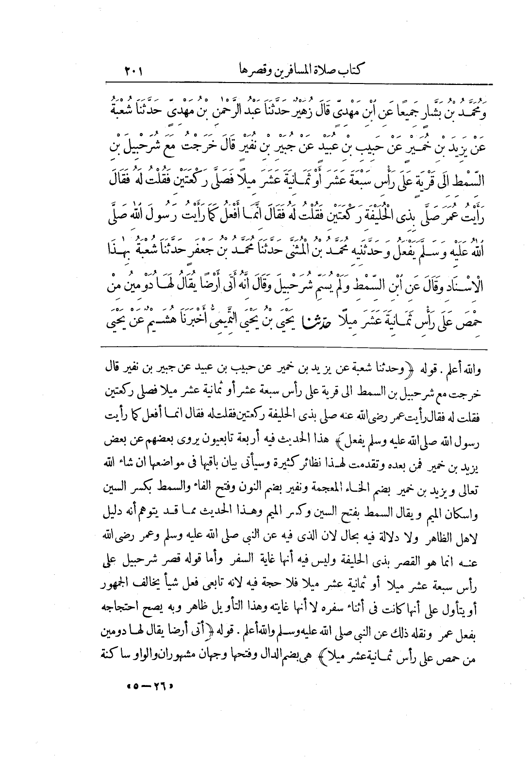[692] قَوْلُهُ وَحَدَّثَنَا شُعْبَةُ عَنْ يَزِيدِ بْنِ خُمَيْرٍ عَنْ حَبِيبِ بْنِ عُبَيْدٍ عَنْ جُبَيْرِ بْنِ نُفَيْرٍ قَالَ خَرَجْتُ مَعَ شُرَحْبِيلَ بْنِ السِّمْطِ إِلَى قَرْيَةٍ عَلَى رَأْسِ سَبْعَةَ عَشَرَ أَوْ ثَمَانِيَةَ عَشَرَ مِيلًا فَصَلَّى رَكْعَتَيْنِ فَقُلْتُ لَهُ فَقَالَ رَأَيْتُ عُمَرَ رَضِيَ اللَّهُ عَنْهُ صَلَّى بِذِي الْحُلَيْفَةِ رَكْعَتَيْنِ فَقُلْتُ لَهُ فَقَالَ إِنَّمَا أَفْعَلُ كَمَا رَأَيْتُ رَسُولَ اللَّهِ صَلَّى اللَّهُ عَلَيْهِ وَسَلَّمَ يَفْعَلُ هَذَا الْحَدِيثُ فِيهِ أَرْبَعَةٌ تَابِعِيُّونَ يَرْوِي بَعْضُهُمْ عَنْ بَعْضٍ يَزِيدُ بْنُ خُمَيْرٍ فَمَنْ بَعْدَهُ وَتَقَدَّمَتْ لِهَذَا نَظَائِرُ كَثِيرَةٌ وَسَيَأْتِي بَيَانُ بَاقِيهَا فِي مَوَاضِعِهَا ان شاء الله تعالى ويزيد بن خمير بضم الخاء المعجمة ونفير بضم النون وفتح الفاء والسمط بِكَسْرِ السِّينِ وَإِسْكَانِ الْمِيمِ وَيُقَالُ السَّمِطُ بِفَتْحِ السِّينِ وَكَسْرِ الْمِيمِ وَهَذَا الْحَدِيثُ مِمَّا قَدْ يُتَوَهَّمُ أَنَّهُ دَلِيلٌ لِأَهْلِ الظَّاهِرِ وَلَا دَلَالَةَ فِيهِ بِحَالٍ لِأَنَّ الَّذِي فِيهِ عَنِ النَّبِيِّ صَلَّى اللَّهُ عَلَيْهِ وَسَلَّمَ وَعُمَرَ رَضِيَ اللَّهُ عَنْهُ إِنَّمَا هُوَ الْقَصْرُ بِذِي الْحُلَيْفَةِ وَلَيْسَ فِيهِ أَنَّهَا غَايَةَ السَّفَرِ وَأَمَّا قَوْلُهُ قَصَرَ شُرَحْبِيلُ عَلَى رَأْسِ سَبْعَةَ عَشَرَ مِيلًا أَوْ ثَمَانِيَةَ عَشَرَ مِيلًا فَلَا حُجَّةَ فِيهِ لِأَنَّهُ تَابِعِيٌّ فَعَلَ شَيْئًا يُخَالِفُ الْجُمْهُورَ أَوْ يُتَأَوَّلُ عَلَى أَنَّهَا كَانَتْ فِي أَثْنَاءِ سَفَرِهِ لَا أَنَّهَا غَايَتُهُ وَهَذَا التَّأْوِيلُ ظَاهِرٌ وَبِهِ يَصِحُّ احْتِجَاجُهُ بِفِعْلِ عُمَرَ وَنَقْلُهُ ذَلِكَ عَنِ النَّبِيِّ صَلَّى اللَّهُ عَلَيْهِ وَسَلَّمَ وَاللَّهُ أَعْلَمُ قَوْلُهُ أَتَى أَرْضًا يُقَالُ لَهَا دُومَيْنِ مِنْ حِمْصَ عَلَى رَأْسِ ثَمَانِيَةَ عَشَرَ مِيلًا هِيَ بِضَمِّ الدَّالِ وَفَتْحِهَا وَجْهَانِ مَشْهُورَانِ وَالْوَاوُ سَاكِنَةٌ