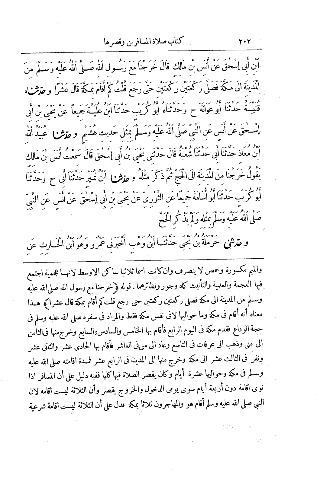 [693] قَوْلُهُ خَرَجْنَا مَعَ رَسُولِ اللَّهِ صَلَّى اللَّهُ عَلَيْهِ وَسَلَّمَ مِنَ الْمَدِينَةِ إِلَى مَكَّةَ فَصَلَّى رَكْعَتَيْنِ رَكْعَتَيْنِ حَتَّى رَجَعَ قُلْتُ كَمْ أَقَامَ بِمَكَّةَ قَالَ عَشْرًا هَذَا مَعْنَاهُ أَنَّهُ أَقَامَ فِي مَكَّةَ وَمَا حَوَالَيْهَا لَا فِي نَفْسِ مَكَّةَ فَقَطْ وَالْمُرَادُ فِي سَفَرِهِ صَلَّى اللَّهُ عَلَيْهِ وَسَلَّمَ فِي حَجَّةِ الْوَدَاعِ فَقَدِمَ مَكَّةَ فِي الْيَوْمِ الرَّابِعِ فَأَقَامَ بِهَا الْخَامِسَ وَالسَّادِسَ وَالسَّابِعَ وَخَرَجَ مِنْهَا فِي الثَّامِنِ إِلَى مِنًى وَذَهَبَ إِلَى عَرَفَاتٍ فِي التَّاسِعِ وَعَادَ إِلَى مِنًى فِي الْعَاشِرِ فَأَقَامَ بِهَا الْحَادِيَ عَشَرَ وَالثَّانِيَ عَشَرَ وَنَفَرَ فِي الثَّالِثَ عَشَرَ إِلَى مَكَّةَ وَخَرَجَ مِنْهَا إِلَى الْمَدِينَةِ فِي الرَّابِعَ عَشَرَ فَمُدَّةُ إِقَامَتِهِ صَلَّى اللَّهُ عَلَيْهِ وَسَلَّمَ فِي مَكَّةَ وَحَوَالَيْهَا عَشَرَةَ أَيَّامٍ وَكَانَ يَقْصُرُ الصَّلَاةَ فِيهَا كُلِّهَا فَفِيهِ دَلِيلٌ عَلَى أَنَّ الْمُسَافِرَ إِذَا نَوَى إِقَامَةً دُونَ أَرْبَعَةِ أَيَّامٍ سِوَى يَوْمَيِ الدُّخُولِ وَالْخُرُوجِ يَقْصُرُ وَأَنَّ الثَّلَاثَةَ لَيْسَتْ إِقَامَةً لِأَنَّ النَّبِيَّ صَلَّى اللَّهُ عَلَيْهِ وَسَلَّمَ أَقَامَ هُوَ وَالْمُهَاجِرُونَ ثَلَاثًا بِمَكَّةَ فَدَلَّ عَلَى أَنَّ الثَّلَاثَةَ لَيْسَتْ إِقَامَةً شَرْعِيَّةً