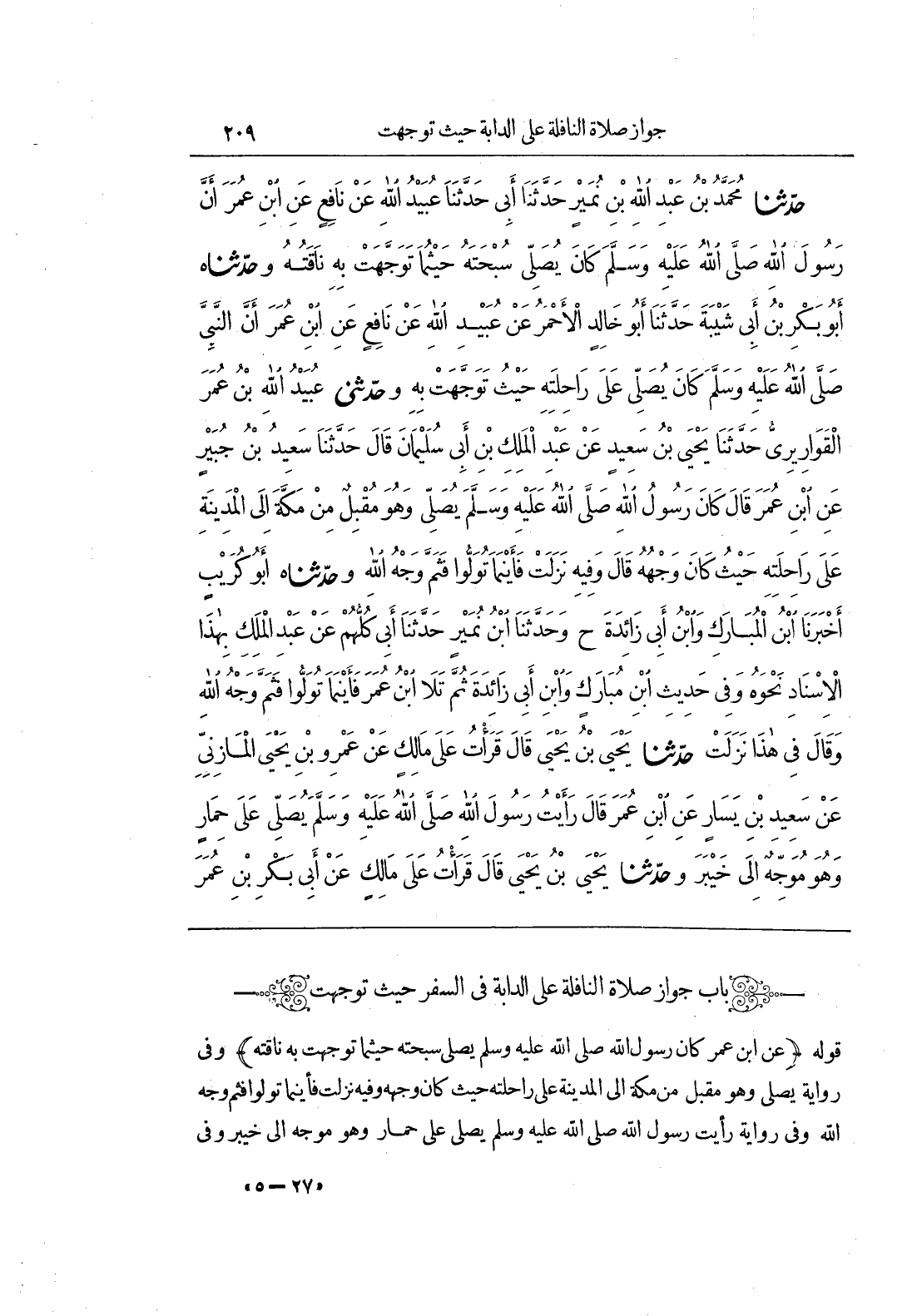 [700] قوله عن بن عُمَرَ كَانَ رَسُولُ اللَّهِ صَلَّى اللَّهُ عَلَيْهِ وَسَلَّمَ يُصَلِّي سُبْحَتَهُ حَيْثُمَا تَوَجَّهَتْ بِهِ نَاقَتُهُ وَفِي رِوَايَةٍ يُصَلِّي وَهُوَ مُقْبِلٌ مِنْ مَكَّةَ إِلَى الْمَدِينَةِ عَلَى رَاحِلَتِهِ حَيْثُ كَانَ وَجْهُهُ وَفِيهِ نَزَلَتْ فَأَيْنَمَا تُوَلُّوا فَثَمَّ وَجْهُ اللَّهِ وَفِي رِوَايَةٍ رَأَيْتُ رَسُولَ اللَّهِ صَلَّى اللَّهُ عَلَيْهِ وَسَلَّمَ يُصَلِّي عَلَى حِمَارٍ وَهُوَ مُوَجَّهٌ إِلَى خَيْبَرَ وَفِي رِوَايَةٍ