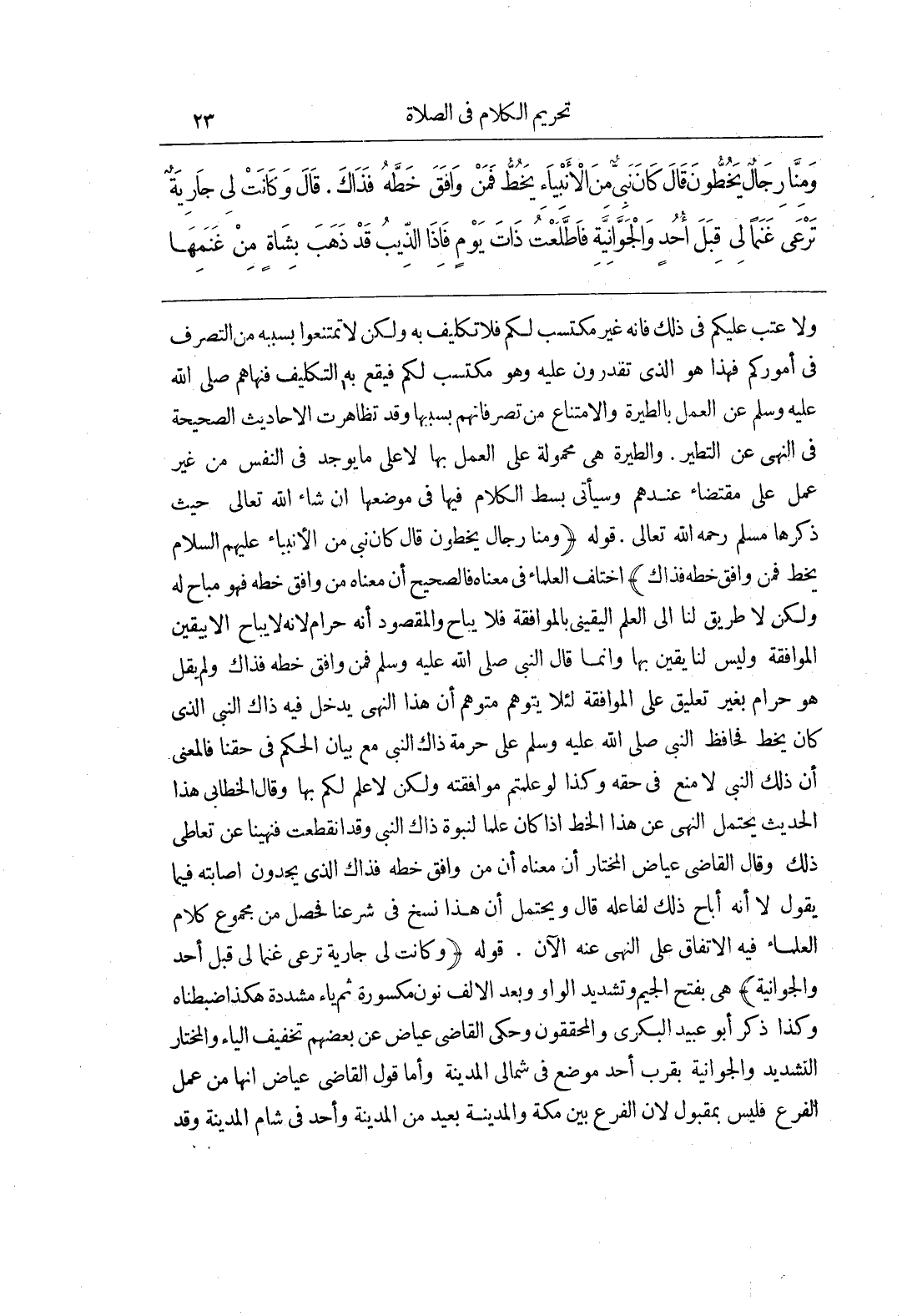 وَلَا عَتَبَ عَلَيْكُمْ فِي ذَلِكَ فَإِنَّهُ غَيْرُ مُكْتَسَبٍ لَكُمْ فَلَا تَكْلِيفَ بِهِ وَلَكِنْ لَا تَمْتَنِعُوا بِسَبَبِهِ مِنَ التَّصَرُّفِ فِي أُمُورِكُمْ فَهَذَا هُوَ الَّذِي تَقْدِرُونَ عَلَيْهِ وَهُوَ مُكْتَسَبٌ لَكُمْ فَيَقَعُ بِهِ التَّكْلِيفُ فَنَهَاهُمْ صَلَّى اللَّهُ عَلَيْهِ وَسَلَّمَ عَنِ الْعَمَلِ بِالطِّيَرَةِ وَالِامْتِنَاعِ مِنْ تَصَرُّفَاتِهِمْ بِسَبَبِهَا وَقَدْ تَظَاهَرَتِ الْأَحَادِيثُ الصَّحِيحَةُ فِي النَّهْيِ عَنِ التَّطَيُّرِ وَالطِّيَرَةُ هِيَ مَحْمُولَةٌ عَلَى الْعَمَلِ بِهَا لَا عَلَى مَا يُوجَدُ فِي النَّفْسِ مِنْ غَيْرِ عَمَلٍ عَلَى مُقْتَضَاهُ عِنْدَهُمْ وَسَيَأْتِي بَسْطُ الْكَلَامِ فِيهَا فِي مَوْضِعِهَا إِنْ شَاءَ اللَّهُ تَعَالَى حَيْثُ ذَكَرَهَا مُسْلِمٌ رَحِمَهُ اللَّهُ تَعَالَى قَوْلُهُ وَمِنَّا رِجَالٌ يَخُطُّونَ قَالَ كَانَ نَبِيٌّ مِنَ الْأَنْبِيَاءِ عَلَيْهِمُ السَّلَامُ يَخُطُّ فَمَنْ وَافَقَ خَطُّهُ فَذَاكَ اخْتَلَفَ الْعُلَمَاءُ فِي مَعْنَاهُ فالصحيح أن معناه من وافق خَطُّهُ فَهُوَ مُبَاحٌ لَهُ وَلَكِنْ لَا طَرِيقَ لَنَا إِلَى الْعِلْمِ الْيَقِينِيِّ بِالْمُوَافَقَةِ فَلَا يُبَاحُ وَالْمَقْصُودُ أَنَّهُ حَرَامٌ لِأَنَّهُ لَا يُبَاحُ إِلَّا بِيَقِينِ الْمُوَافَقَةِ وَلَيْسَ لَنَا يَقِينٌ بِهَا وَإِنَّمَا قَالَ النَّبِيُّ صَلَّى اللَّهُ عَلَيْهِ وَسَلَّمَ فيمن وَافَقَ خَطُّهُ فَذَاكَ وَلَمْ يَقُلْ هُوَ حَرَامٌ بِغَيْرِ تَعْلِيقٍ عَلَى الْمُوَافَقَةِ لِئَلَّا يَتَوَهَّمَ مُتَوَهِّمٌ أَنَّ هَذَا النَّهْيَ يَدْخُلُ فِيهِ ذَاكَ النَّبِيُّ الَّذِي كَانَ يَخُطُّ فَحَافَظَ النَّبِيُّ صَلَّى اللَّهُ عَلَيْهِ وَسَلَّمَ عَلَى حُرْمَةِ ذَاكَ النَّبِيِّ مَعَ بيان الحكم في حقنا فالمعنى أن ذلك النَّبِيَّ لَا مَنْعَ فِي حَقِّهِ وَكَذَا لَوْ عَلِمْتُمْ مُوَافَقَتَهُ وَلَكِنْ لَا عِلْمَ لَكُمْ بِهَا وَقَالَ الْخَطَّابِيُّ هَذَا الْحَدِيثُ يَحْتَمِلُ النَّهْيَ عَنْ هَذَا الْخَطِّ إِذَا كَانَ عَلَمًا لِنُبُوَّةِ ذَاكَ النَّبِيِّ وَقَدِ انْقَطَعَتْ فَنُهِينَا عَنْ تَعَاطِي ذَلِكَ وَقَالَ الْقَاضِي عِيَاضٌ الْمُخْتَارُ أَنَّ مَعْنَاهُ أَنَّ مَنْ وَافَقَ خَطُّهُ فَذَاكَ الَّذِي يَجِدُونَ إِصَابَتَهُ فِيمَا يَقُولُ لَا أَنَّهُ أَبَاحَ ذَلِكَ لِفَاعِلِهِ قَالَ وَيَحْتَمِلُ أَنَّ هَذَا نُسِخَ فِي شَرْعِنَا فَحَصَلَ مِنْ مَجْمُوعِ كَلَامِ الْعُلَمَاءِ فِيهِ الِاتِّفَاقُ عَلَى النَّهْيِ عَنْهُ الْآنَ قَوْلُهُ وَكَانَتْ لِي جَارِيَةٌ تَرْعَى غَنَمًا لِي قِبَل أُحُد وَالْجَوَّانِيَّة هِيَ بِفَتْحِ الْجِيمِ وَتَشْدِيدِ الْوَاوِ وَبَعْدَ الْأَلِفِ نُونٌ مَكْسُورَةٌ ثُمَّ يَاءٌ مُشَدَّدَةٌ هَكَذَا ضَبَطْنَاهُ وَكَذَا ذَكَرَ أَبُو عُبَيْدٍ الْبَكْرِيُّ وَالْمُحَقِّقُونَ وَحَكَى الْقَاضِي عِيَاضٌ عَنْ بَعْضِهِمْ تَخْفِيفَ الْيَاءِ وَالْمُخْتَارُ التَّشْدِيدُ وَالْجَوَّانِيَّةُ بِقُرْبِ أُحُدٍ مَوْضِعٌ فِي شَمَالِيِّ الْمَدِينَةِ وَأَمَّا قَوْلُ الْقَاضِي عِيَاضٍ إِنَّهَا مِنْ عَمَلِ الْفَرْعِ فَلَيْسَ بِمَقْبُولٍ لِأَنَّ الْفَرْعَ بَيْنَ مَكَّةَ وَالْمَدِينَةِ بَعِيدٌ مِنَ الْمَدِينَةِ وَأُحُدٌ فِي شام المدينة وقد