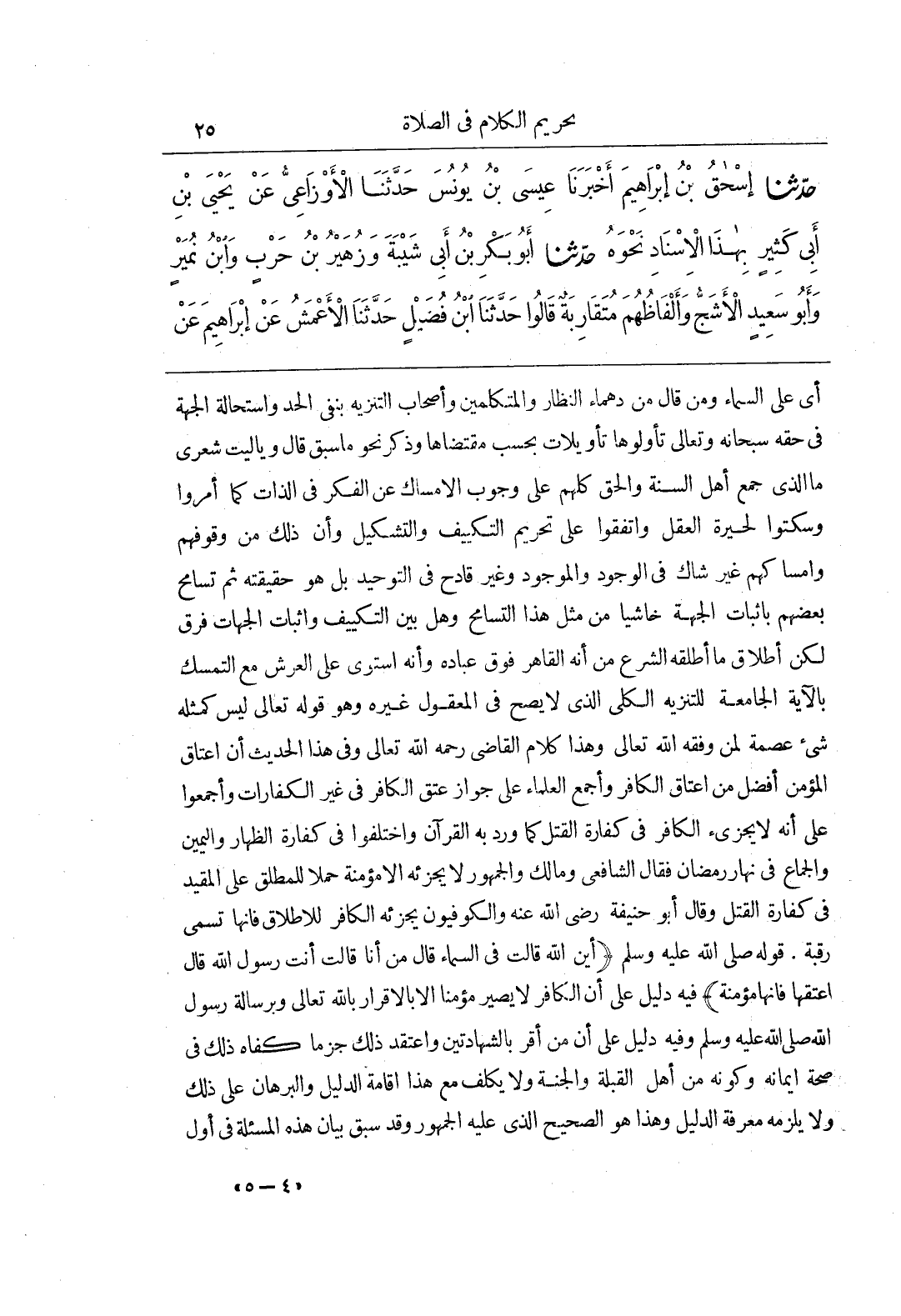 أَيْ عَلَى السَّمَاءِ وَمَنْ قَالَ مِنْ دَهْمَاءِ النُّظَّارِ وَالْمُتَكَلِّمِينَ وَأَصْحَابِ التَّنْزِيهِ بِنَفْيِ الْحَدِّ وَاسْتِحَالَةِ الْجِهَةِ فِي حَقِّهِ سُبْحَانَهُ وَتَعَالَى تَأَوَّلُوهَا تَأْوِيلَاتٍ بِحَسَبِ مُقْتَضَاهَا وَذَكَرَ نَحْوَ مَا سَبَقَ قَالَ وَيَا لَيْتَ شِعْرِي مَا الَّذِي جَمَعَ أَهْلَ السُّنَّةِ وَالْحَقِّ كُلَّهُمْ عَلَى وُجُوبِ الْإِمْسَاكِ عَنِ الْفِكْرِ فِي الذَّاتِ كَمَا أُمِرُوا وَسَكَتُوا لِحِيرَةِ الْعَقْلِ وَاتَّفَقُوا عَلَى تَحْرِيمِ التَّكْيِيفِ وَالتَّشْكِيلِ وَأَنَّ ذَلِكَ مِنْ وُقُوفِهِمْ وَإِمْسَاكِهِمْ غَيْرُ شَاكٍّ فِي الوجود والموجود وَغَيْرُ قَادِحٍ فِي التَّوْحِيدِ بَلْ هُوَ حَقِيقَتُهُ ثُمَّ تَسَامَحَ بَعْضُهُمْ بِإِثْبَاتِ الْجِهَةِ خَاشِيًا مِنْ مِثْلِ هَذَا التَّسَامُحِ وَهَلْ بَيْنَ التَّكْيِيفِ وَإِثْبَاتِ الْجِهَاتِ فَرْقٌ لَكِنْ إِطْلَاقُ مَا أَطْلَقَهُ الشَّرْعُ مِنْ أَنَّهُ الْقَاهِرُ فَوْقَ عِبَادِهِ وَأَنَّهُ اسْتَوَى عَلَى الْعَرْشِ مَعَ التَّمَسُّكِ بِالْآيَةِ الْجَامِعَةِ لِلتَّنْزِيهِ الْكُلِّيِّ الَّذِي لَا يَصِحُّ فِي الْمَعْقُولِ غَيْرُهُ وهو قوله تعالى ليس كمثله شيء عِصْمَةٌ لِمَنْ وَفَّقَهُ اللَّهُ تَعَالَى وَهَذَا كَلَامُ الْقَاضِي رَحِمَهُ اللَّهُ تَعَالَى وَفِي هَذَا الْحَدِيثِ أَنَّ إِعْتَاقَ الْمُؤْمِنِ أَفْضَلُ مِنْ إِعْتَاقِ الْكَافِرِ وَأَجْمَعَ الْعُلَمَاءُ عَلَى جَوَازِ عِتْقِ الْكَافِرِ فِي غَيْرِ الْكَفَّارَاتِ وَأَجْمَعُوا عَلَى أَنَّهُ لَا يُجْزِئُ الْكَافِرُ فِي كَفَّارَةِ الْقَتْلِ كَمَا وَرَدَ بِهِ الْقُرْآنُ وَاخْتَلَفُوا فِي كَفَّارَةِ الظِّهَارِ وَالْيَمِينِ وَالْجِمَاعِ فِي نَهَارِ رَمَضَانَ فَقَالَ الشَّافِعِيُّ وَمَالِكٌ وَالْجُمْهُورُ لَا يُجْزِئُهُ إِلَّا مُؤْمِنَةٌ حَمْلًا لِلْمُطْلَقِ عَلَى الْمُقَيَّدِ فِي كَفَّارَةِ الْقَتْلِ وَقَالَ أَبُو حَنِيفَةَ رَضِيَ اللَّهُ عَنْهُ وَالْكُوفِيُّونَ يُجْزِئُهُ الْكَافِرُ لِلْإِطْلَاقِ فَإِنَّهَا تُسَمَّى رَقَبَةً قَوْلُهُ صَلَّى اللَّهُ عَلَيْهِ وَسَلَّمَ أَيْنَ اللَّهُ قَالَتْ فِي السَّمَاءِ قَالَ مَنْ أَنَا قَالَتْ أَنْتَ رَسُولُ اللَّهِ قَالَ أَعْتِقْهَا فَإِنَّهَا مُؤْمِنَةٌ فِيهِ دَلِيلٌ عَلَى أَنَّ الْكَافِرَ لَا يَصِيرُ مُؤْمِنًا إِلَّا بِالْإِقْرَارِ بِاللَّهِ تَعَالَى وَبِرِسَالَةِ رَسُولِ اللَّهِ صَلَّى اللَّهُ عَلَيْهِ وَسَلَّمَ وَفِيهِ دَلِيلٌ عَلَى أَنَّ مَنْ أَقَرَّ بِالشَّهَادَتَيْنِ وَاعْتَقَدَ ذَلِكَ جَزْمًا كَفَاهُ ذَلِكَ فِي صِحَّةِ إِيمَانِهِ وَكَوْنِهِ مِنْ أَهْلِ الْقِبْلَةِ وَالْجَنَّةِ وَلَا يُكَلَّفُ مَعَ هَذَا إِقَامَةَ الدَّلِيلِ وَالْبُرْهَانِ عَلَى ذَلِكَ وَلَا يَلْزَمُهُ مَعْرِفَةُ الدَّلِيلِ وَهَذَا هُوَ الصَّحِيحُ الَّذِي عَلَيْهِ الْجُمْهُورُ وَقَدْ سَبَقَ بَيَانُ هَذِهِ الْمَسْأَلَةِ فِي أَوَّلِ