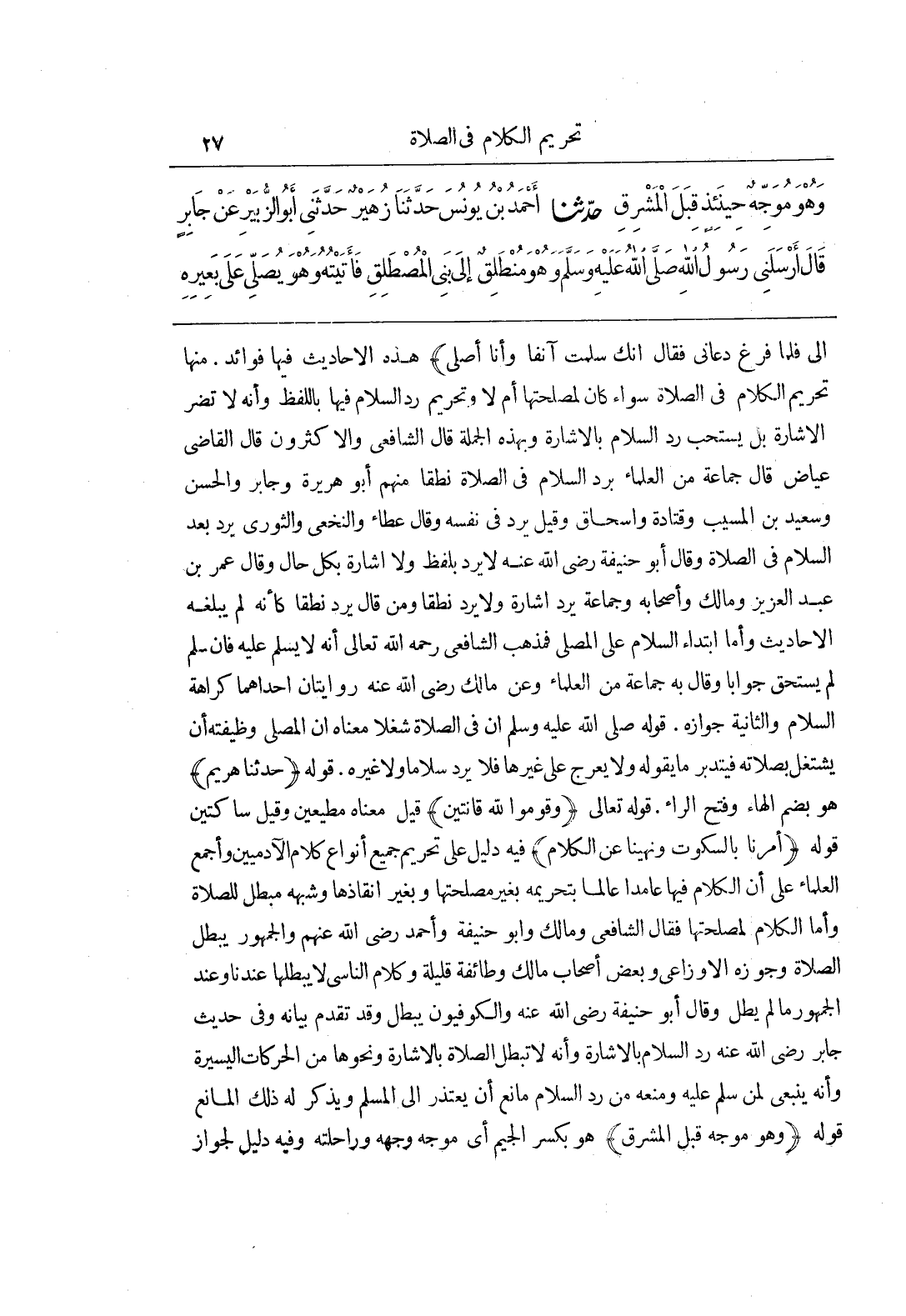 إِلَيَّ فَلَمَّا فَرَغَ دَعَانِي فَقَالَ إِنَّكَ سَلَّمْتَ آنِفًا وَأَنَا أُصَلِّي هَذِهِ الْأَحَادِيثُ فِيهَا فَوَائِدُ مِنْهَا تَحْرِيمُ الْكَلَامِ فِي الصَّلَاةِ سَوَاءٌ كَانَ لِمَصْلَحَتِهَا أَمْ لَا وَتَحْرِيمُ رَدِّ السَّلَامِ فِيهَا بِاللَّفْظِ وَأَنَّهُ لَا تَضُرُّ الْإِشَارَةُ بَلْ يُسْتَحَبُّ رَدُّ السَّلَامِ بِالْإِشَارَةِ وَبِهَذِهِ الْجُمْلَةِ قَالَ الشَّافِعِيُّ وَالْأَكْثَرُونَ قَالَ الْقَاضِي عِيَاضٌ قَالَ جَمَاعَةٌ مِنَ العلماء برد السَّلَامَ فِي الصَّلَاةِ نُطْقًا مِنْهُمْ أَبُو هُرَيْرَةَ وَجَابِرٌ وَالْحَسَنُ وَسَعِيدُ بْنُ الْمُسَيَّبِ وَقَتَادَةُ وَإِسْحَاقُ وَقِيلَ يَرُدُّ فِي نَفْسِهِ وَقَالَ عَطَاءٌ وَالنَّخَعِيُّ وَالثَّوْرِيُّ يَرُدُّ بَعْدَ السَّلَامِ فِي الصَّلَاةِ وَقَالَ أَبُو حَنِيفَةَ رَضِيَ اللَّهُ عَنْهُ لَا يَرُدُّ بِلَفْظٍ وَلَا إِشَارَةٍ بِكُلِّ حَالٍ وَقَالَ عُمَرُ بْنُ عَبْدِ الْعَزِيزِ وَمَالِكٌ وَأَصْحَابُهُ وَجَمَاعَةٌ يَرُدُّ إِشَارَةً وَلَا يَرُدُّ نُطْقًا وَمَنْ قَالَ يَرُدُّ نُطْقًا كَأَنَّهُ لَمْ يَبْلُغْهُ الْأَحَادِيثُ وَأَمَّا ابْتِدَاءُ السَّلَامِ عَلَى الْمُصَلِّي فَمَذْهَبُ الشَّافِعِيِّ رَحِمَهُ اللَّهُ تَعَالَى أَنَّهُ لَا يُسَلِّمُ عَلَيْهِ فَإِنْ سَلَّمَ لَمْ يَسْتَحِقَّ جَوَابًا وَقَالَ بِهِ جَمَاعَةٌ مِنَ الْعُلَمَاءِ وَعَنْ مَالِكٍ رَضِيَ اللَّهُ عَنْهُ رِوَايَتَانِ إِحْدَاهُمَا كَرَاهَةُ السَّلَامِ وَالثَّانِيَةُ جَوَازُهُ قَوْلُهُ صَلَّى اللَّهُ عَلَيْهِ وَسَلَّمَ إِنَّ فِي الصَّلَاةِ شُغْلًا مَعْنَاهُ أَنَّ الْمُصَلِّيَ وَظِيفَتُهُ أَنْ يَشْتَغِلَ بِصَلَاتِهِ فَيَتَدَبَّرَ مَا يَقُولُهُ وَلَا يُعَرِّجُ عَلَى غَيْرِهَا فَلَا يَرُدُّ سَلَامًا وَلَا غَيْرَهُ قَوْلُهُ حَدَّثَنَا هُرَيْمٌ هُوَ بِضَمِّ الْهَاءِ وَفَتْحِ الرَّاءِ قَوْلُهُ تعالى وقوموا لله قانتين قِيلَ مَعْنَاهُ مُطِيعِينَ وَقِيلَ سَاكِتِينَ قَوْلُهُ أُمِرْنَا بِالسُّكُوتِ وَنُهِينَا عَنِ الْكَلَامِ فِيهِ دَلِيلٌ عَلَى تَحْرِيمِ جَمِيعِ أَنْوَاعِ كَلَامِ الْآدَمِيِّينَ وَأَجْمَعَ الْعُلَمَاءُ عَلَى أَنَّ الْكَلَامَ فِيهَا عَامِدًا عَالِمًا بِتَحْرِيمِهِ بِغَيْرِ مَصْلَحَتِهَا وَبِغَيْرِ إِنْقَاذِهَا وَشِبْهَهُ مُبْطِلٌ لِلصَّلَاةِ وَأَمَّا الْكَلَامُ لِمَصْلَحَتِهَا فَقَالَ الشَّافِعِيُّ وَمَالِكٌ وَأَبُو حَنِيفَةَ وَأَحْمَدُ رَضِيَ اللَّهُ عَنْهُمْ وَالْجُمْهُورُ يُبْطِلُ الصَّلَاةَ وَجَوَّزَهُ الْأَوْزَاعِيُّ وَبَعْضُ أَصْحَابِ مَالِكٍ وَطَائِفَةٌ قَلِيلَةٌ وَكَلَامُ النَّاسِي لَا يُبْطِلُهَا عِنْدَنَا وَعِنْدَ الْجُمْهُورِ مَا لَمْ يُطِلْ وَقَالَ أَبُو حَنِيفَةَ رَضِيَ اللَّهُ عَنْهُ وَالْكُوفِيُّونَ يُبْطِلُ وَقَدْ تَقَدَّمَ بَيَانُهُ وَفِي حَدِيثِ جَابِرٍ رَضِيَ اللَّهُ عَنْهُ رَدُّ السَّلَامِ بِالْإِشَارَةِ وَأَنَّهُ لَا تَبْطُلُ الصَّلَاةُ بِالْإِشَارَةِ وَنَحْوِهَا مِنَ الْحَرَكَاتِ الْيَسِيرَةِ وَأَنَّهُ يَنْبَغِي لِمَنْ سَلَّمَ عَلَيْهِ وَمَنَعَهُ مِنْ رَدِّ السَّلَامِ مَانِعٌ أَنْ يَعْتَذِرَ إِلَى الْمُسْلِمِ وَيَذْكُرَ لَهُ ذَلِكَ الْمَانِعَ قَوْلُهُ وَهُوَ مُوَجِّهٌ قِبَلَ الْمَشْرِقِ هو بِكَسْرِ الْجِيمِ أَيْ مُوَجِّهٌ وَجْهَهُ وَرَاحِلَتَهُ وَفِيهِ دليل لجواز