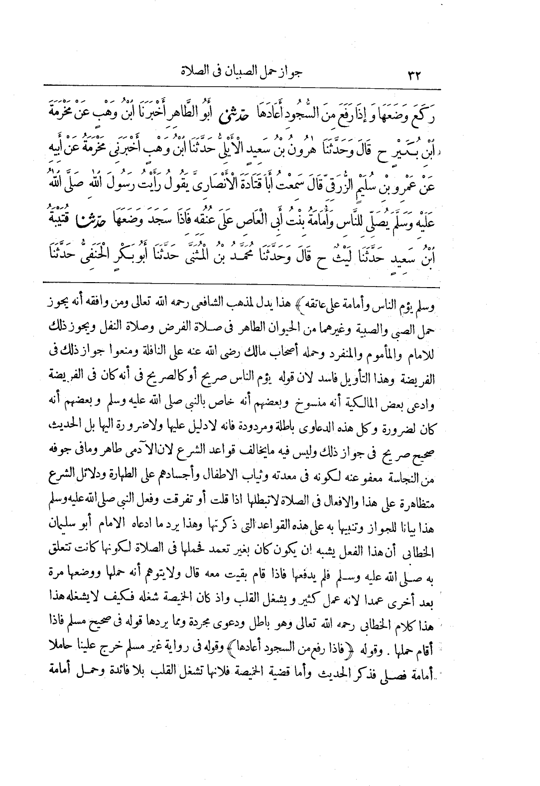 يَؤُمُّ النَّاسَ وَأُمَامَةُ عَلَى عَاتِقِهِ هَذَا يَدُلُّ لِمَذْهَبِ الشَّافِعِيِّ رَحِمَهُ اللَّهُ تَعَالَى وَمَنْ وَافَقَهُ أَنَّهُ يَجُوزُ حَمْلُ الصَّبِيِّ وَالصَّبِيَّةِ وَغَيْرِهِمَا مِنَ الْحَيَوَانِ الطَّاهِرِ فِي صَلَاةِ الْفَرْضِ وَصَلَاةِ النَّفْلِ وَيَجُوزُ ذَلِكَ لِلْإِمَامِ وَالْمَأْمُومِ وَالْمُنْفَرِدِ وَحَمَلَهُ أَصْحَابُ مَالِكٍ رَضِيَ اللَّهُ عَنْهُ عَلَى النَّافِلَةِ وَمَنَعُوا جَوَازَ ذَلِكَ فِي الْفَرِيضَةِ وَهَذَا التَّأْوِيلُ فَاسِدٌ لِأَنَّ قَوْلَهُ يَؤُمُّ النَّاسَ صَرِيحٌ أَوْ كَالصَّرِيحِ فِي أَنَّهُ كَانَ فِي الْفَرِيضَةِ وَادَّعَى بَعْضُ الْمَالِكِيَّةِ أَنَّهُ مَنْسُوخٌ وَبَعْضُهُمْ أَنَّهُ خَاصٌّ بِالنَّبِيِّ صَلَّى اللَّهُ عَلَيْهِ وَسَلَّمَ وَبَعْضُهُمْ أَنَّهُ كَانَ لِضَرُورَةٍ وَكُلُّ هَذِهِ الدَّعَاوِي بَاطِلَةٌ وَمَرْدُودَةٌ فَإِنَّهُ لَا دَلِيلَ عَلَيْهَا وَلَا ضَرُورَةَ إِلَيْهَا بَلِ الْحَدِيثُ صَحِيحٌ صَرِيحٌ فِي جَوَازِ ذَلِكَ وَلَيْسَ فِيهِ مَا يُخَالِفُ قَوَاعِدَ الشَّرْعِ لِأَنَّ الْآدَمِيَّ طَاهِرٌ وَمَا فِي جَوْفِهِ مِنَ النَّجَاسَةِ مَعْفُوٌّ عَنْهُ لِكَوْنِهِ فِي مَعِدَتِهِ وَثِيَابُ الْأَطْفَالِ وَأَجْسَادُهُمْ عَلَى الطَّهَارَةِ وَدَلَائِلُ الشَّرْعِ مُتَظَاهِرَةٌ عَلَى هَذَا وَالْأَفْعَالُ فِي الصَّلَاةِ لَا تُبْطِلُهَا إِذَا قَلَّتْ أَوْ تَفَرَّقَتْ وَفَعَلَ النَّبِيُّ صَلَّى اللَّهُ عَلَيْهِ وَسَلَّمَ هَذَا بَيَانًا لِلْجَوَازِ وَتَنْبِيهًا بِهِ عَلَى هَذِهِ الْقَوَاعِدِ الَّتِي ذَكَرْتُهَا وَهَذَا يَرُدُّ مَا ادَّعَاهُ الْإِمَامُ أَبُو سُلَيْمَانَ الْخَطَّابِيُّ أَنَّ هَذَا الفعل يشبه ان يكون كان بغير تَعَمُّدٍ فَحَمَلَهَا فِي الصَّلَاةِ لِكَوْنِهَا كَانَتْ تَتَعَلَّقُ بِهِ صَلَّى اللَّهُ عَلَيْهِ وَسَلَّمَ فَلَمْ يَدْفَعْهَا فَإِذَا قَامَ بَقِيَتْ مَعَهُ قَالَ وَلَا يُتَوَهَّمُ أَنَّهُ حَمَلَهَا وَوَضَعَهَا مَرَّةً بَعْدَ أُخْرَى عَمْدًا لأنه عمل كثير ويشغل القلب واذ كان الخميصة شغله فَكَيْفَ لَا يَشْغَلُهُ هَذَا هَذَا كَلَامُ الْخَطَّابِيِّ رَحِمَهُ اللَّهُ تَعَالَى وَهُوَ بَاطِلٌ وَدَعْوَى مُجَرَّدَةٌ وَمِمَّا يَرُدُّهَا قَوْلُهُ فِي صَحِيحِ مُسْلِمٍ فَإِذَا أقام حَمَلَهَا وَقَوْلُهُ فَإِذَا رَفَعَ مِنَ السُّجُودِ أَعَادَهَا وقوله في رواية غير مُسْلِمٍ خَرَجَ عَلَيْنَا حَامِلًا أُمَامَةَ فَصَلَّى فَذَكَرَ الْحَدِيثَ وَأَمَّا قَضِيَّةُ الْخَمِيصَةِ فَلِأَنَّهَا تَشْغَلُ الْقَلْبَ بِلَا فَائِدَةٍ وَحَمْلُ أُمَامَةَ