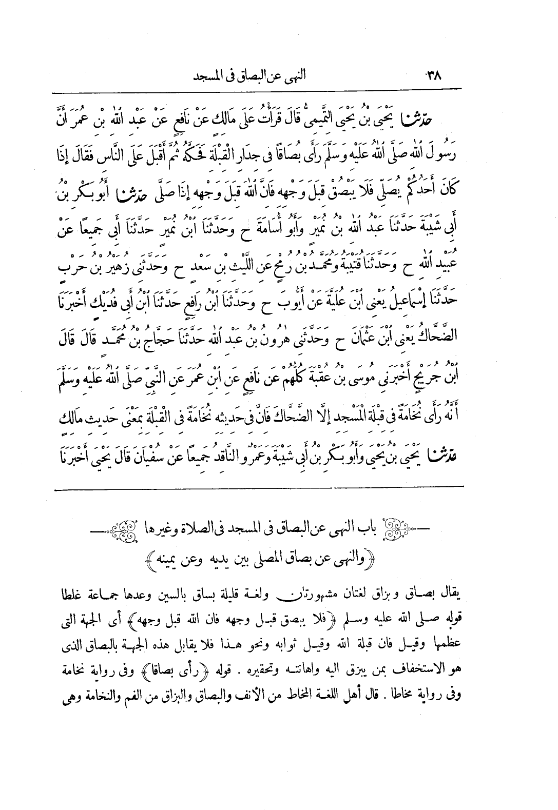 وَالنَّهْيِ عَنْ بُصَاقِ الْمُصَلِّي بَيْنَ يَدَيْهِ وَعَنْ يَمِينِهِ