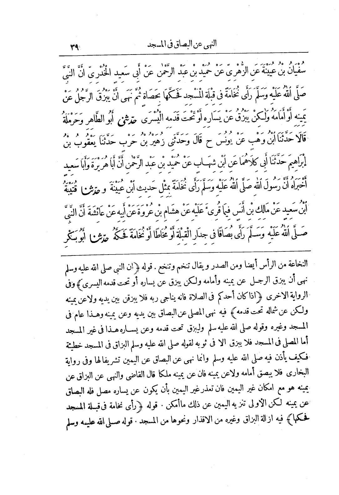 [548] قَوْلُهُ إِنَّ النَّبِيَّ صَلَّى اللَّهُ عَلَيْهِ وَسَلَّمَ نَهَى أَنْ يَبْزُقَ الرَّجُلُ عَنْ يَمِينِهِ وَأَمَامَهُ وَلَكِنْ يَبْزُقُ عَنْ يَسَارِهِ أَوْ تَحْتَ قَدَمِهِ الْيُسْرَى وَفِي الرِّوَايَةِ الْأُخْرَى إِذَا كَانَ أَحَدُكُمْ فِي الصَّلَاةِ فَإِنَّهُ يُنَاجِي رَبَّهُ فَلَا يَبْزُقَنَّ بَيْنَ يَدَيْهِ وَلَا عَنْ يَمِينِهِ وَلَكِنْ عَنْ شِمَالِهِ تَحْتَ قَدَمِهِ فِيهِ نَهْيُ الْمُصَلِّي عَنِ الْبُصَاقِ بَيْنَ يَدَيْهِ وَعَنْ يَمِينِهِ وَهَذَا عَامٌّ فِي الْمَسْجِدِ وَغَيْرِهِ وَقَوْلُهُ صَلَّى اللَّهُ عَلَيْهِ وَسَلَّمَ وَلْيَبْزُقْ تَحْتَ قَدَمِهِ وَعَنْ يَسَارِهِ هَذَا فِي غَيْرِ الْمَسْجِدِ أَمَّا الْمُصَلِّي فِي الْمَسْجِدِ فَلَا يَبْزُقْ إِلَّا فِي ثَوْبِهِ لِقَوْلِهِ صَلَّى اللَّهُ عَلَيْهِ وَسَلَّمَ الْبُزَاقُ فِي الْمَسْجِدِ خَطِيئَةٌ فَكَيْفَ يَأْذَنُ فِيهِ صَلَّى اللَّهُ عَلَيْهِ وَسَلَّمَ وَإِنَّمَا نَهَى عَنِ الْبُصَاقِ عَنِ الْيَمِينِ تَشْرِيفًا لَهَا وَفِي رِوَايَةِ الْبُخَارِيِّ فَلَا يَبْصُقْ أَمَامَهُ وَلَا عَنْ يَمِينِهِ فَإِنَّ عَنْ يَمِينِهِ مَلَكًا قَالَ الْقَاضِي وَالنَّهْيُ عَنِ الْبُزَاقِ عن يمينه هو مع امكان غير اليمين فَإِنْ تَعَذَّرَ غَيْرُ الْيَمِينِ بِأَنْ يَكُونَ عَنْ يَسَارِهِ مُصَلٍّ فَلَهُ الْبُصَاقُ عَنْ يَمِينِهِ لَكِنِ الْأَوْلَى تَنْزِيهُ الْيَمِينِ عَنْ ذَلِكِ مَا أَمْكَنَ قَوْلُهُ رَأَى نُخَامَةً فِي قِبْلَةِ الْمَسْجِدِ فَحَكَّهَا فِيهِ إِزَالَةُ الْبُزَاقِ وَغَيْرِهِ مِنَ الْأَقْذَارِ وَنَحْوِهَا مِنَ الْمَسْجِدِ قَوْلُهُ صَلَّى اللَّهُ عَلَيْهِ وَسَلَّمَ
