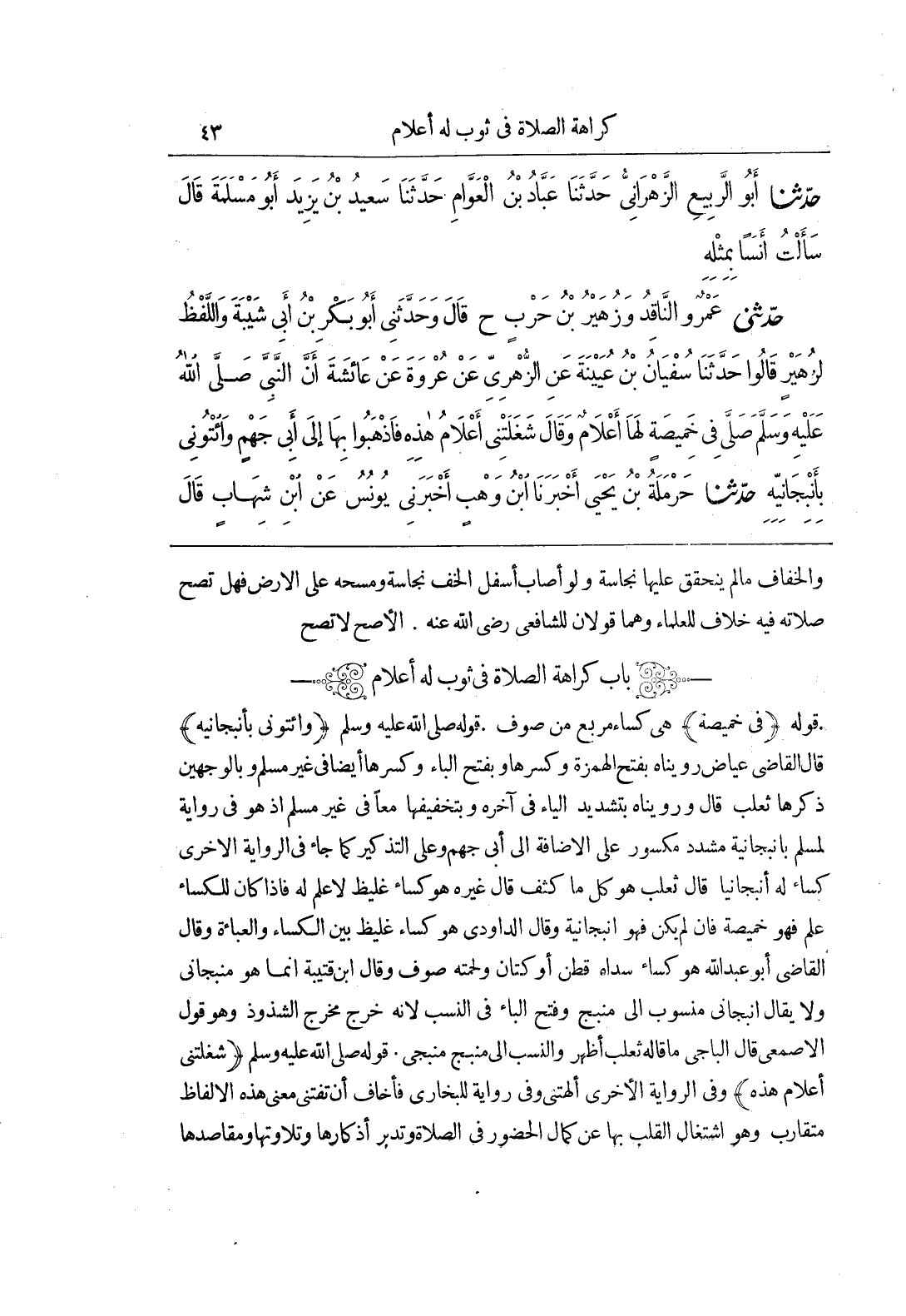 [556] قَوْلُهُ فِي خَمِيصَةٍ هِيَ كِسَاءٌ مُرَبَّعٌ مِنْ صُوفٍ قَوْلُهُ صَلَّى اللَّهُ عَلَيْهِ وَسَلَّمَ وأتوني بِأَنْبِجَانِيَّة قَالَ الْقَاضِي عِيَاضٌ رَوَيْنَاهُ بِفَتْحِ الْهَمْزَةِ وَكَسْرِهَا وَبِفَتْحِ الْبَاءِ وَكَسْرِهَا أَيْضًا فِي غَيْرِ مُسْلِمٍ وَبِالْوَجْهَيْنِ ذَكَرَهَا ثَعْلَبٌ قَالَ وَرَوَيْنَاهُ بِتَشْدِيدِ الْيَاءِ فِي آخِرِهِ وَبِتَخْفِيفِهَا مَعًا فِي غَيْرِ مُسْلِمٍ إِذْ هُوَ فِي رِوَايَةٍ لِمُسْلِمٍ بِأَنْبِجَانِيَّةٍ مُشَدَّدٌ مَكْسُورٌ عَلَى الْإِضَافَةِ إِلَى أَبِي جَهْمٍ وَعَلَى التَّذْكِيرِ كَمَا جَاءَ فِي الرِّوَايَةِ الْأُخْرَى كِسَاءً لَهُ أَنْبِجَانِيًّا قَالَ ثَعْلَبٌ هُوَ كُلُّ مَا كَثُفَ قَالَ غَيْرُهُ هُوَ كِسَاءٌ غَلِيظٌ لَا عَلَمَ لَهُ فَإِذَا كَانَ لِلْكِسَاءِ عَلَمٌ فَهُوَ خَمِيصَةٌ فَإِنْ لَمْ يَكُنْ فَهُوَ أَنْبِجَانِيَّةٌ وَقَالَ الدَّاوُدِيُّ هُوَ كِسَاءٌ غَلِيظٌ بَيْنَ الْكِسَاءِ وَالْعَبَاءَةِ وَقَالَ الْقَاضِي أَبُو عَبْدِ اللَّهِ هُوَ كِسَاءٌ سَدَاهُ قُطْنٌ أَوْ كَتَّانٌ وَلُحْمَتُهُ صُوفٌ وقال بن قُتَيْبَةَ إِنَّمَا هُوَ مَنْبَجَانِيٌّ وَلَا يُقَالُ أَنْبِجَانِيٌّ مَنْسُوبٌ إِلَى مَنْبِجٍ وَفَتْحِ الْبَاءِ فِي النَّسَبِ لِأَنَّهُ خَرَجَ مَخْرَجَ الشُّذُوذِ وَهُوَ قَوْلُ الْأَصْمَعِيِّ قَالَ الْبَاجِيُّ مَا قَالَهُ ثَعْلَبٌ أَظْهَرُ وَالنَّسَبُ إِلَى مَنْبِجٍ مَنْبَجِيُّ قَوْلُهُ صَلَّى اللَّهُ عَلَيْهِ وَسَلَّمَ شَغَلَتْنِي أَعْلَامُ هَذِهِ وَفِي الرِّوَايَةِ الْأُخْرَى أَلْهَتْنِي وَفِي رِوَايَةٍ لِلْبُخَارِيِّ فَأَخَافُ أَنْ تَفْتِنِّي مَعْنَى هَذِهِ الْأَلْفَاظِ مُتَقَارِبٌ وَهُوَ اشْتِغَالُ الْقَلْبِ بِهَا عَنْ كَمَالِ الْحُضُورِ فِي الصَّلَاةِ وَتَدَبُّرِ أَذْكَارِهَا وَتِلَاوَتِهَا وَمَقَاصِدِهَا