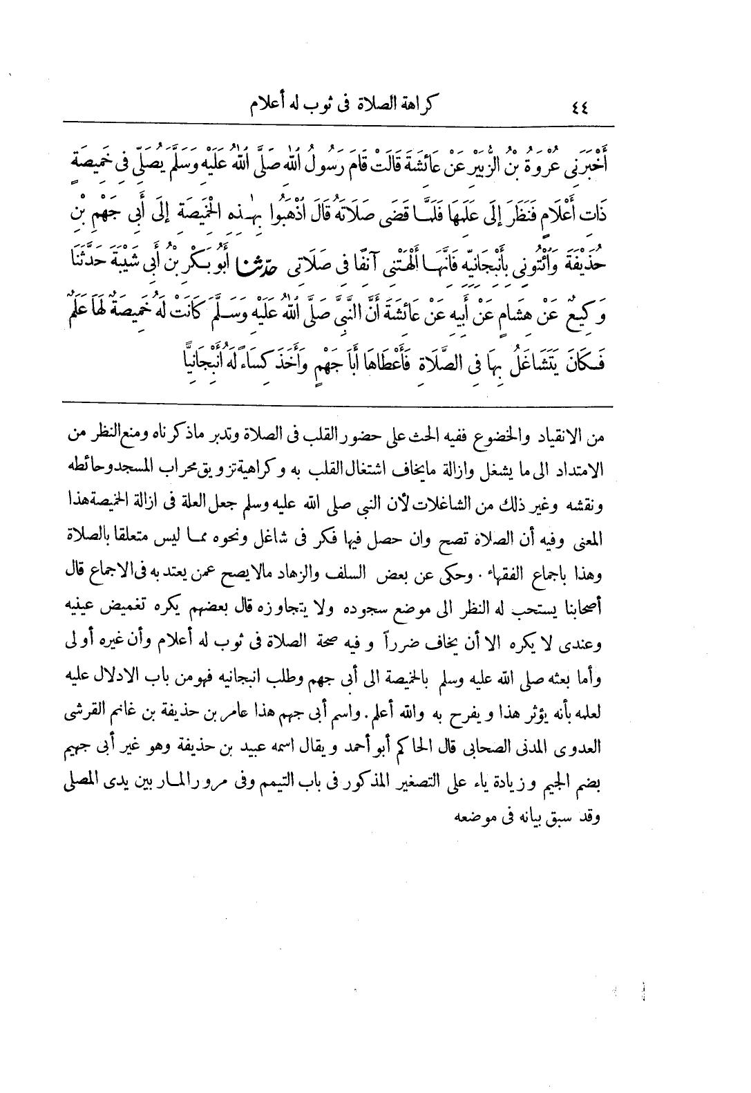مِنَ الِانْقِيَادِ وَالْخُضُوعِ فَفِيهِ الْحَثُّ عَلَى حُضُورِ الْقَلْبِ فِي الصَّلَاةِ وَتَدَبُّرِ مَا ذَكَرْنَاهُ وَمَنْعِ النَّظَرِ مِنَ الِامْتِدَادِ إِلَى مَا يَشْغَلُ وَإِزَالَةِ مَا يَخَافُ اشْتِغَالَ الْقَلْبِ بِهِ وَكَرَاهِيَةِ تَزْوِيقِ مِحْرَابِ الْمَسْجِدِ وَحَائِطِهِ وَنَقْشِهِ وَغَيْرِ ذَلِكَ مِنَ الشَّاغِلَاتِ لِأَنَّ النَّبِيَّ صَلَّى اللَّهُ عَلَيْهِ وَسَلَّمَ جَعَلَ الْعِلَّةَ فِي إِزَالَةِ الْخَمِيصَةِ هَذَا الْمَعْنَى وَفِيهِ أَنَّ الصَّلَاةَ تَصِحُّ وَإِنْ حَصَلَ فِيهَا فِكْرٌ فِي شَاغِلٍ وَنَحْوِهِ مِمَّا لَيْسَ مُتَعَلِّقًا بِالصَّلَاةِ وَهَذَا بِإِجْمَاعِ الْفُقَهَاءِ وَحُكِيَ عَنْ بَعْضِ السَّلَفِ وَالزُّهَّادِ مَا لَا يَصِحُّ عَمَّنْ يُعْتَدُّ بِهِ فِي الْإِجْمَاعِ قَالَ أَصْحَابُنَا يُسْتَحَبُّ لَهُ النَّظَرُ إِلَى مَوْضِعِ سُجُودِهِ وَلَا يَتَجَاوَزُهُ قَالَ بَعْضُهُمْ يُكْرَهُ تَغْمِيضُ عَيْنَيْهِ وَعِنْدِي لَا يُكْرَهُ إِلَّا أَنْ يَخَافَ ضَرَرًا وَفِيهِ صِحَّةُ الصَّلَاةِ فِي ثَوْبٍ لَهُ أَعْلَامٌ وَأَنَّ غَيْرَهُ أَوْلَى وَأَمَّا بَعْثُهُ صَلَّى اللَّهُ عَلَيْهِ وَسَلَّمَ بِالْخَمِيصَةِ إِلَى أَبِي جَهْمٍ وَطَلَبِ أَنْبِجَانِيَّةٍ فَهُوَ مِنْ بَابِ الْإِدْلَالِ عَلَيْهِ لِعِلْمِهِ بِأَنَّهُ يُؤْثِرُ هَذَا وَيَفْرَحُ بِهِ وَاللَّهُ أَعْلَمُ وَاسْمُ أَبِي جَهْمٍ هَذَا عَامِرُ بْنُ حُذَيْفَةَ بْنِ غَانِمٍ الْقُرَشِيُّ الْعَدَوِيُّ الْمَدَنِيُّ الصَّحَابِيُّ قَالَ الْحَاكِمُ أَبُو أَحْمَدَ وَيُقَالُ اسْمُهُ عُبَيْدُ بْنُ حُذَيْفَةَ وَهُوَ غَيْرُ أَبِي جُهَيْمٍ بِضَمِّ الْجِيمِ وَزِيَادَةُ يَاءٍ عَلَى التَّصْغِيرِ الْمَذْكُورِ فِي بَابِ التَّيَمُّمِ وَفِي مُرُورِ الْمَارِّ بَيْنَ يَدَيِ الْمُصَلِّي وَقَدْ سَبَقَ بَيَانُهُ في موضعه