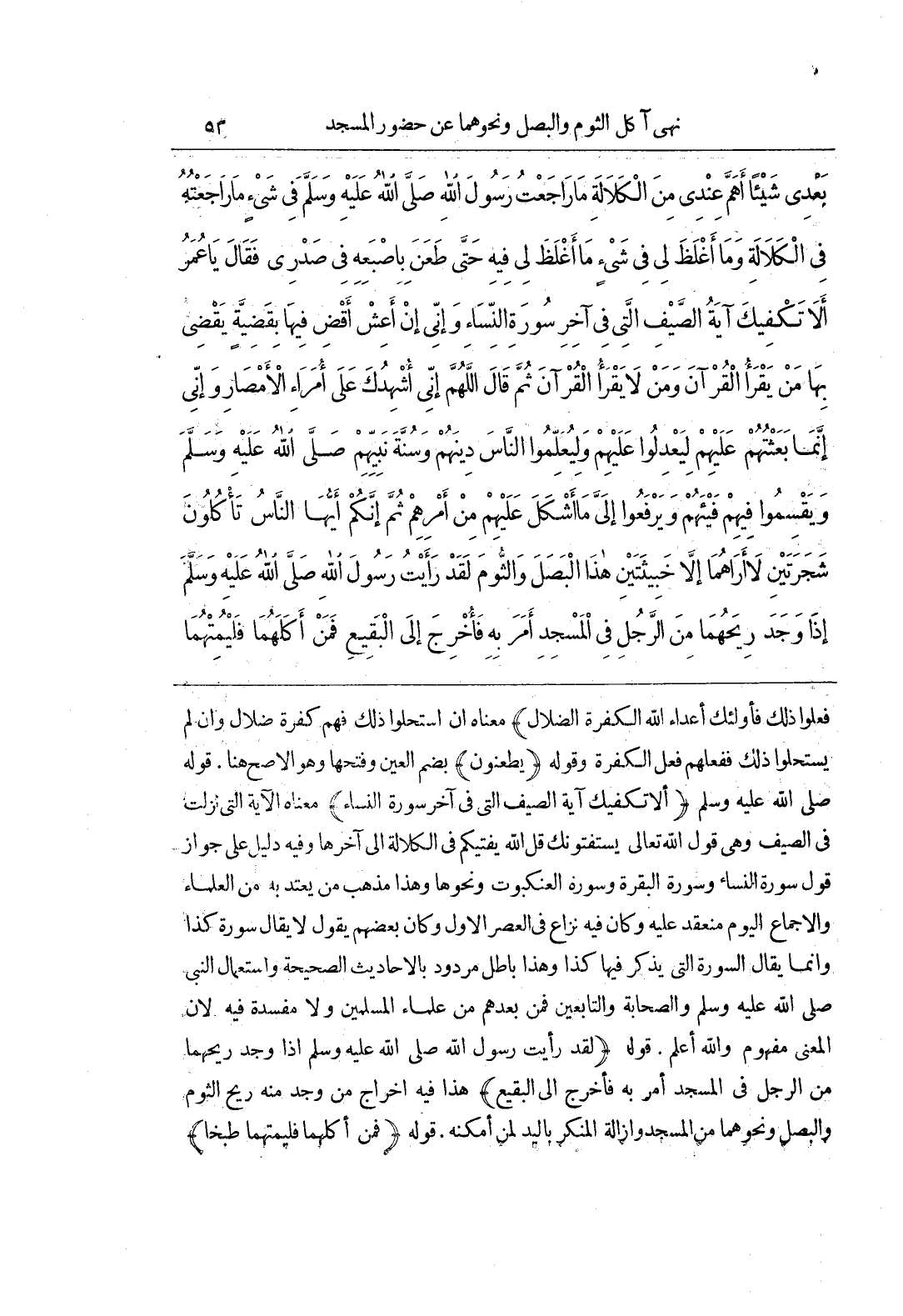 فَعَلُوا ذَلِكَ فَأُولَئِكَ أَعْدَاءُ اللَّهِ الْكَفَرَةُ الضُّلَّالُ مَعْنَاهُ إِنْ اسْتَحَلُّوا ذَلِكَ فَهُمْ كَفَرَةٌ ضُلَّالٌ وَإِنْ لَمْ يَسْتَحِلُّوا ذَلِكَ فَفِعْلُهُمْ فِعْلُ الْكَفَرَةِ وَقَوْلُهُ يَطْعُنُونَ بِضَمِّ الْعَيْنِ وَفَتْحِهَا وَهُوَ الْأَصَحُّ هُنَا قَوْلُهُ صَلَّى اللَّهُ عَلَيْهِ وَسَلَّمَ أَلَا تَكْفِيكِ آيَةُ الصَّيْفِ الَّتِي فِي آخِرِ سُورَةِ النِّسَاءِ مَعْنَاهُ الْآيَةُ الَّتِي نَزَلَتْ فِي الصَّيْفِ وَهِيَ قَوْلُ اللَّهِ تَعَالَى يَسْتَفْتُونَكَ قُلِ اللَّهُ يفتيكم في الكلالة إِلَى آخِرِهَا وَفِيهِ دَلِيلٌ عَلَى جَوَازِ قَوْلِ سُورَةِ النِّسَاءِ وَسُورَةِ الْبَقَرَةِ وَسُورَةِ الْعَنْكَبُوتِ وَنَحْوِهَا وَهَذَا مَذْهَبُ مَنْ يُعْتَدُّ بِهِ مِنَ الْعُلَمَاءِ وَالْإِجْمَاعُ الْيَوْمَ مُنْعَقِدٌ عَلَيْهِ وَكَانَ فِيهِ نِزَاعٌ فِي الْعَصْرِ الْأَوَّلِ وَكَانَ بَعْضُهُمْ يَقُولُ لَا يقال سورة كذا وإنما يُقَالُ السُّورَةُ الَّتِي يُذْكَرُ فِيهَا كَذَا وَهَذَا بَاطِلٌ مَرْدُودٌ بِالْأَحَادِيثِ الصَّحِيحَةِ وَاسْتِعْمَالِ النَّبِيِّ صَلَّى اللَّهُ عَلَيْهِ وَسَلَّمَ وَالصَّحَابَةِ وَالتَّابِعِينَ فَمَنْ بَعْدَهُمْ مِنْ عُلَمَاءِ الْمُسْلِمِينَ وَلَا مَفْسَدَةَ فِيهِ لِأَنَّ الْمَعْنَى مَفْهُومٌ وَاللَّهُ أَعْلَمُ قَوْلُهُ لَقَدْ رَأَيْتُ رَسُولَ اللَّهِ صَلَّى اللَّهُ عَلَيْهِ وَسَلَّمَ إذا وَجَدَ رِيحَهُمَا مِنَ الرَّجُلِ فِي الْمَسْجِدِ أَمَرَ بِهِ فَأُخْرِجَ إِلَى الْبَقِيعِ هَذَا فِيهِ إِخْرَاجُ مَنْ وُجِدَ مِنْهُ رِيحُ الثَّوْمِ وَالْبَصَلِ وَنَحْوِهِمَا مِنَ الْمَسْجِدِ وَإِزَالَةِ الْمُنْكَرِ بِالْيَدِ لِمَنْ أَمْكَنَهُ قَوْلُهُ فَمَنْ أَكَلَهُمَا فَلْيُمِتْهُمَا طَبْخًا