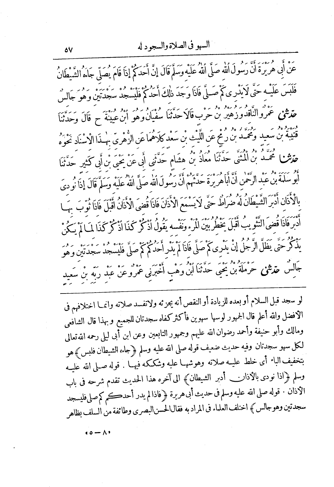 لَوْ سَجَدَ قَبْلَ السَّلَامِ أَوْ بَعْدَهُ لِلزِّيَادَةِ أَوِ النَّقْصِ أَنَّهُ يُجْزِئُهُ وَلَا تَفْسُدُ صَلَاتُهُ وَإِنَّمَا اخْتِلَافُهُمْ فِي الْأَفْضَلِ وَاللَّهُ أَعْلَمُ قَالَ الْجُمْهُورُ لَوْ سَهَا سَهْوَيْنِ فَأَكْثَرَ كَفَاهُ سَجْدَتَانِ لِلْجَمِيعِ وَبِهَذَا قَالَ الشَّافِعِيُّ وَمَالِكٌ وَأَبُو حَنِيفَةَ وَأَحْمَدُ رِضْوَانُ اللَّهِ عَلَيْهِمْ وَجُمْهُورُ التَّابِعِينَ وَعَنِ بن أَبِي لَيْلَى رَحِمَهُ اللَّهُ تَعَالَى لِكُلِّ سَهْوٍ سَجْدَتَانِ وَفِيهِ حَدِيثٌ ضَعِيفٌ قَوْلُهُ جَاءَهُ الشَّيْطَانُ فَلَبَسَ هُوَ بِتَخْفِيفِ الْبَاءِ أَيْ خَلَّطَ عَلَيْهِ صَلَاتَهُ وَهَوَّشَهَا عَلَيْهِ وَشَكَّكَهُ فِيهَا قَوْلُهُ صَلَّى اللَّهُ عَلَيْهِ وَسَلَّمَ إِذَا نُودِيَ بِالْأَذَانِ أَدْبَرَ الشَّيْطَانُ إِلَى آخِرِهِ هَذَا الْحَدِيثُ تَقَدَّمَ شَرْحُهُ فِي بَابِ الْأَذَانِ قَوْلُهُ صَلَّى اللَّهُ عَلَيْهِ وَسَلَّمَ فِي حَدِيثِ أَبِي هُرَيْرَةَ فَإِذَا لَمْ يَدْرِ أَحَدُكُمْ كَمْ صَلَّى فَلْيَسْجُدْ سَجْدَتَيْنِ وَهُوَ جَالِسٌ اخْتَلَفَ الْعُلَمَاءُ فِي الْمُرَادِ بِهِ فَقَالَ الْحَسَنُ الْبَصْرِيُّ وَطَائِفَةٌ مِنَ السَّلَفِ بِظَاهِرِ