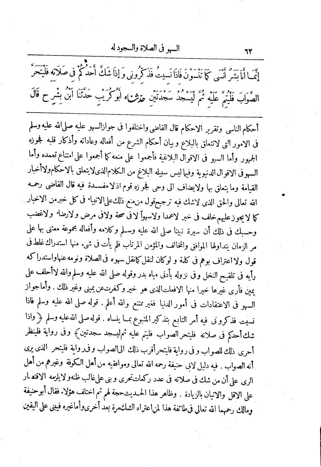 أَحْكَامِ النَّاسِي وَتَقْرِيرُ الْأَحْكَامِ قَالَ الْقَاضِي وَاخْتَلَفُوا فِي جَوَازِ السَّهْوِ عَلَيْهِ صَلَّى اللَّهُ عَلَيْهِ وَسَلَّمَ فِي الْأُمُورِ الَّتِي لَا تَتَعَلَّقُ بِالْبَلَاغِ وَبَيَانِ أَحْكَامِ الشَّرْعِ مِنْ أَفْعَالِهِ وَعَادَاتِهِ وَأَذْكَارِ قَلْبِهِ فَجَوَّزَهُ الْجُمْهُورُ وَأَمَّا السَّهْوُ فِي الْأَقْوَالِ الْبَلَاغِيَّةِ فَأَجْمَعُوا عَلَى مَنْعِهِ كَمَا أَجْمَعُوا عَلَى امْتِنَاعِ تَعَمُّدِهِ وَأَمَّا السَّهْوُ فِي الْأَقْوَالِ الدُّنْيَوِيَّةِ وَفِيمَا لَيْسَ سَبِيلُهُ الْبَلَاغُ مِنَ الْكَلَامِ الَّذِي لَا يَتَعَلَّقُ بِالْأَحْكَامِ وَلَا أَخْبَارِ الْقِيَامَةِ وَمَا يَتَعَلَّقُ بِهَا وَلَا يُضَافُ إِلَى وَحْيٍ فَجَوَّزَهُ قَوْمٌ إِذْ لَا مَفْسَدَةَ فِيهِ قَالَ الْقَاضِي رَحِمَهُ اللَّهُ تَعَالَى وَالْحَقُّ الَّذِي لَا شَكَّ فِيهِ تَرْجِيحُ قَوْلِ مَنْ مَنَعَ ذَلِكَ عَلَى الْأَنْبِيَاءِ فِي كُلِّ خَبَرٍ مِنَ الْأَخْبَارِ كَمَا لَا يَجُوزُ عَلَيْهِمْ خُلْفٌ فِي خَبَرٍ لَا عَمْدًا وَلَا سَهْوًا لَا فِي صِحَّةٍ وَلَا في مرض ولارضاء وَلَا غَضَبٍ وَحَسْبُكَ فِي ذَلِكَ أَنَّ سِيرَةَ نَبِيِّنَا صَلَّى اللَّهُ عَلَيْهِ وَسَلَّمَ وَكَلَامَهُ وَأَفْعَالَهُ مَجْمُوعَةٌ مُعْتَنًى بِهَا عَلَى مَرِّ الزَّمَانِ يَتَدَاوَلُهَا الْمُوَافِقُ وَالْمُخَالِفُ وَالْمُؤْمِنُ وَالْمُرْتَابُ فَلَمْ يَأْتِ فِي شَيْءٍ مِنْهَا اسْتِدْرَاكُ غَلَطٍ فِي قَوْلٍ وَلَا اعْتِرَافٌ بِوَهْمٍ فِي كَلِمَةٍ وَلَوْ كَانَ لَنُقِلَ كَمَا نُقِلَ سَهْوُهُ فِي الصَّلَاةِ وَنَوْمُهُ عَنْهَا وَاسْتِدْرَاكُهُ رَأْيَهُ فِي تَلْقِيحِ النَّخْلِ وَفِي نُزُولِهِ بِأَدْنَى مِيَاهِ بَدْرٍ وَقَوْلُهُ صَلَّى اللَّهُ عَلَيْهِ وَسَلَّمَ وَاللَّهِ لَا أَحْلِفُ عَلَى يَمِينٍ فَأَرَى غَيْرَهَا خَيْرًا مِنْهَا إِلَّا فَعَلْتُ الَّذِي هُوَ خَيْرٌ وَكَفَّرْتُ عَنْ يَمِينِي وَغَيْرُ ذَلِكَ وَأَمَّا جَوَازُ السَّهْوِ فِي الِاعْتِقَادَاتِ فِي أُمُورِ الدُّنْيَا فَغَيْرُ مُمْتَنِعٍ وَاللَّهُ أَعْلَمُ قَوْلُهُ صَلَّى اللَّهُ عَلَيْهِ وَسَلَّمَ فَإِذَا نَسِيتُ فَذَكِّرُونِي فِيهِ أَمْرُ التَّابِعِ بِتَذْكِيرِ الْمَتْبُوعِ بِمَا يَنْسَاهُ قَوْلُهُ صَلَّى اللَّهُ عَلَيْهِ وَسَلَّمَ وَإِذَا شَكَّ أَحَدُكُمْ فِي صَلَاتِهِ فَلْيَتَحَرَّ الصَّوَابَ فَلْيُتِمَّ عَلَيْهِ ثُمَّ لِيَسْجُدْ سَجْدَتَيْنِ وَفِي رِوَايَةٍ فَلْيَنْظُرْ أَحْرَى ذَلِكَ لِلصَّوَابِ وَفِي رِوَايَةٍ فَلْيَتَحَرَّ أَقْرَبَ ذَلِكَ إِلَى الصَّوَابِ وَفِي رِوَايَةٍ فَلْيَتَحَرَّ الَّذِي يَرَى أَنَّهُ الصَّوَابُ فِيهِ دَلِيلٌ لِأَبِي حَنِيفَةَ رَحِمَهُ اللَّهُ تَعَالَى وَمُوَافِقِيهِ مِنْ أَهْلِ الْكُوفَةِ وَغَيْرِهِمْ مِنْ أَهْلِ الرَّأْي عَلَى أَنَّ مَنْ شَكَّ فِي صَلَاتِهِ فِي عَدَدِ رَكَعَاتٍ تَحَرَّى وَبَنَى عَلَى غَالِبِ ظَنِّهِ وَلَا يَلْزَمُهُ الِاقْتِصَارُ عَلَى الْأَقَلِّ وَالْإِتْيَانُ بِالزِّيَادَةِ وَظَاهِرُ هَذَا الْحَدِيثِ حُجَّةٌ لَهُمْ ثُمَّ اخْتَلَفَ هَؤُلَاءِ فَقَالَ أَبُو حَنِيفَةَ وَمَالِكٌ رَحِمَهُمَا اللَّهُ تَعَالَى فِي طَائِفَةٍ هَذَا لِمَنِ اعْتَرَاهُ الشَّكُّ مَرَّةً بَعْدَ أُخْرَى وَأَمَّا غَيْرُهُ فَيَبْنِي على اليقين
