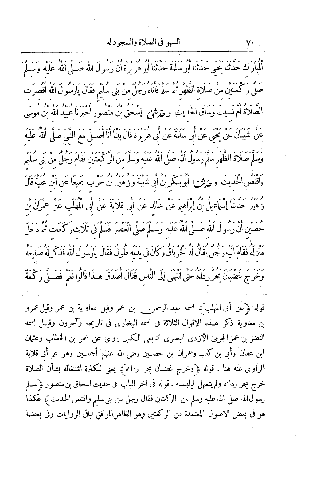 [574] قَوْلُهُ عَنْ أَبِي الْمُهَلَّبِ اسْمُهُ عَبْدُ الرَّحْمَنِ بْنُ عُمَرَ وَقِيلَ مُعِاوِيَةُ بْنُ عُمَرَ وَقِيلَ عَمْرُو بْنُ مُعَاوِيَةَ ذَكَرَ هَذِهِ الْأَقْوَاْلَ الثَّلَاثَةَ فِي اسْمِهِ الْبُخَارِيُّ فِي تَارِيخِهِ وَآخَرُونَ وَقِيلَ اسْمُهُ النَّضْرُ بْنُ عُمَرَ الْجَرْمِيُّ الْأَزْدِيُّ الْبَصْرِيُّ التَّابِعِيُّ الْكَبِيرُ رَوَى عَنْ عُمَرَ بْنِ الْخَطَّابِ وَعُثْمَانَ بْنِ عَفَّانَ وَأُبَيِّ بْنِ كَعْبٍ وَعِمْرَانَ بْنِ حُصَيْنٍ رَضِيَ اللَّهُ عَنْهُمْ أَجْمَعِينَ وَهُوَ عَمُّ أَبِي قِلَابَةَ الرَّاوِي عَنْهُ هُنَا قَوْلُهُ وَخَرَجَ غَضْبَانَ يَجُرُّ رِدَاءَهُ يَعْنِي لِكَثْرَةِ اشْتِغَالِهِ بِشَأْنِ الصَّلَاةِ خَرَجَ يَجُرُّ رِدَاءَهُ وَلَمْ يَتَمَهَّلْ لِيَلْبَسَهُ قَوْلُهُ فِي آخِرِ الْبَابِ فِي حَدِيثِ إِسْحَاقَ بْنِ مَنْصُورٍ سَلَّمَ رَسُولُ اللَّهِ صَلَّى اللَّهُ عَلَيْهِ وَسَلَّمَ مِنَ الرَّكْعَتَيْنِ فَقَالَ رَجُلٌ مِنْ بَنِي سَلِيمٍ وَاقْتَصَّ الْحَدِيثَ هَكَذَا هُوَ فِي بَعْضِ الْأُصُولِ الْمُعْتَمَدَةِ مِنَ الرَّكْعَتَيْنِ وَهُوَ الظَّاهِرُ الْمُوَافِقُ لِبَاقِي الرِّوَايَاتِ وَفِي بَعْضِهَا