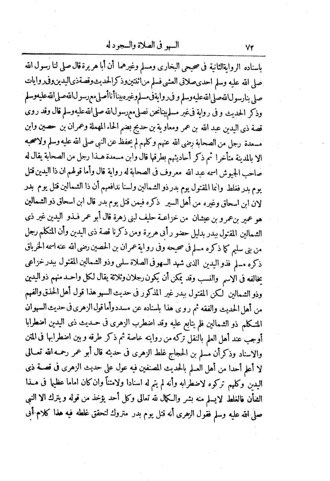 بِإِسْنَادِهِ الرِّوَايَةَ الثَّانِيَةَ فِي صَحِيحَيِ الْبُخَارِيِّ وَمُسْلِمٍ وَغَيْرِهِمَا أَنَّ أَبَا هُرَيْرَةَ قَالَ صَلَّى لَنَا رَسُولُ اللَّهِ صَلَّى اللَّهُ عَلَيْهِ وَسَلَّمَ إِحْدَى صلاتي العشي فسلم من اثنتين وَذَكَرَ الْحَدِيثَ وَقِصَّةَ ذِي الْيَدَيْنِ وَفِي رِوَايَاتٍ صَلَّى بِنَا رَسُولُ اللَّهِ صَلَّى اللَّهُ عَلَيْهِ وسلم وفي رواية في مُسْلِمٍ وَغَيْرِهِ بَيْنَا أَنَا أُصَلِّي مَعَ رَسُولِ اللَّهِ صَلَّى اللَّهُ عَلَيْهِ وَسَلَّمَ وَذَكَرَ الْحَدِيثَ وفي رواية في غير مُسْلِمٍ بَيْنَا نَحْنُ نُصَلِّي مَعَ رَسُولِ اللَّهِ صَلَّى اللَّهُ عَلَيْهِ وَسَلَّمَ قَالَ وَقَدْ رَوَى قِصَّةَ ذِي الْيَدَيْنِ عَبْدُ اللَّهِ بْنُ عُمَرَ وَمُعَاوِيَةُ بْنُ حُدَيْجٍ بِضَمِّ الْحَاءِ الْمُهْمَلَةِ وَعِمْرَانُ بن حصين وبن مَسْعَدَةَ رَجُلٌ مِنَ الصَّحَابَةِ رَضِيَ اللَّهُ عَنْهُمْ وَكُلُّهُمْ لَمْ يَحْفَظْ عَنِ النَّبِيِّ صَلَّى اللَّهُ عَلَيْهِ وَسَلَّمَ وَلَا صَحِبَهُ إِلَّا بِالْمَدِينَةِ مُتَأَخِّرًا ثم ذكر أحاديثهم بطرقها قال وبن مَسْعَدَةَ هَذَا رَجُلٌ مِنَ الصَّحَابَةِ يُقَالُ لَهُ صَاحِبُ الْجُيُوشِ اسْمُهُ عَبْدُ اللَّهِ مَعْرُوفٌ فِي الصَّحَابَةِ لَهُ رِوَايَةٌ قَالَ وَأَمَّا قَوْلُهُمْ إِنَّ ذَا الْيَدَيْنِ قُتِلَ يَوْمَ بَدْرٍ فَغَلَطٌ وَإِنَّمَا الْمَقْتُولُ يَوْمَ بَدْرٍ ذُو الشِّمَالَيْنِ وَلَسْنَا نُدَافِعُهُمْ أَنَّ ذَا الشِّمَالَيْنِ قُتِلَ يَوْمَ بَدْرٍ لِأَنَّ بن إِسْحَاقَ وَغَيْرُهُ مِنْ أَهْلِ السِّيَرِ ذَكَرَهُ فِيمَنْ قتل يوم بدر قال بن إِسْحَاقَ ذُو الشِّمَالَيْنِ هُوَ عُمَيْرُ بْنُ عَمْرِو بْنِ عَيْشَانَ مِنْ خُزَاعَةَ حَلِيفٌ لِبَنِي زُهْرَةَ قَالَ أَبُو عُمَرَ فَذُو الْيَدَيْنِ غَيْرُ ذِي الشِّمَالَيْنِ الْمَقْتُولِ بِبَدْرٍ بِدَلِيلِ حُضُورِ أَبِي هُرَيْرَةَ وَمَنْ ذَكَرْنَا قِصَّةَ ذِي الْيَدَيْنِ وَأَنَّ الْمُتَكَلِّمَ رَجُلٌ مِنْ بَنِي سَلِيمٍ كَمَا ذَكَرَهُ مُسْلِمٌ فِي صَحِيحِهِ وَفِي رِوَايَةِ عِمْرَانَ بْنِ الْحُصَيْنِ رَضِيَ اللَّهُ عَنْهُ اسْمُهُ الْخِرْبَاقُ ذَكَرَهُ مُسْلِمٌ فَذُو الْيَدَيْنِ الَّذِي شَهِدَ السَّهْوَ فِي الصَّلَاةِ سُلَمِيٌّ وَذُو الشِّمَالَيْنِ الْمَقْتُولُ بِبَدْرٍ خُزَاعِيٌّ يُخَالِفُهُ فِي الِاسْمِ وَالنَّسَبِ وَقَدْ يُمْكِنُ أَنْ يَكُونَ رَجُلَانِ وَثَلَاثَةٌ يُقَالُ لِكُلِّ وَاحِدٍ مِنْهُمْ ذُو الْيَدَيْنِ وَذُو الشِّمَالَيْنِ لَكِنَّ الْمَقْتُولَ بِبَدْرٍ غَيْرَ الْمَذْكُورِ فِي حَدِيثِ السَّهْوِ هَذَا قَوْلُ أَهْلِ الْحِذْقِ وَالْفَهْمِ مِنْ أَهْلِ الْحَدِيثِ وَالْفِقْهِ ثُمَّ رُوِيَ هَذَا بِإِسْنَادِهِ عَنْ مُسَدَّدٍ وَأَمَّا قَوْلُ الزهري في حديث السهوان الْمُتَكَلِّمَ ذُو الشِّمَالَيْنِ فَلَمْ يُتَابَعْ عَلَيْهِ وَقَدِ اضْطَرَبَ الزُّهْرِيُّ فِي حَدِيثِ ذِي الْيَدَيْنِ اضْطِرَابًا أَوْجَبَ عِنْدَ أَهْلِ الْعِلْمِ بِالنَّقْلِ تَرْكَهُ مِنْ روايته خاصة ثُمَّ ذَكَرَ طُرُقَهُ وَبَيَّنَ اضْطِرَابَهَا فِي الْمَتْنِ وَالْإِسْنَادِ وَذَكَرَ أَنَّ مُسْلِمَ بْنَ الْحَجَّاجِ غَلَّطَ الزُّهْرِيَّ فِي حَدِيثِهِ قَالَ أَبُو عُمَرَ رَحِمَهُ اللَّهُ تَعَالَى لَا أَعْلَمُ أَحَدًا مِنْ أَهْلِ الْعِلْمِ بِالْحَدِيثِ الْمُصَنَّفِينَ فِيهِ عَوَّلَ عَلَى حَدِيثِ الزُّهْرِيِّ فِي قِصَّةِ ذِي الْيَدَيْنِ وَكُلُّهمْ تَرَكُوهُ لِاضْطِرَابِهِ وَأَنَّهُ لَمْ يَتِمَّ لَهُ إِسْنَادًا وَلَا مَتْنًا وَإِنْ كَانَ إِمَامًا عَظِيمًا فِي هَذَا الشَّأْنِ فَالْغَلَطُ لَا يَسْلَمُ مِنْهُ بَشَرٌ وَالْكَمَالُ لِلَّهِ تَعَالَى وَكُلُّ أَحَدٍ يُؤْخَذُ مِنْ قَوْلِهِ وَيُتْرَكُ إِلَّا النَّبِيُّ صَلَّى اللَّهُ عَلَي